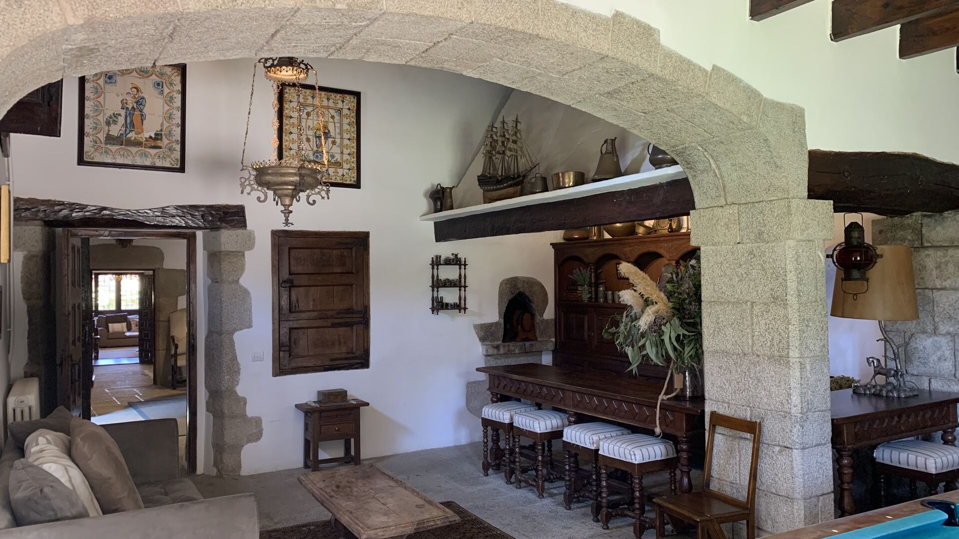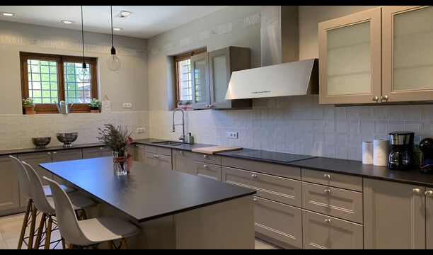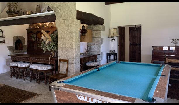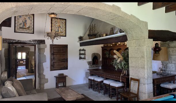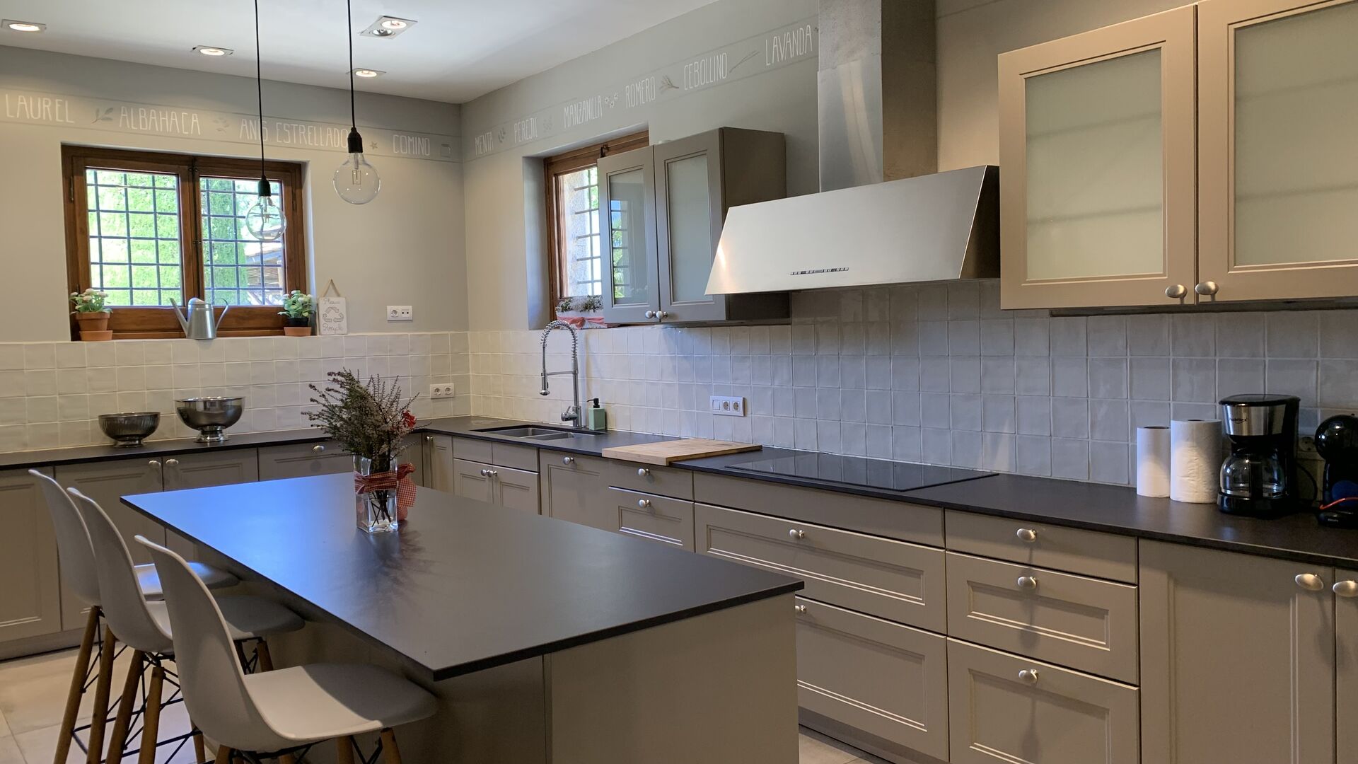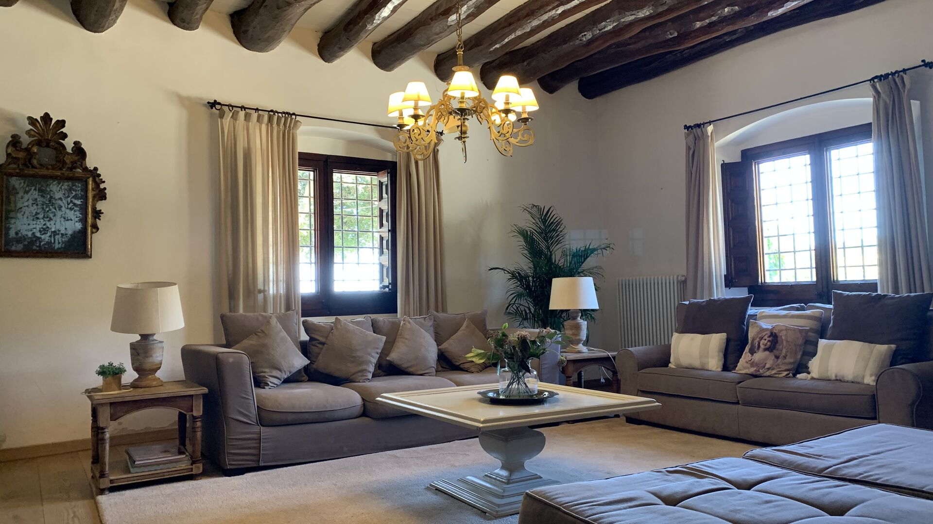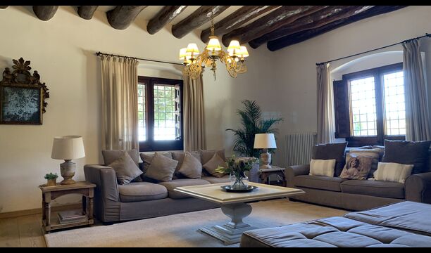 Im Erdgeschoss finden Sie auch die große offene Küche und den Wohnbereich. Die Küche ist neu renoviert und komplett ausgestattet mit allem was man braucht. Es gibt auch einen großen langen Tisch mit Platz für die gesamte Gruppe und einen gemütlichen Wohnbereich mit bequemen Sofas. Es ist ein unglaublich schöner Raum mit wunderschönen Holzbalken an der Decke. In Verlängerung des Wohnzimmers gibt es große Doppeltüren mit Fenstern, die Ihnen einen direkten Zugang zum Poolbereich ermöglichen.