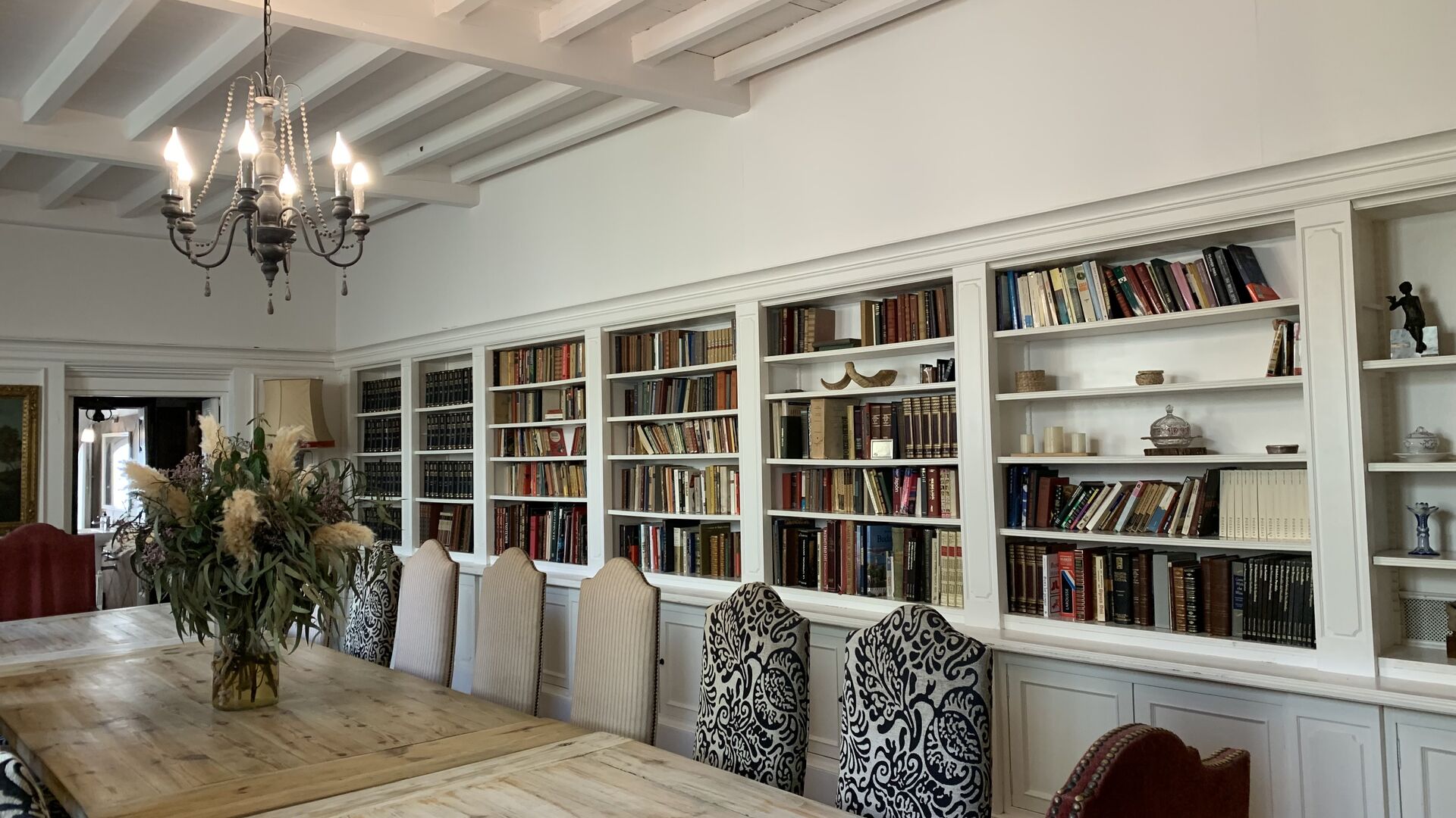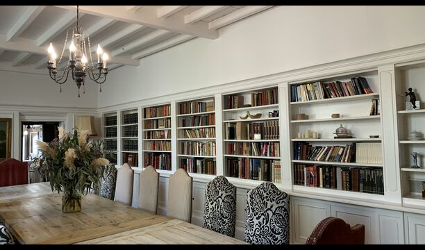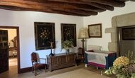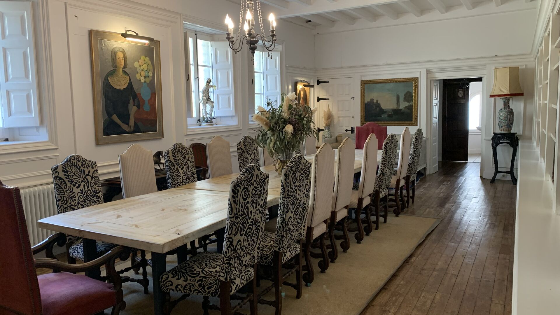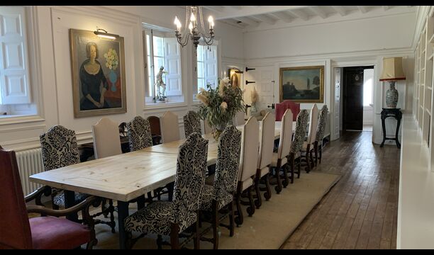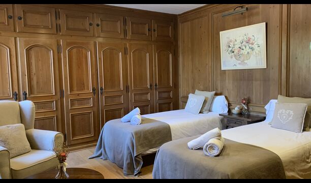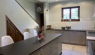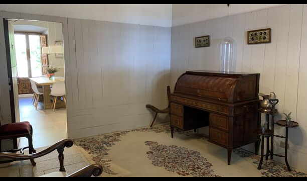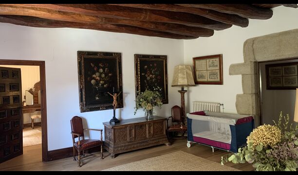 Im Erdgeschoss finden Sie auch die große offene Küche und den Wohnbereich. Die Küche ist neu renoviert und komplett ausgestattet mit allem was man braucht. Es gibt auch einen großen langen Tisch mit Platz für die gesamte Gruppe und einen gemütlichen Wohnbereich mit bequemen Sofas. Es ist ein unglaublich schöner Raum mit wunderschönen Holzbalken an der Decke. In Verlängerung des Wohnzimmers gibt es große Doppeltüren mit Fenstern, die Ihnen einen direkten Zugang zum Poolbereich ermöglichen.