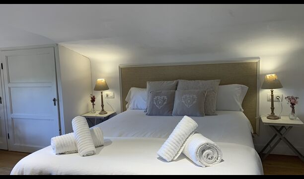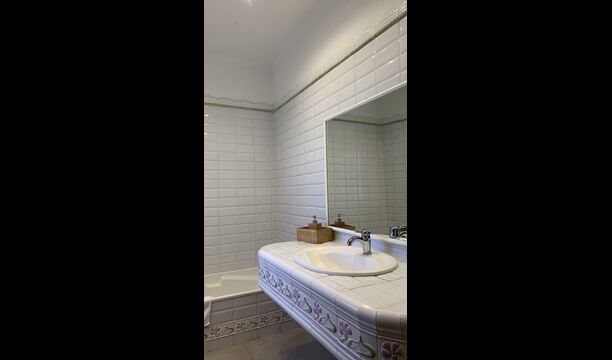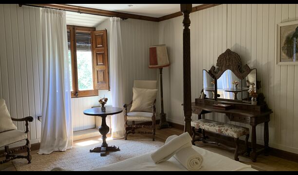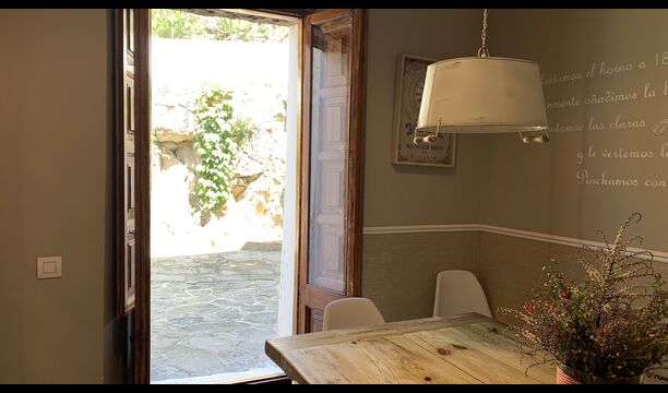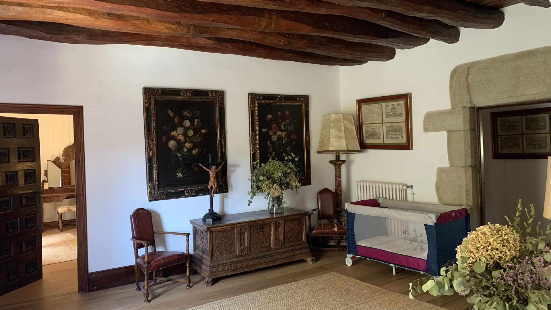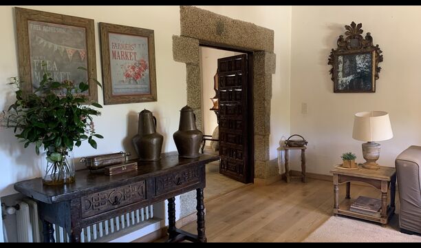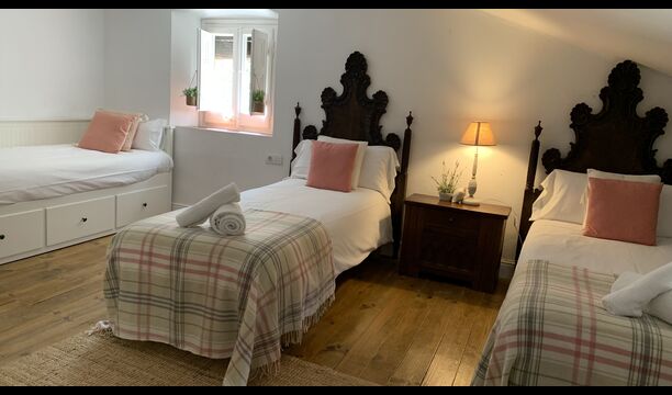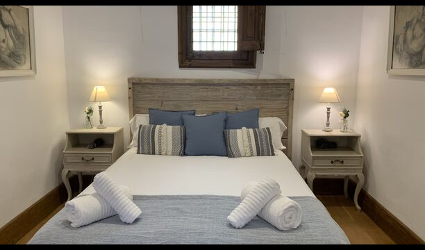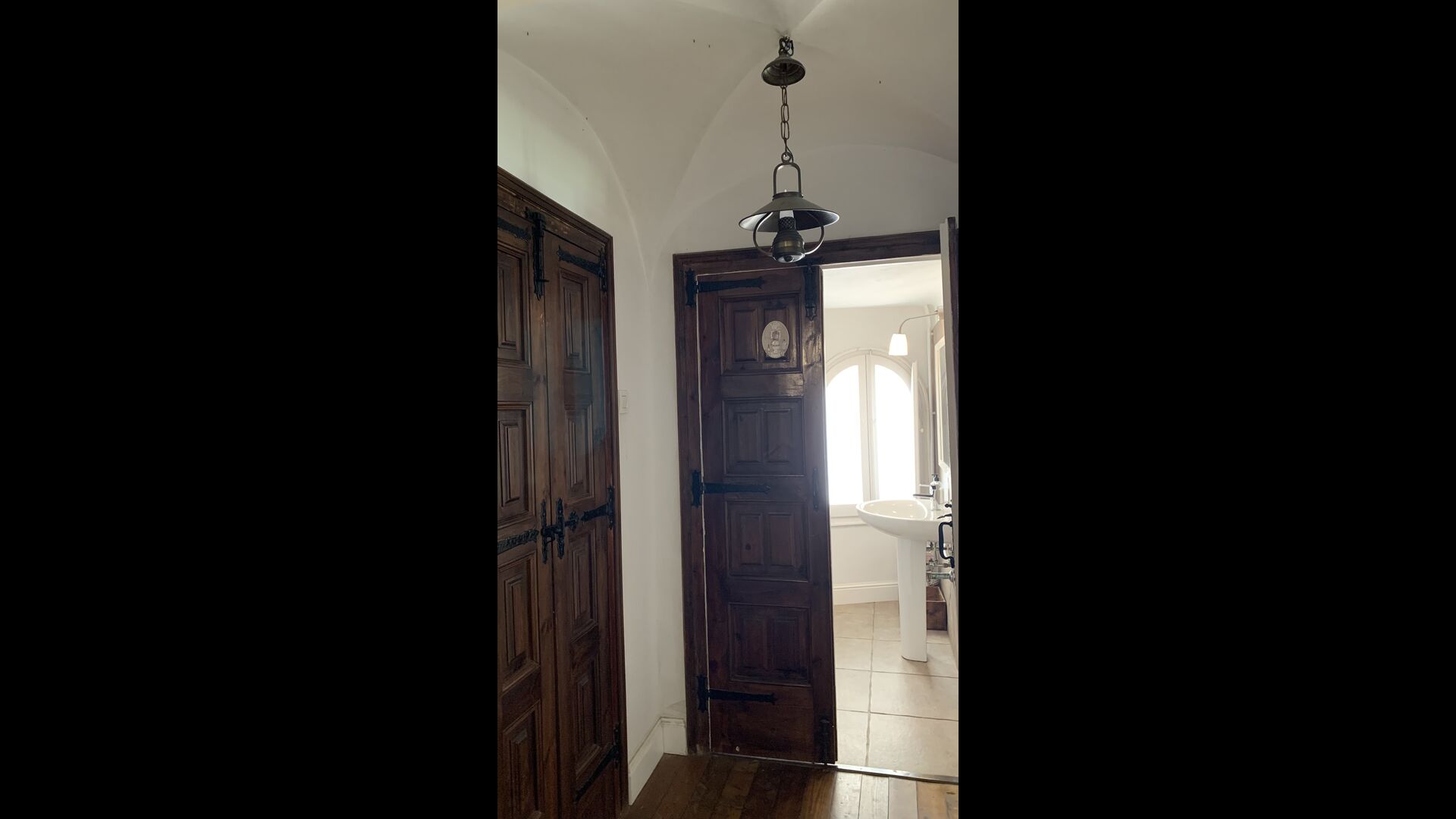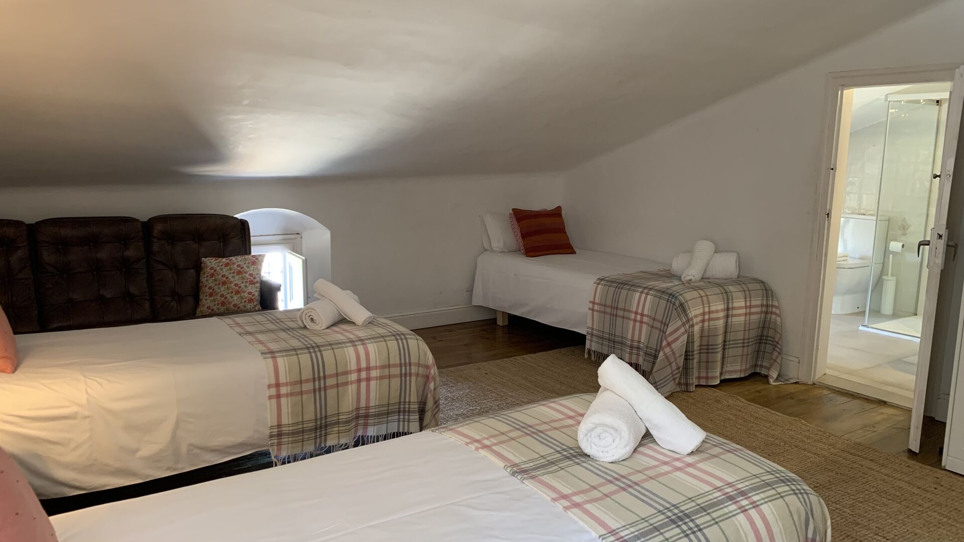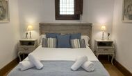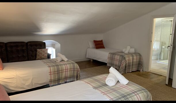 Neben dem Grillplatz befindet sich der Eingang zum Erdgeschoss des Hauses. Das Innere des Hauses wurde schön renoviert, aber natürlich mit Respekt vor der ursprünglichen Architektur des Hauses und seinen vielen wertvollen Details, wie den schönen Bögen und den Holzbalken in der Decke, die erhalten geblieben sind. Hier finden Sie vier große Schlafzimmer. Zwei der Zimmer sind Dreibettzimmer mit einem Doppelbett und einem Einzelbett, und die anderen zwei Zimmer sind Doppelzimmer - eines mit zwei Einzelbetten und das andere mit einem Doppelbett. Die Schlafzimmer teilen sich ein großes Badezimmer im Erdgeschoss.