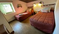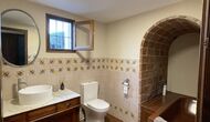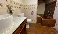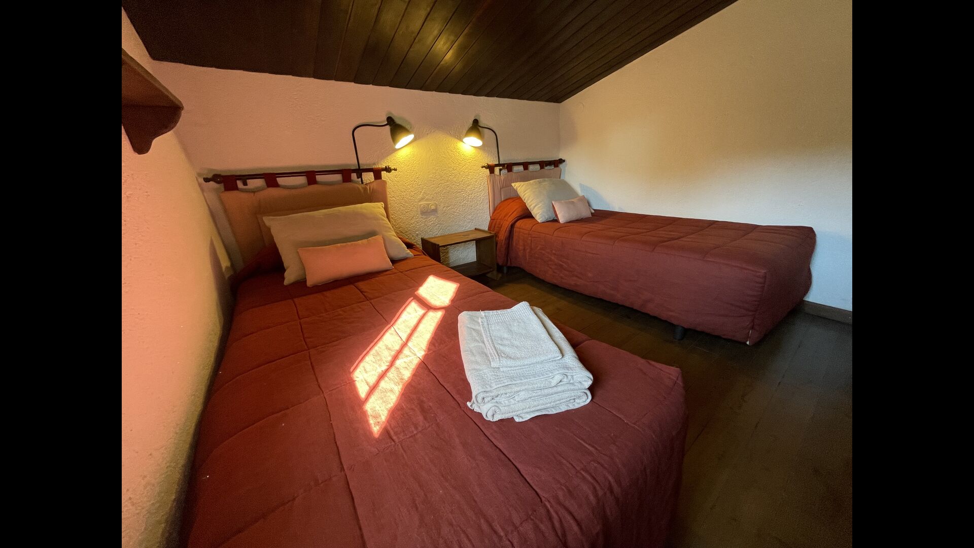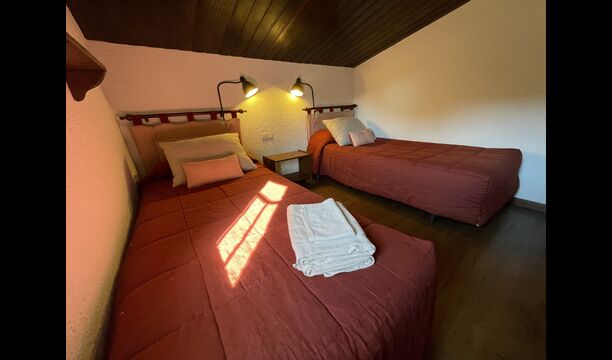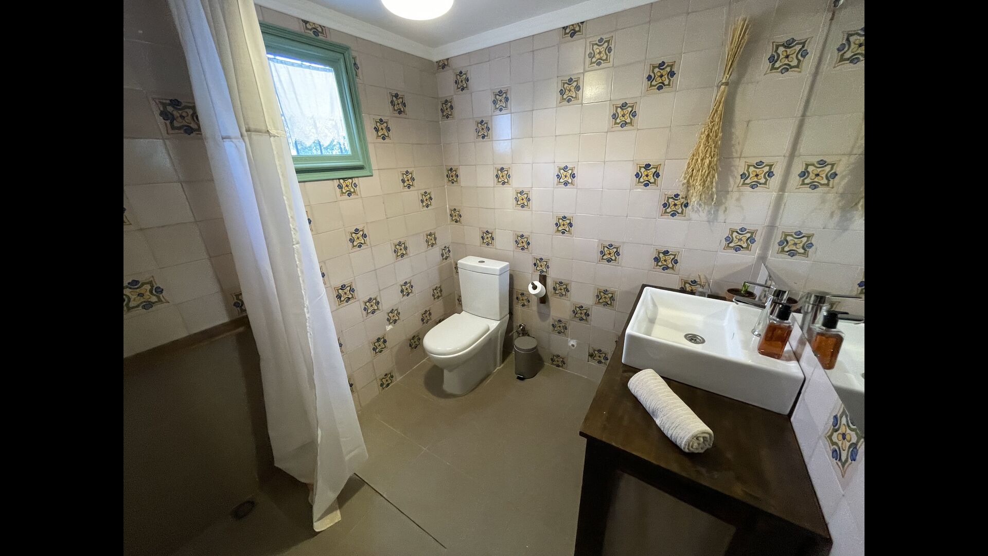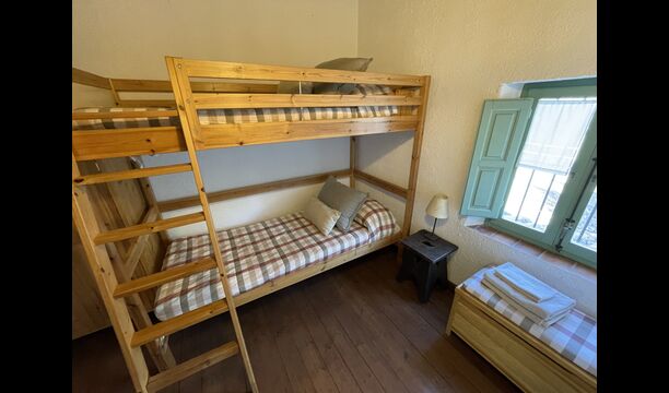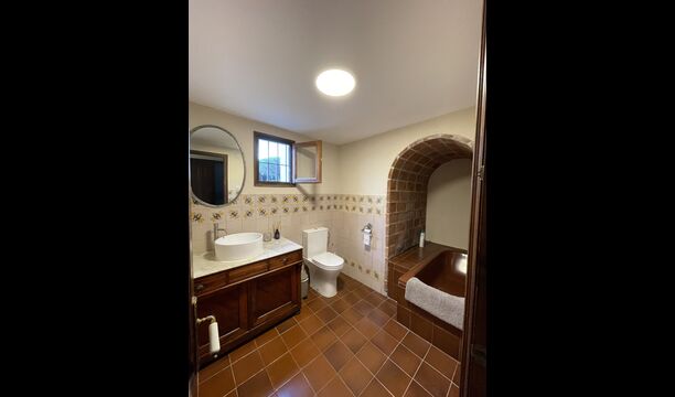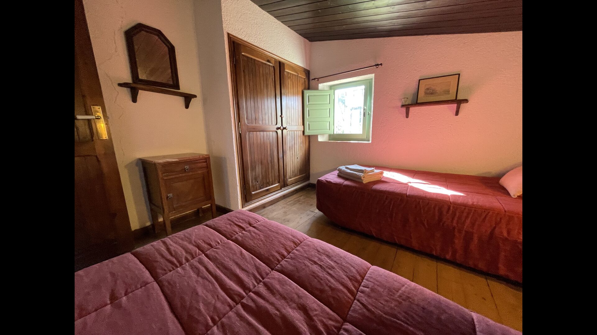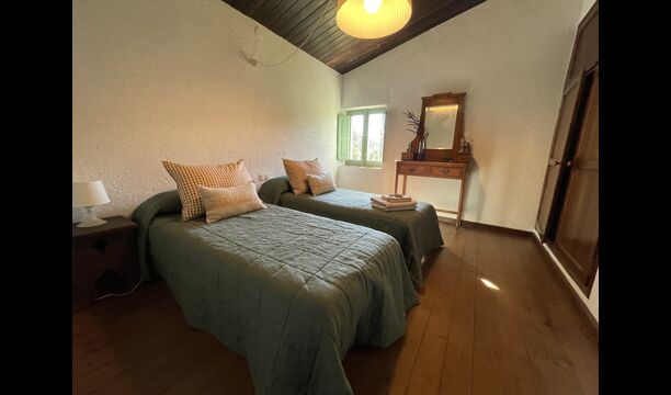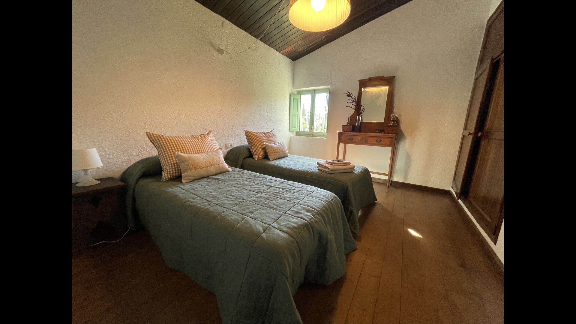 Wenn Sie das Wohnzimmer verlassen, können Sie die Treppe hinaufgehen, die das Wohnzimmer und das Esszimmer trennt. So gelangen Sie in die erste Etage. Hier oben finden Sie einen langen Flur, in dem sich die 6 Schlafzimmer befinden. 3 Schlafzimmer mit Doppelbett, 2 mit Einzelbett und 1 Zimmer mit starkes>Doppelbett (geeignet für ältere Erwachsene und Kinder) – sowie ein Bad mit Badewanne. Es gibt auch ein weiteres Badezimmer mit Dusche.