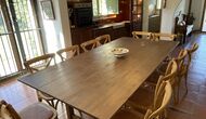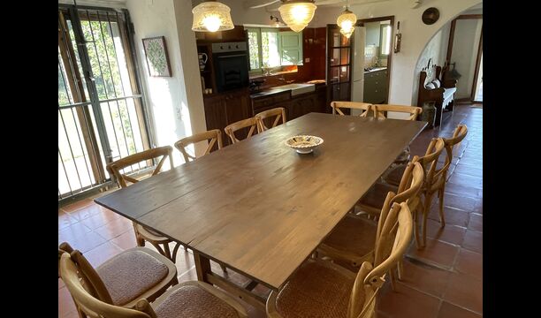 Das Haus besteht aus zwei Etagen – Erdgeschoss und erster Stock – und bietet Platz für 12 Personen. Es gibt 6 Zimmer – alles på erste Stock. Wenn Sie durch die Haupttür im Erdgeschoss eintreten, erwartet Sie ein Eingangsbereich mit viel Platz. Wenn Sie weiter hineingehen, finden Sie das Esszimmer und die Küchen – eine klassische Küche mit einer schönen Verarbeitung sowie eine moderne Küche – direkt nebeneinander. In der modernen Küche gibt es 2 Kühlschränke, vier Gasbrenner mit Dunstabzugshaube und in der klassischen Küche einen Backofen. Hier finden Sie auch die Spülmaschine. Beide Küchen verfügen über eine Spüle. Und neben der klassischen Küche gibt es einen schönen Esstisch, an dem noch Platz ist – für alles, was Sie brauchen. und Stühle für – 12 Personen. Es gibt gute Beleuchtung im Raum – sowohl von der Haupttür, als auch von einer anderen Tür, die ebenfalls zum Garten führt.