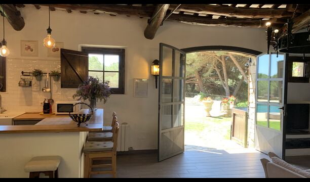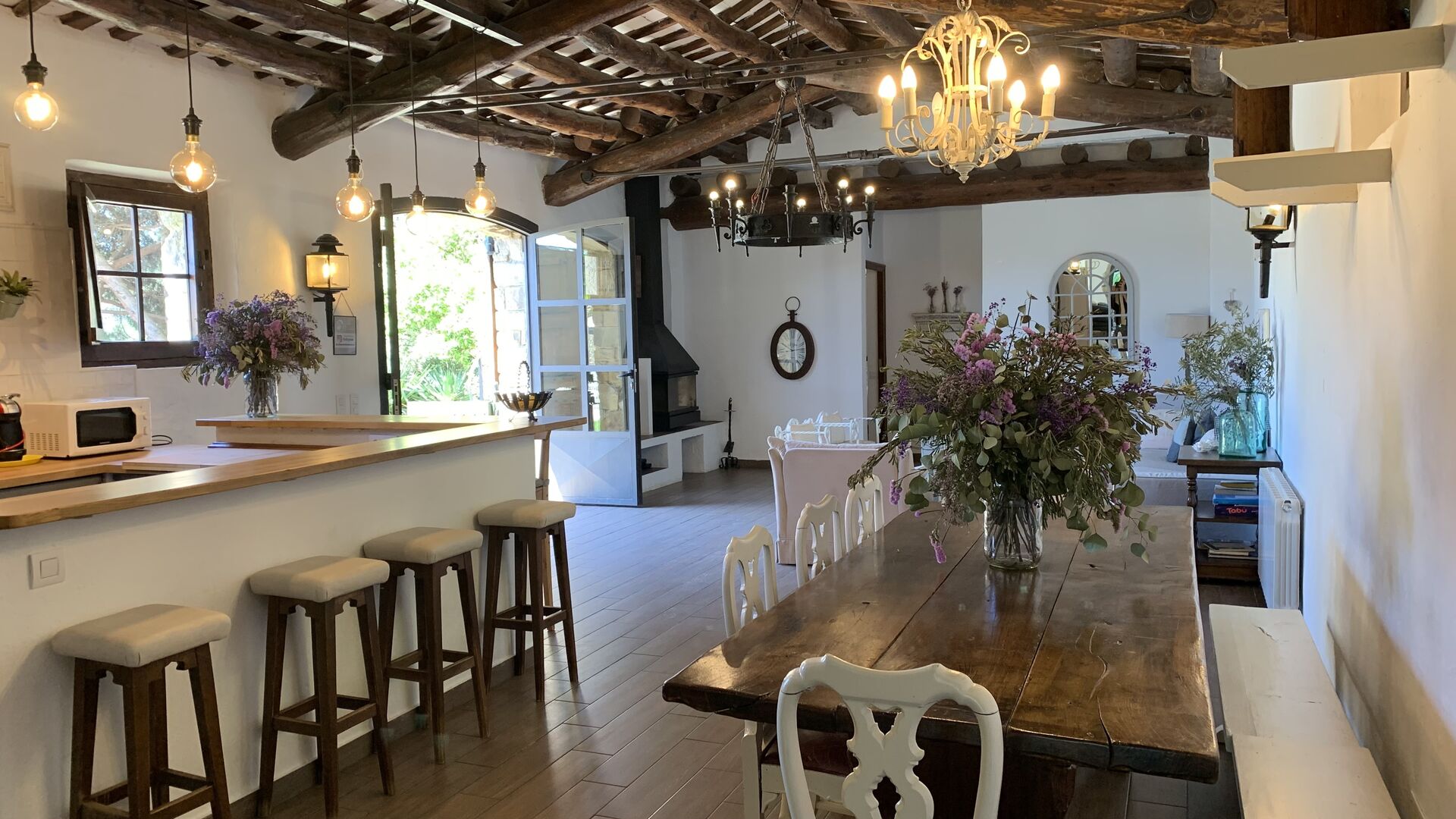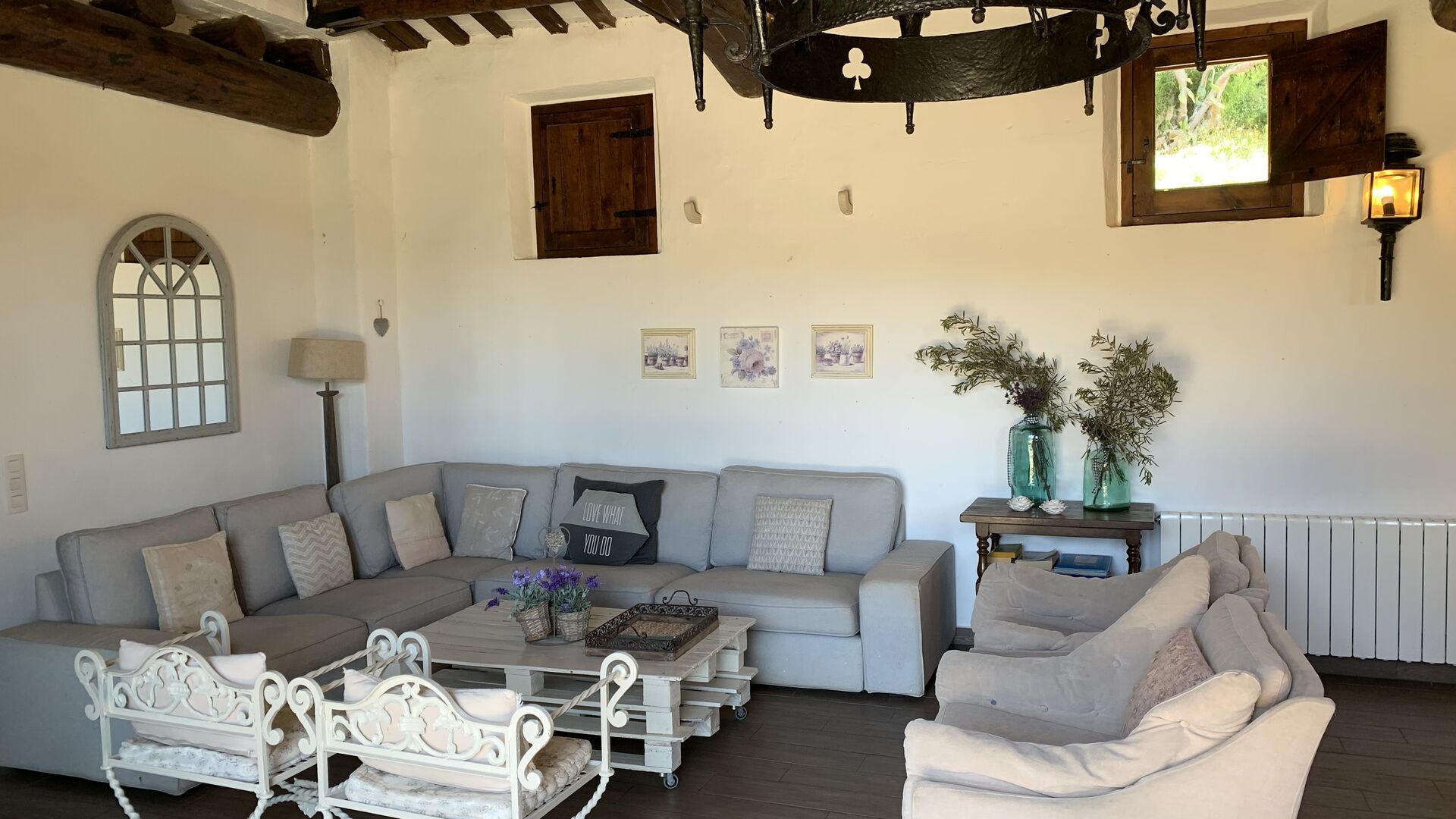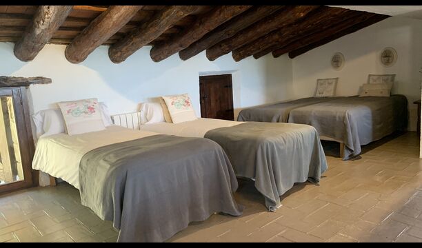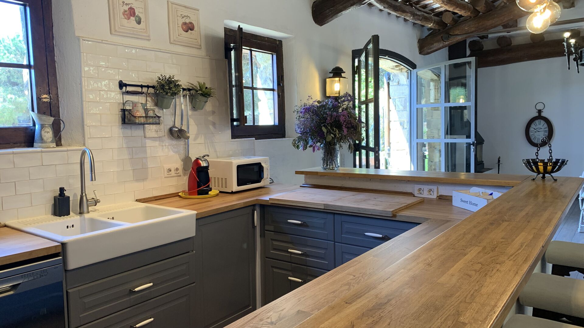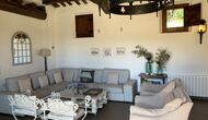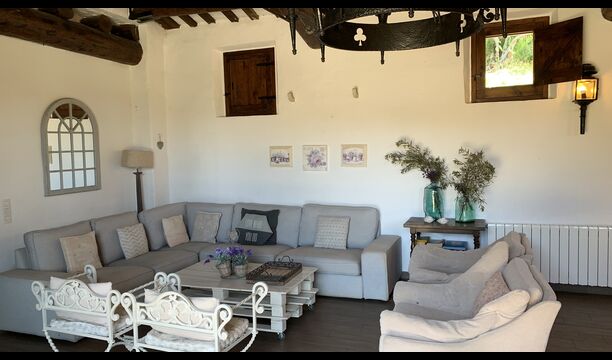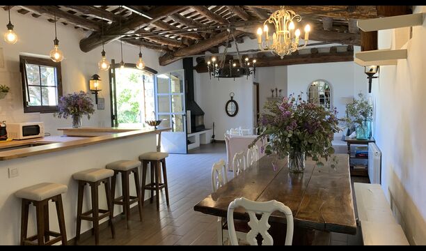 Im Erdgeschoss finden Sie auch die große offene Küche und den Wohnbereich. Die Küche ist neu renoviert und komplett ausgestattet mit allem was man braucht. Es gibt auch einen großen langen Tisch mit Platz für die gesamte Gruppe und einen gemütlichen Wohnbereich mit bequemen Sofas. Es ist ein unglaublich schöner Raum mit wunderschönen Holzbalken an der Decke. In Verlängerung des Wohnzimmers gibt es große Doppeltüren mit Fenstern, die Ihnen einen direkten Zugang zum Poolbereich ermöglichen.