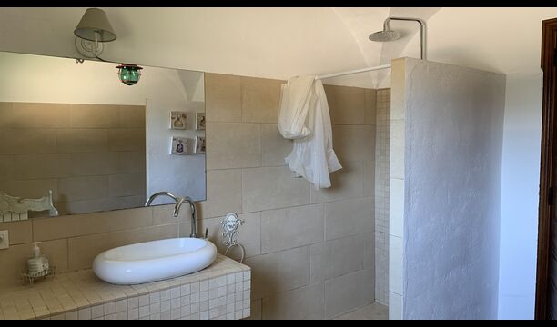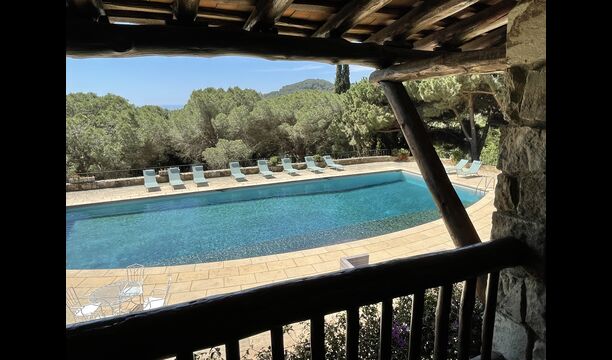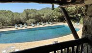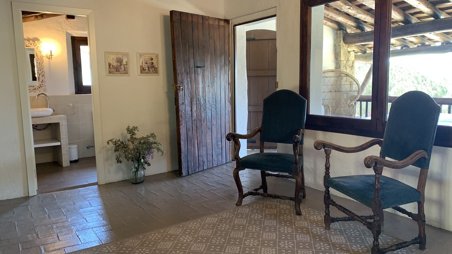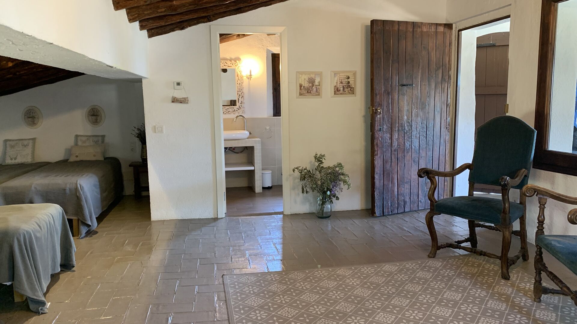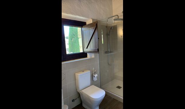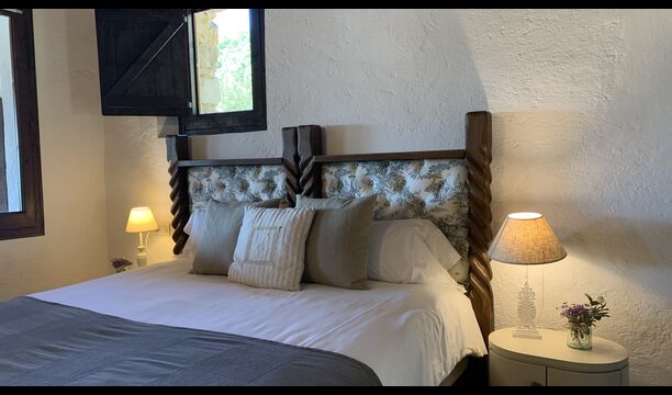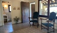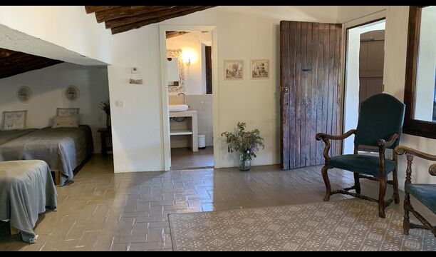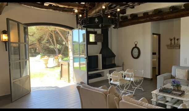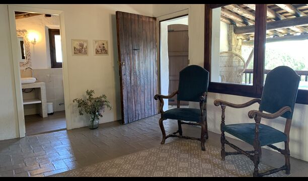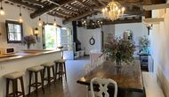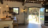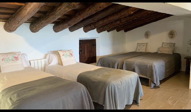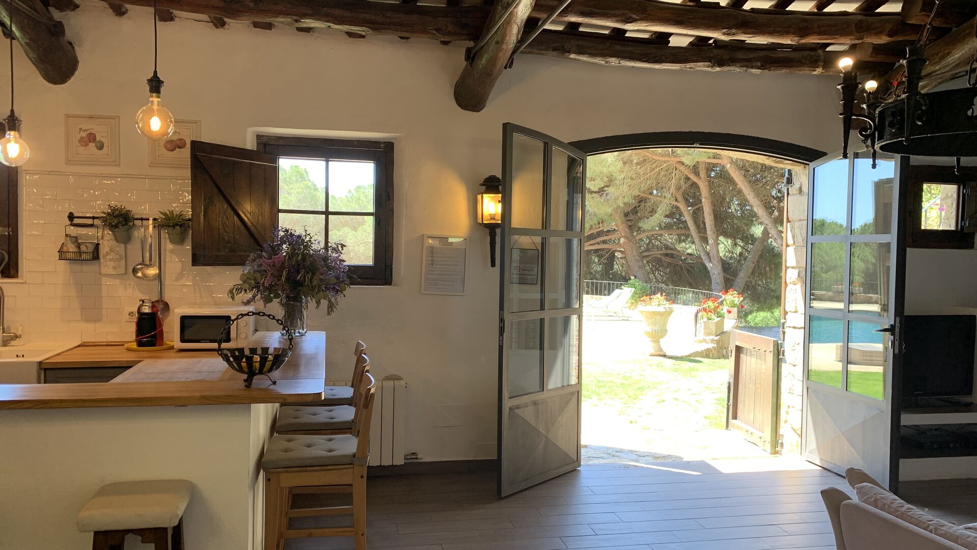 Im Erdgeschoss finden Sie auch die große offene Küche und den Wohnbereich. Die Küche ist neu renoviert und komplett ausgestattet mit allem was man braucht. Es gibt auch einen großen langen Tisch mit Platz für die gesamte Gruppe und einen gemütlichen Wohnbereich mit bequemen Sofas. Es ist ein unglaublich schöner Raum mit wunderschönen Holzbalken an der Decke. In Verlängerung des Wohnzimmers gibt es große Doppeltüren mit Fenstern, die Ihnen einen direkten Zugang zum Poolbereich ermöglichen.