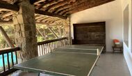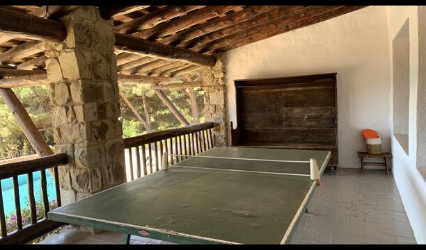 Neben dem Eingang im Erdgeschoss führt eine Treppe hinauf zum Zimmer im ersten Stock. Das perfekte Kinderzimmer mit Platz für sechs Personen (ein Doppelbett und vier Einzelbetten). Das Zimmer hat auch ein eigenes Bad. Aber das Beste an der ersten Etage ist der direkte Zugang zur überdachten Terrasse, die mit einer großen Tischtennisplatte ausgestattet ist und einen Blick auf den atemberaubenden Garten und den Swimmingpool bietet.
