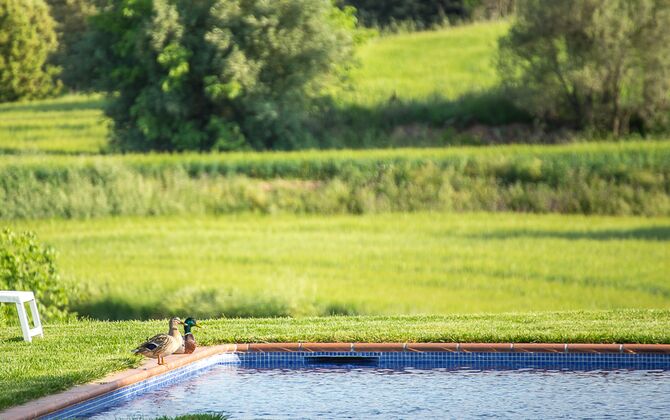 Das Ferienhaus hat einen geschlossenen Innenhof mit einer überdachten Terrasse, wo man mit etwas Fleisch auf dem Grill sitzen kann oder eine Partie Tischtennis genießen, wenn man sicht nicht im Pool-Bereich mit dem großen Swimmingpool von 8 x 4 Metern entspannt. Der Swimmingpool ist zum Schutz der kleinen Kindern eingezäunt, und es gibt Schaukeln und eine Rutsche. Neben dem Swimmingpool, im Schatten unter einer Eiche, gibt ein Tisch für Poolside-essen.