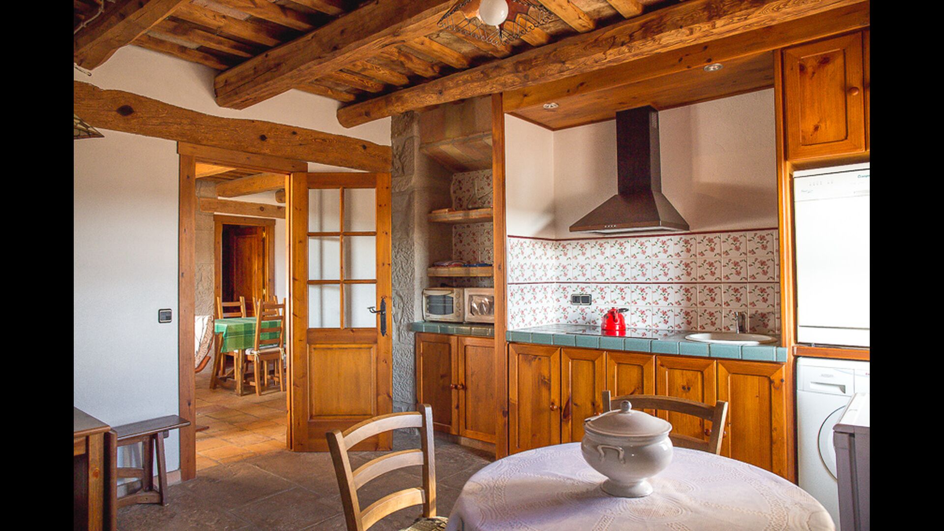 Innen gibt es im Erdgeschoss die sehr gut ausgestattete Küche mit Spülmaschine, Herd, Ceran-Kochplatten , Mikrowelle und Kühlschrank mit Gefrierfach. Praktischerweise gibt es ein Fenster von der Küche zum Grillplatz, damit man leicht Sachen hinausreichen kann. Auf dieser Etage gibt es ebenfalls ein Esstisch und eine Sofaecke mit TV. Außerdem findet man im Erdgeschoss 3 Doppelzimmer und 2 Bäder mit Dusche.