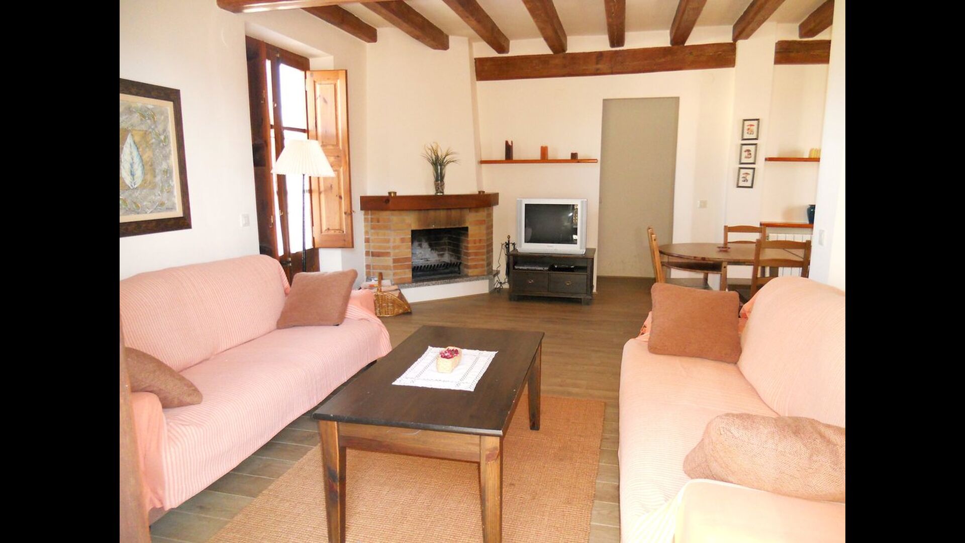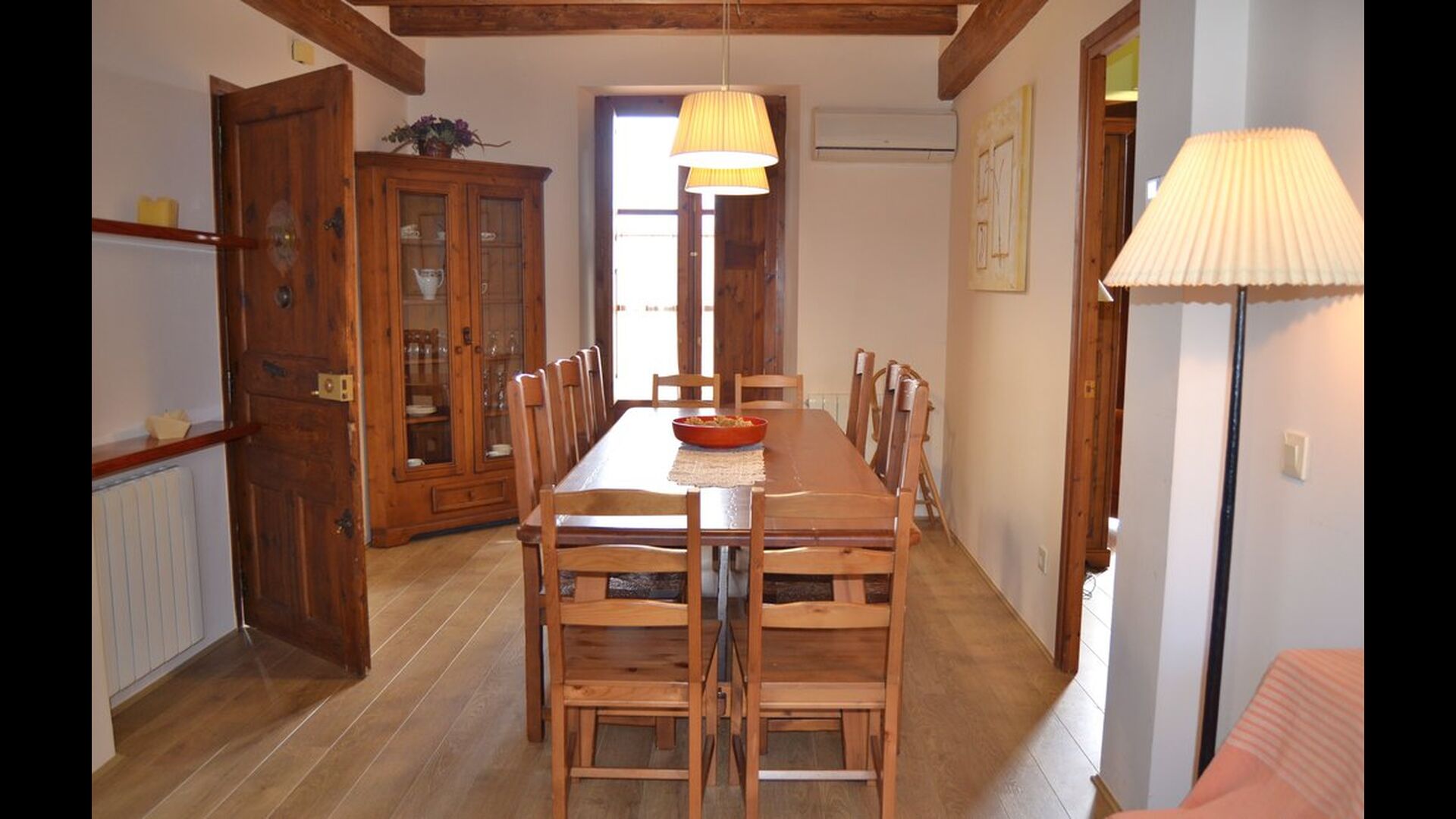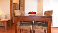 Auf der ersten Etage finden Sie einen schönen Wohn / Esszimmer mit einem langen traditionellen Esstisch und eine gemütliche Sofaecke mit zwei Sofas.