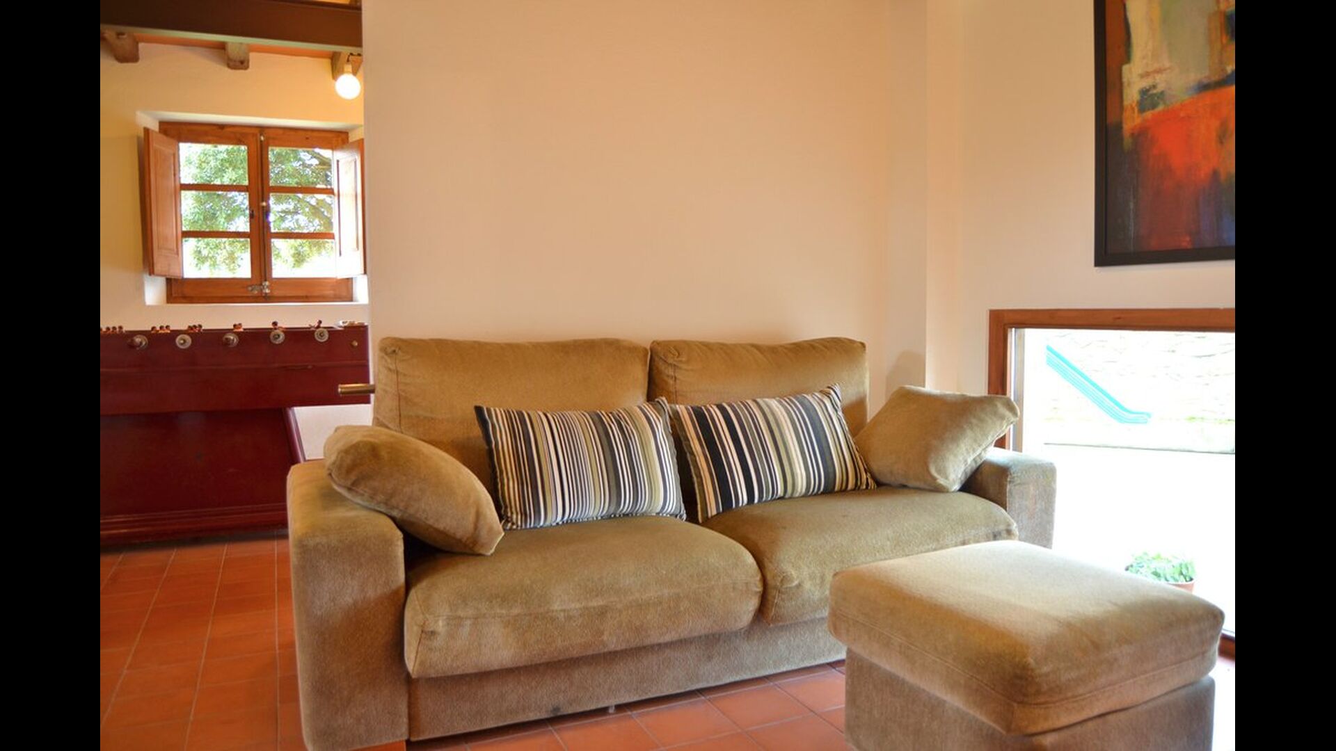 Im Erdgeschoss gibt es ein Spielzimmer mit Tischfußball, und eine Ecke mit Kindermöbel und Spiele für Kinder und einen Wohnbereich mit TV und DVD. Es gibt auch ein Badezimmer mit Dusche, die auch in Verbindung mit dem Pool verwendet werden kann..