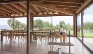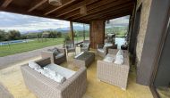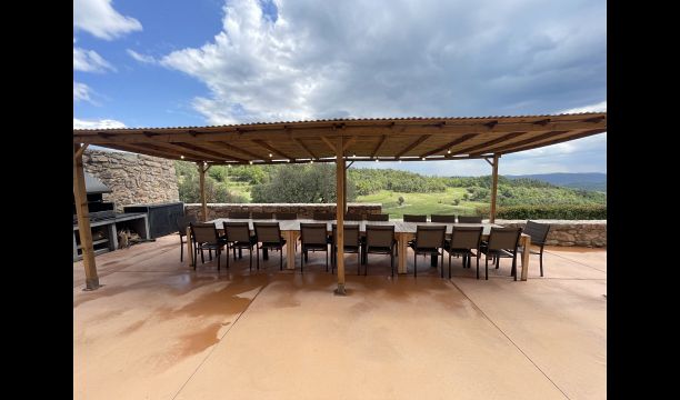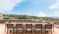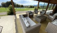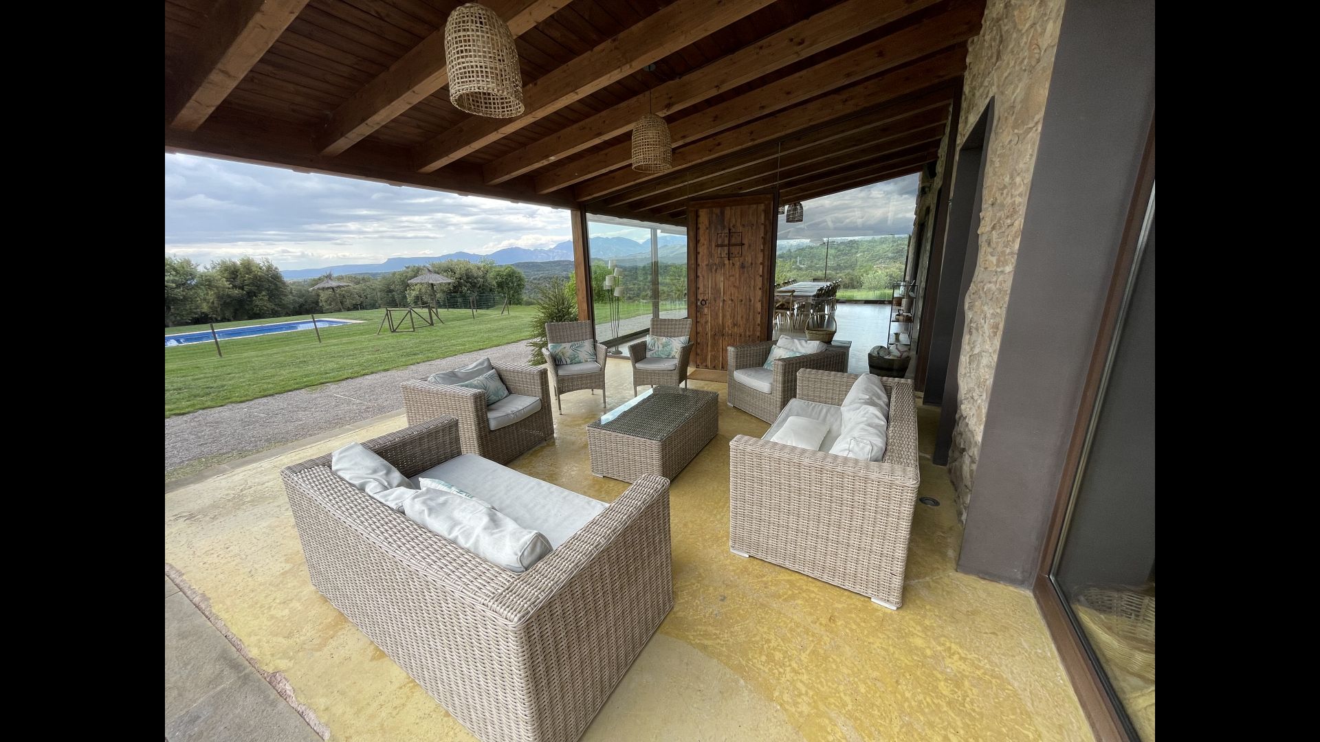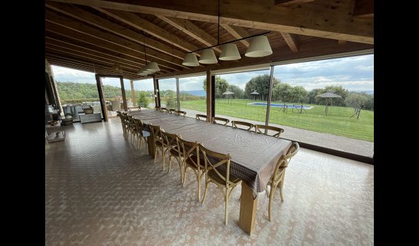 Im Erdgeschoss befindet sich eine Veranda vor dem Pool und mit spektakulärem Blick auf die Berge. Von hier aus gelangen Sie in das Esszimmer, das durch die großen Fenster einen Blick auf den Garten bietet.