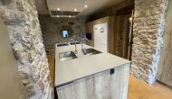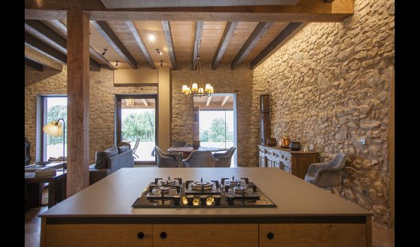 Von der Außenterrasse mit Grill, Essplatz und Liegestühlen zum Entspannen gelangen Sie direkt in den großen Speisesaal des Mas. Dieser fungiert als Herzstück des Hauses und verbindet die beiden kleinen Wohnzimmer im Erdgeschoss mit der großen Küche. Die Küche ist komplett ausgestattet mit 2 Gasherden, 2 Geschirrspülern, 2 Kühlschränken mit Gefrierfach, Backofen, Mikrowelle und Kaffeemaschine sowie einem kleinen Frühstückstisch.