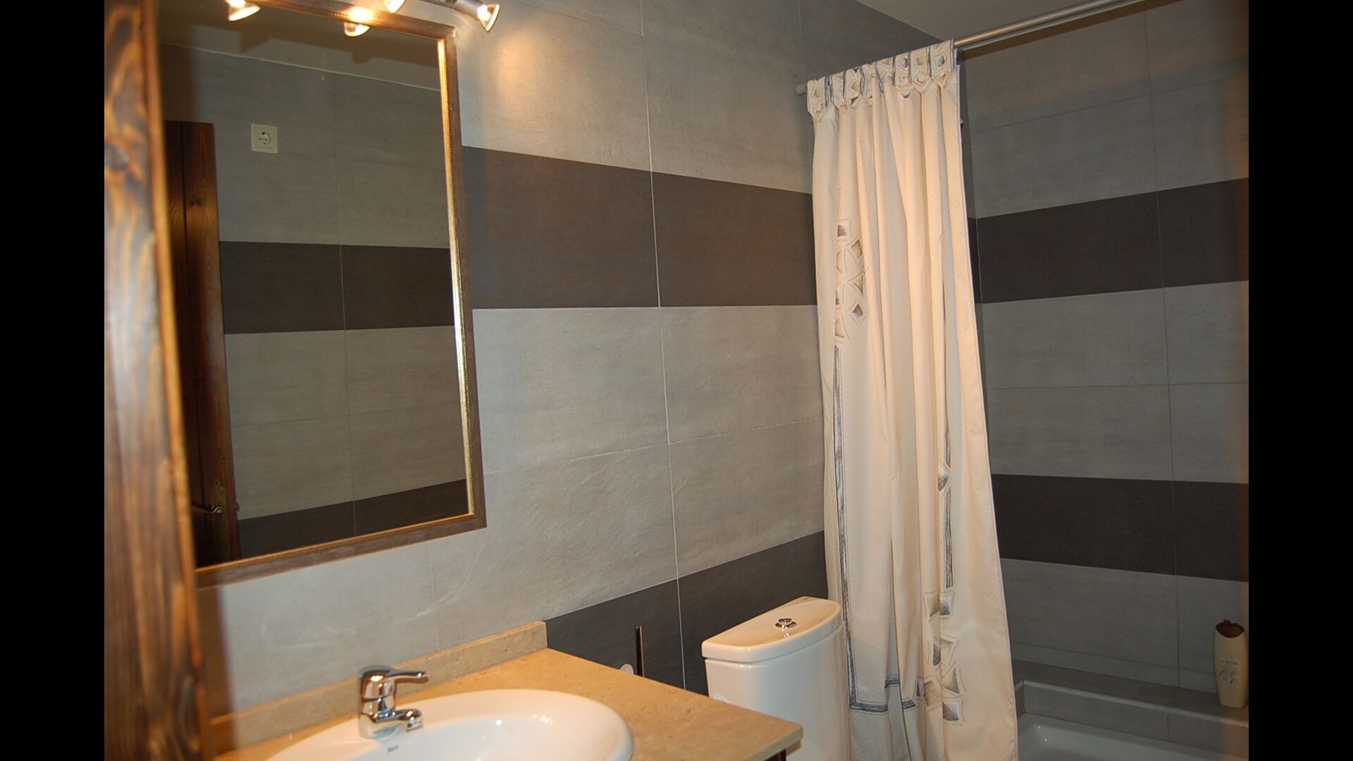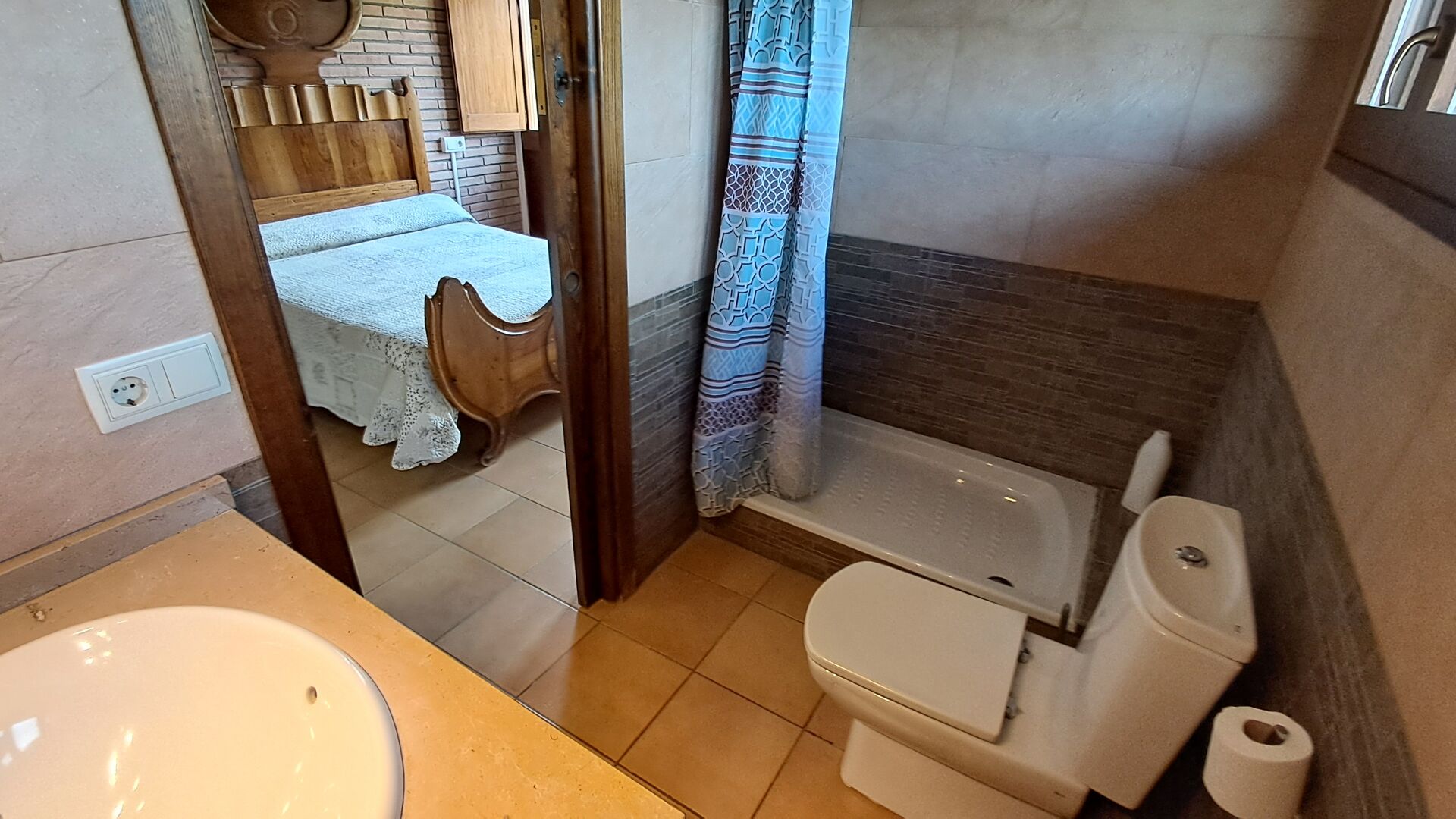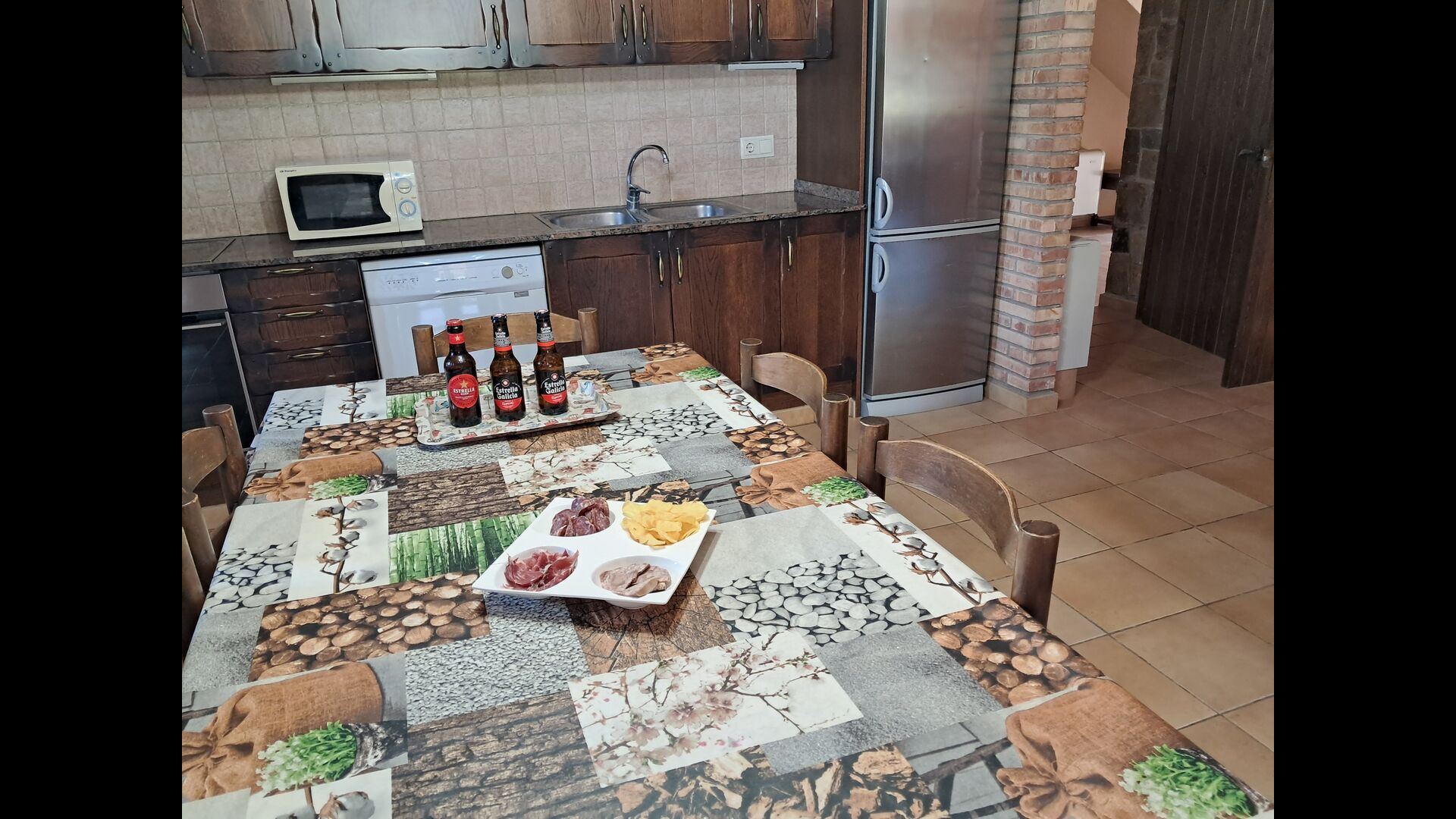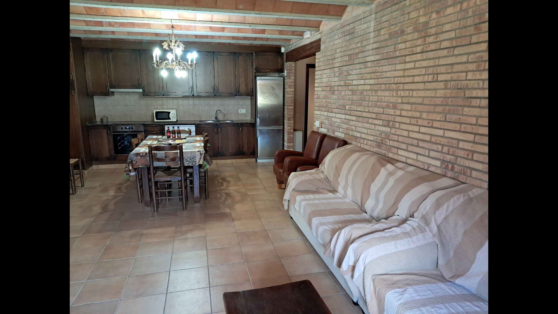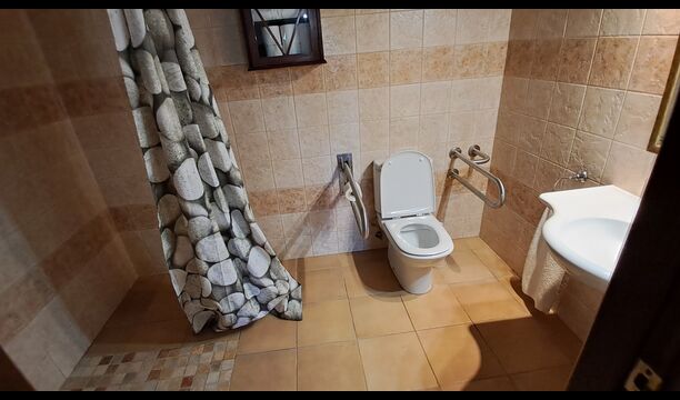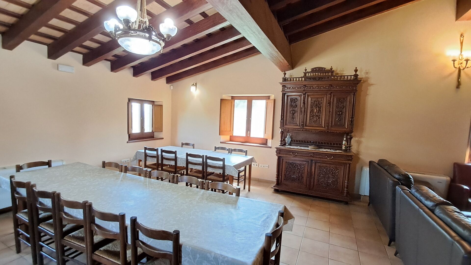 Eine Hälfte der ersten Etage dient als großer Gemeinschaftsraum mit einer offenen Küche und viel Platz, sodass die gesamte Gruppe gemeinsam speisen kann. Es gibt auch eine gemütliche Sofaecke mit Fernseher und DVD-Player. Das Haus hat auch WI-FI. Von diesem Bereich aus haben Sie über eine Außentreppe direkten Zugang zur überdachten Terrasse mit Grillplatz. Im anderen Teil der ersten Etage finden Sie 4 geräumige Schlafzimmer, 2 davon Doppelzimmer und 2 davon Dreibettzimmer. Auf dieser Etage befinden sich insgesamt 4 Badezimmer.