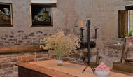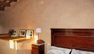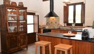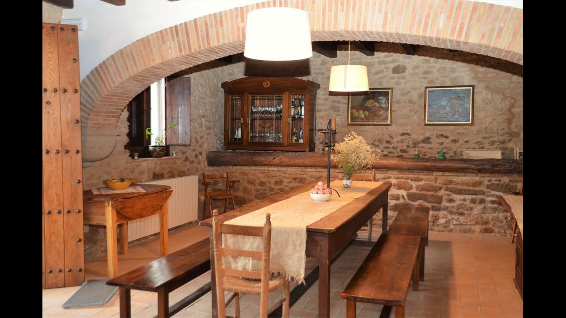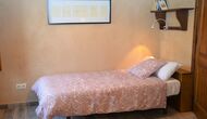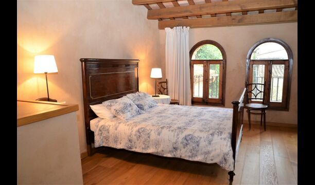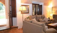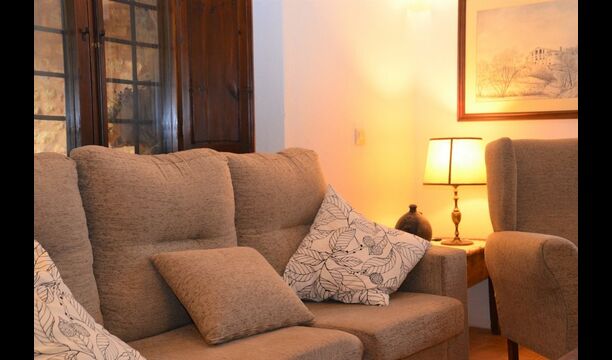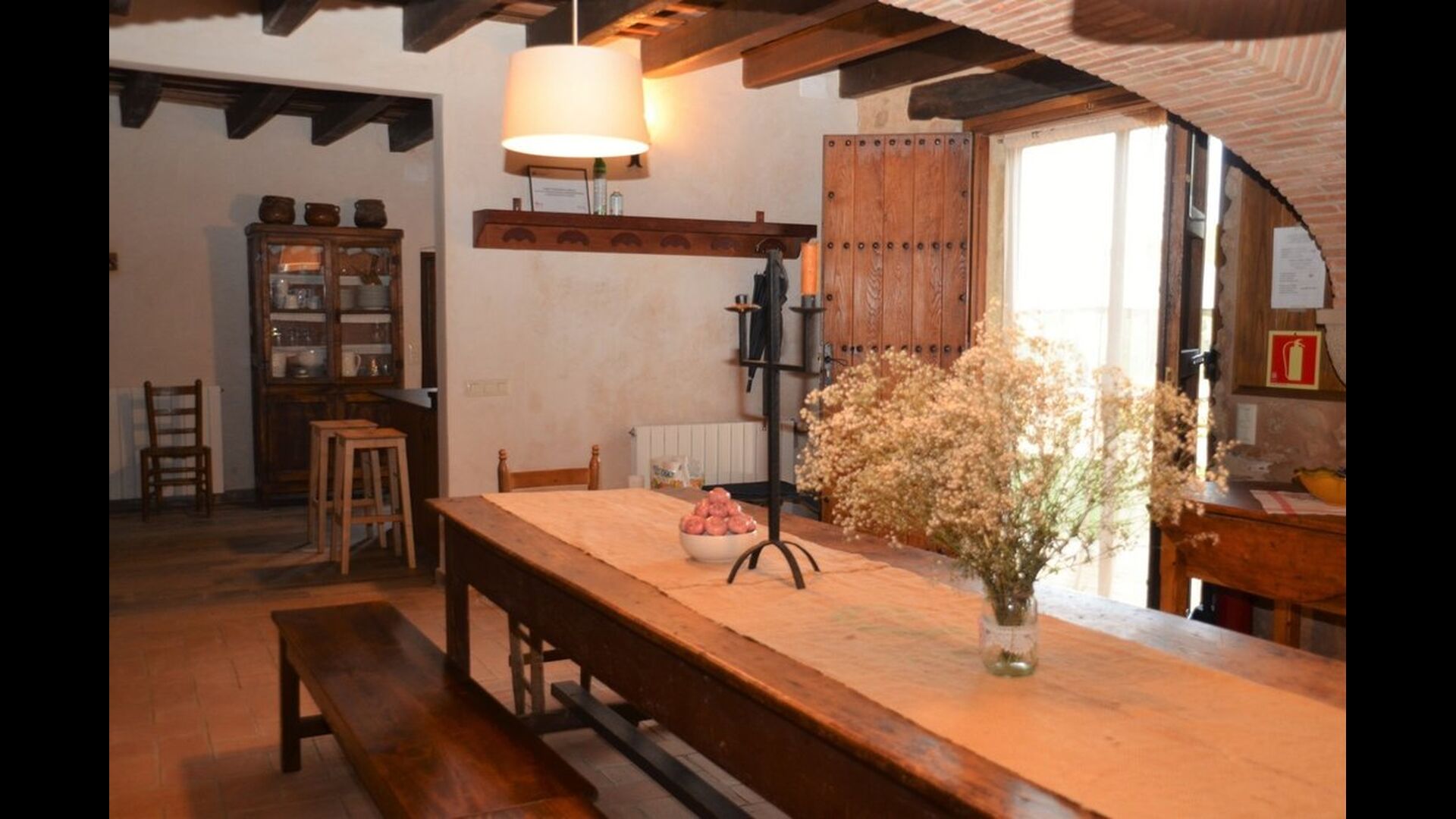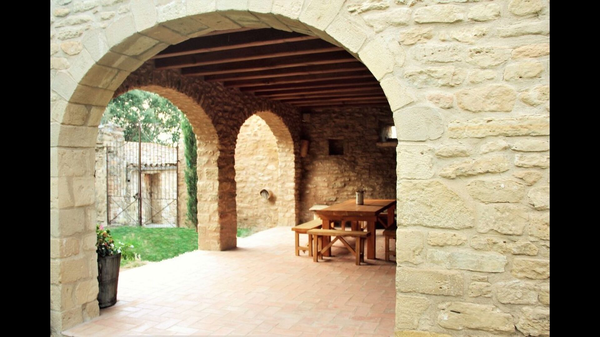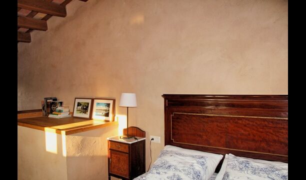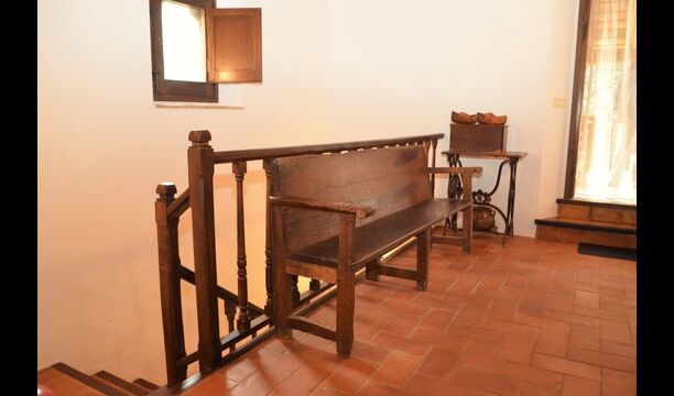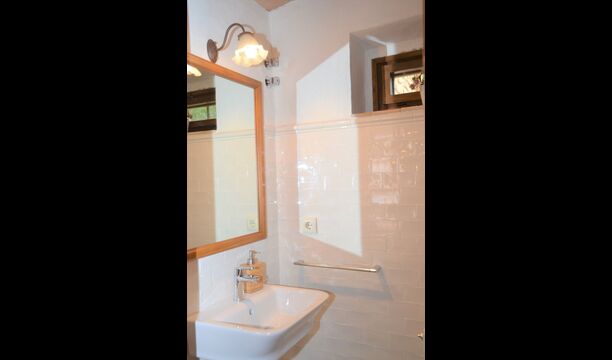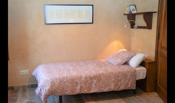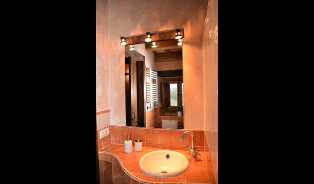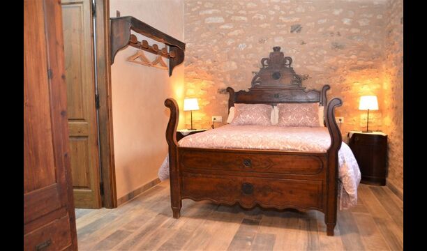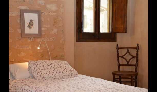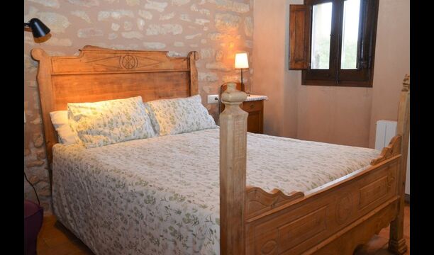 When you enter the ground floor from the pool area you will be lead into the large open kitchen and dining room. The interior and style of the kitchen is very authentic and tasteful, with a large wooden cupboard, wooden chairs and a cozy fireplace. It has a counter bar on one side, with two bar stools and is very well equipped with everything you might need, including; fridge, freezer, dishwasher, microwave and even a Nespresso machine. The dining room is also incredibly cozy with a, arched ceiling and with authentic limestone walls. It has a long wooden dining table with wooden benches. In the next room is the lounge room with comfortable couches and chairs. There is a TV and a DVD machine, and the house also has Wi-Fi, so you will be able to put your feet up and relax here, if desired. There is also a small bathroom with a toilet on this floor, so you do not have to go upstairs if needed. At the end of this part of the house, you will find an exit that takes you outside to a covered terrace with a large table. The perfect spot to dine or enjoy a cool drink at night time, in the lovely Catalan temperatures.