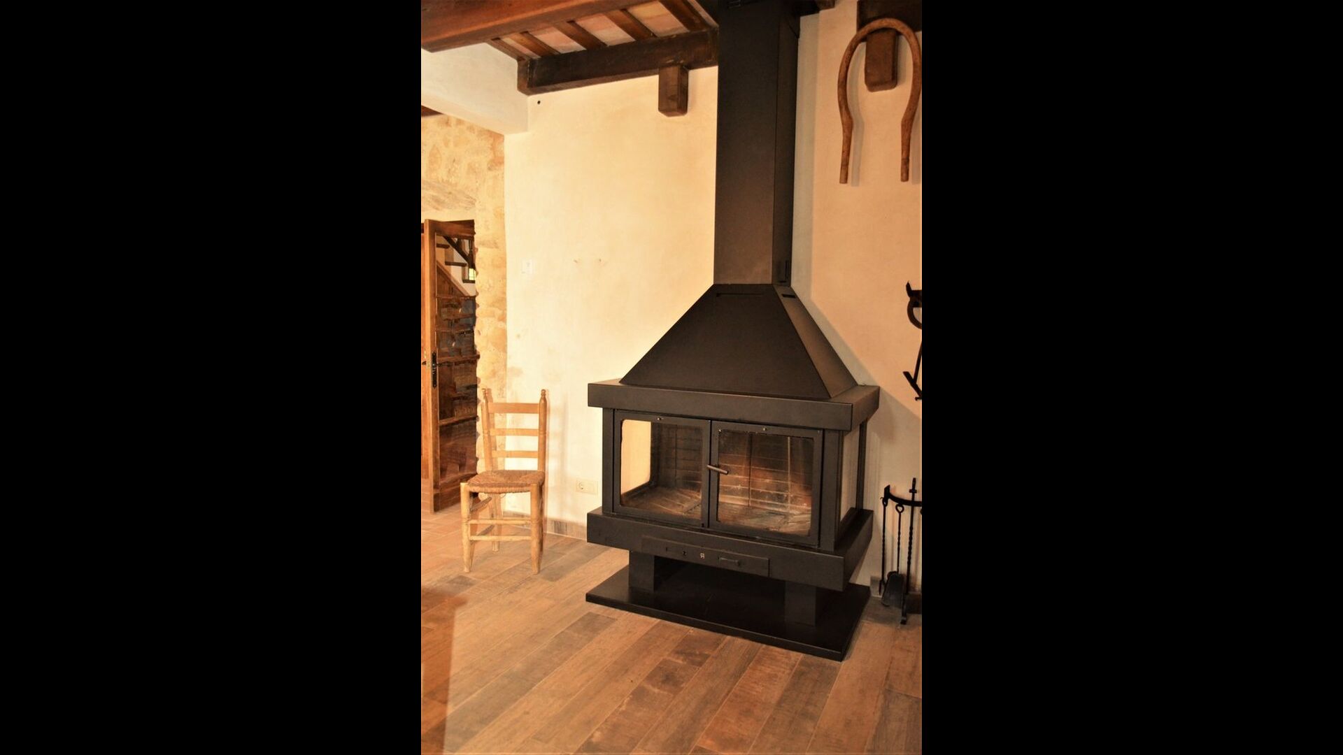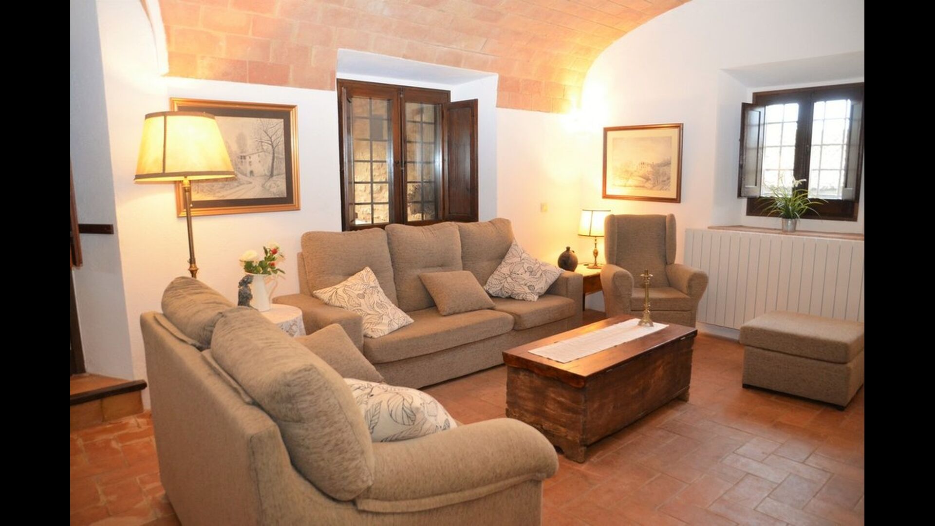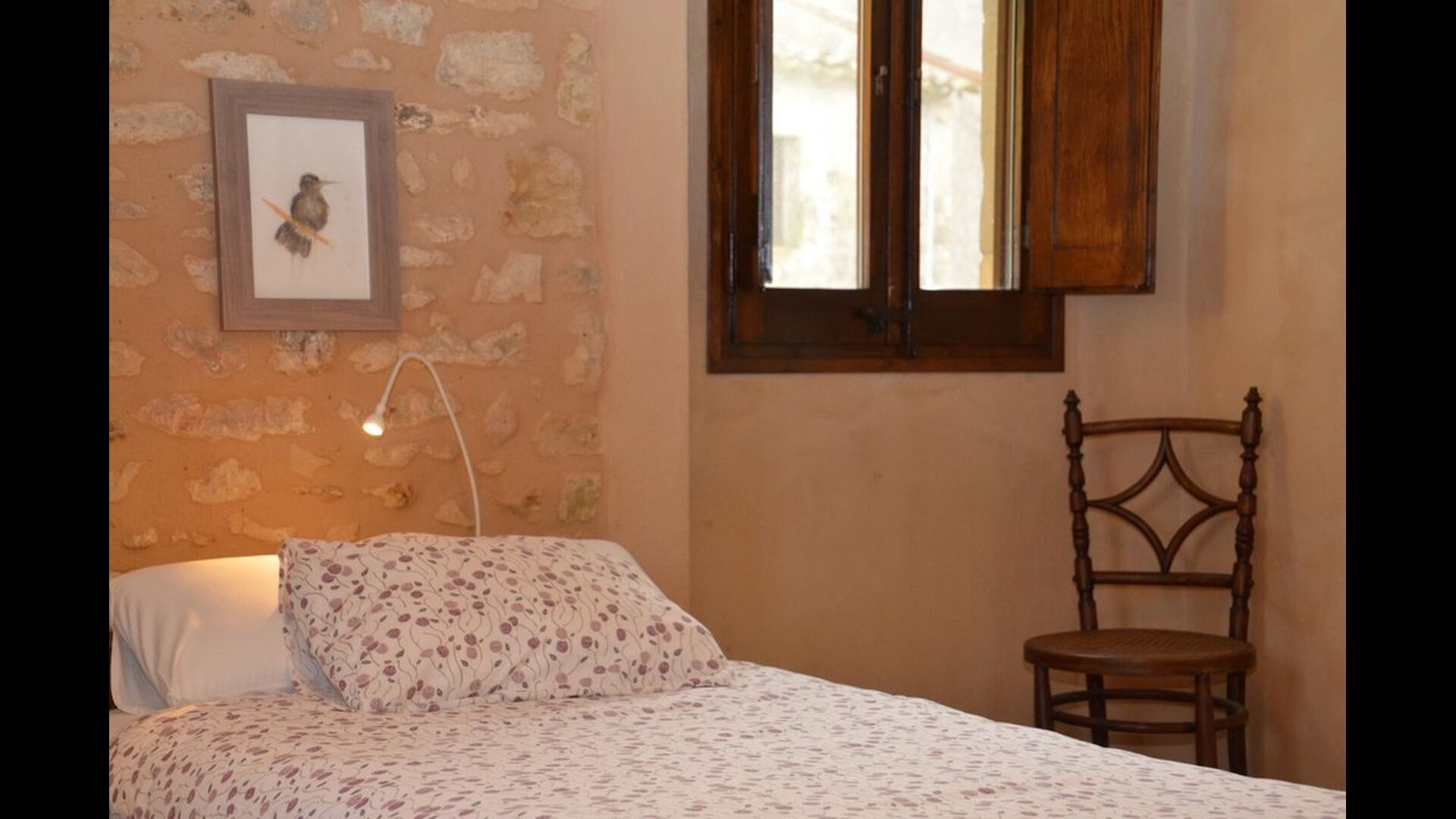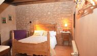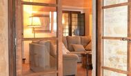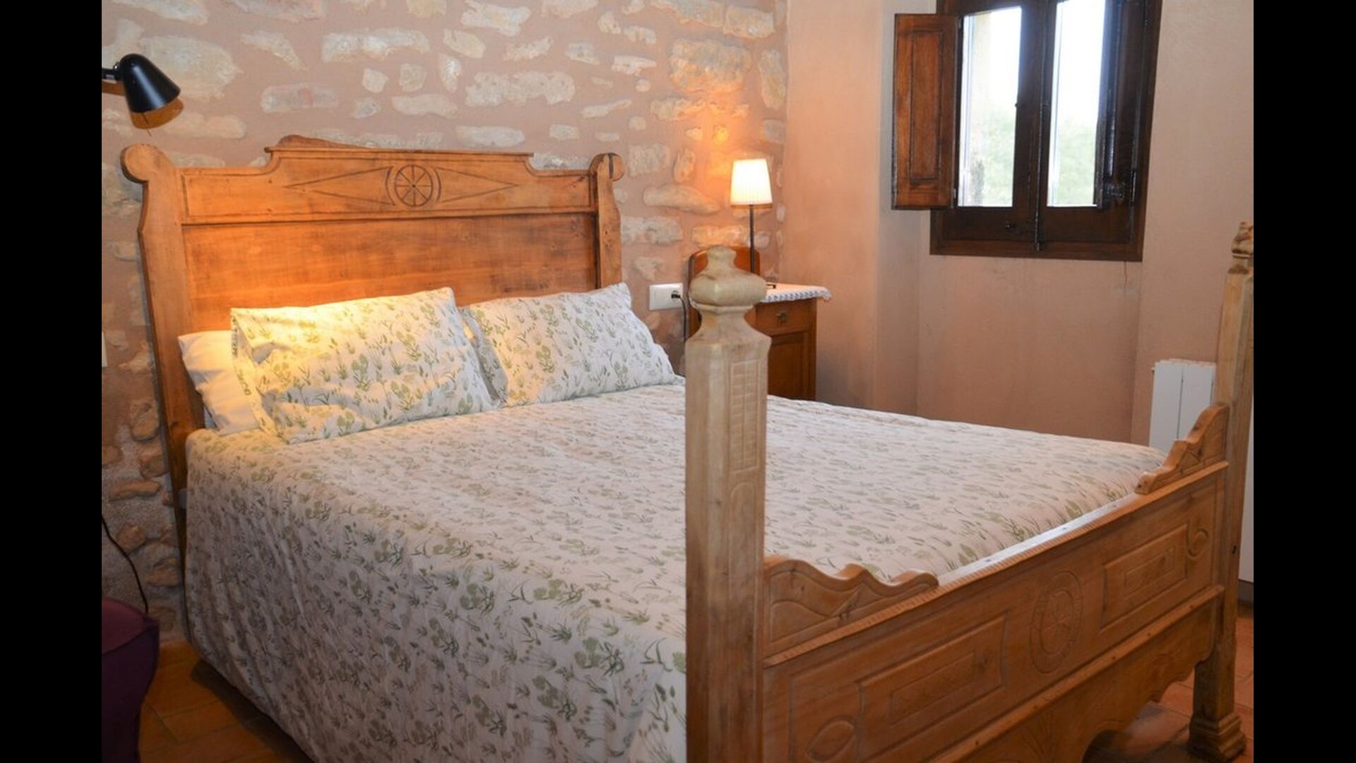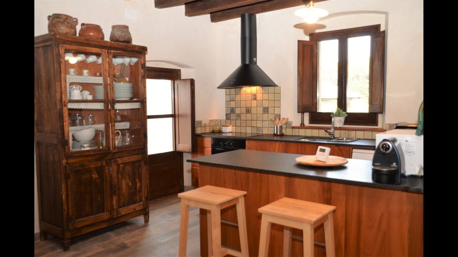 When you enter the ground floor from the pool area you will be lead into the large open kitchen and dining room. The interior and style of the kitchen is very authentic and tasteful, with a large wooden cupboard, wooden chairs and a cozy fireplace. It has a counter bar on one side, with two bar stools and is very well equipped with everything you might need, including; fridge, freezer, dishwasher, microwave and even a Nespresso machine. The dining room is also incredibly cozy with a, arched ceiling and with authentic limestone walls. It has a long wooden dining table with wooden benches. In the next room is the lounge room with comfortable couches and chairs. There is a TV and a DVD machine, and the house also has Wi-Fi, so you will be able to put your feet up and relax here, if desired. There is also a small bathroom with a toilet on this floor, so you do not have to go upstairs if needed. At the end of this part of the house, you will find an exit that takes you outside to a covered terrace with a large table. The perfect spot to dine or enjoy a cool drink at night time, in the lovely Catalan temperatures.