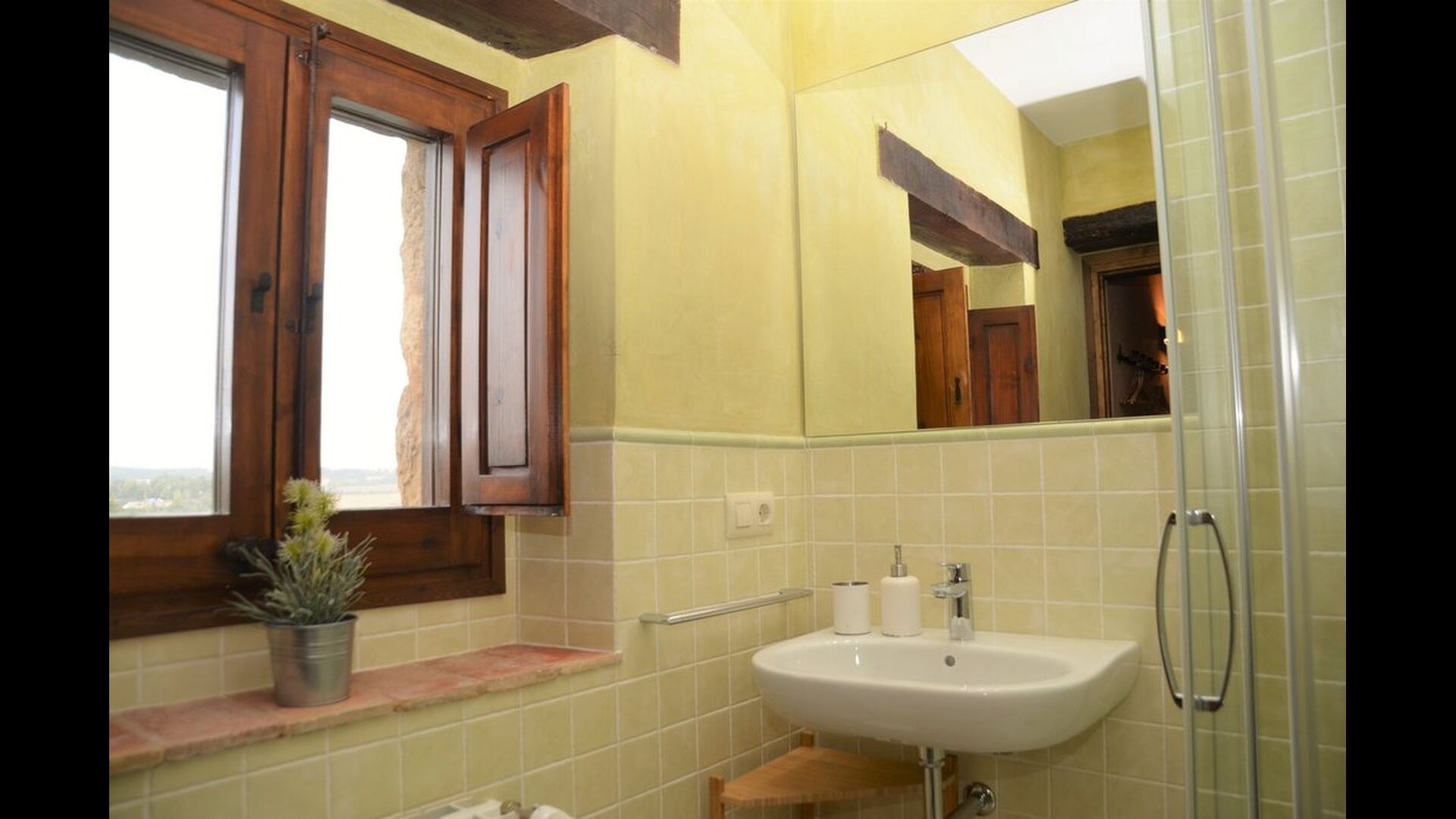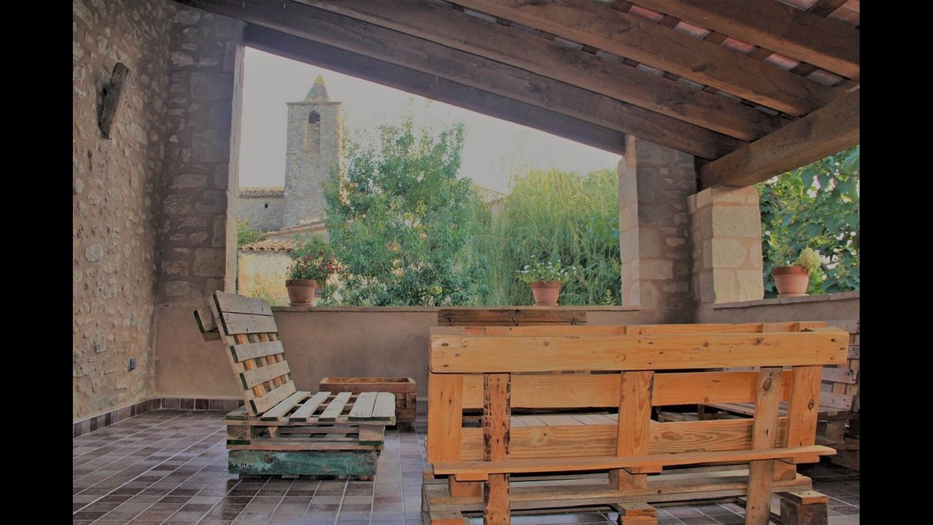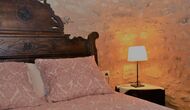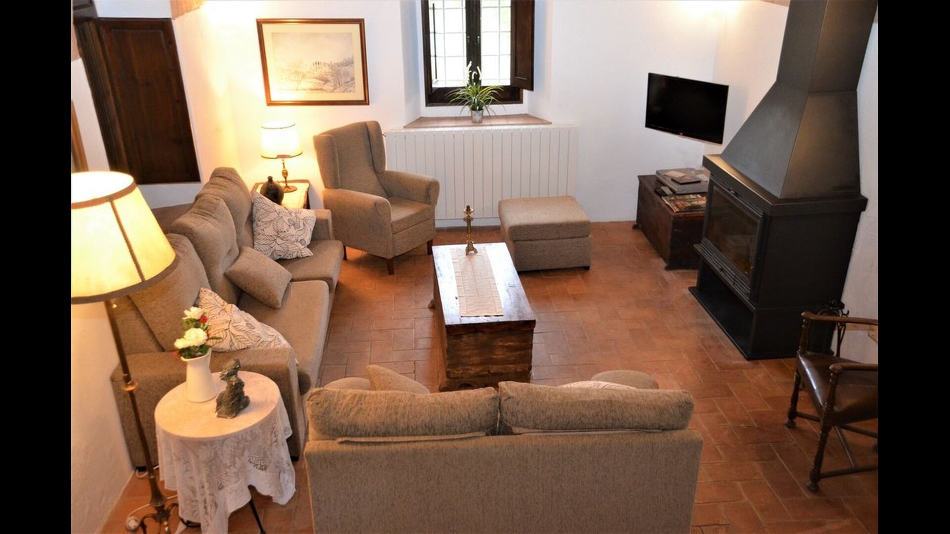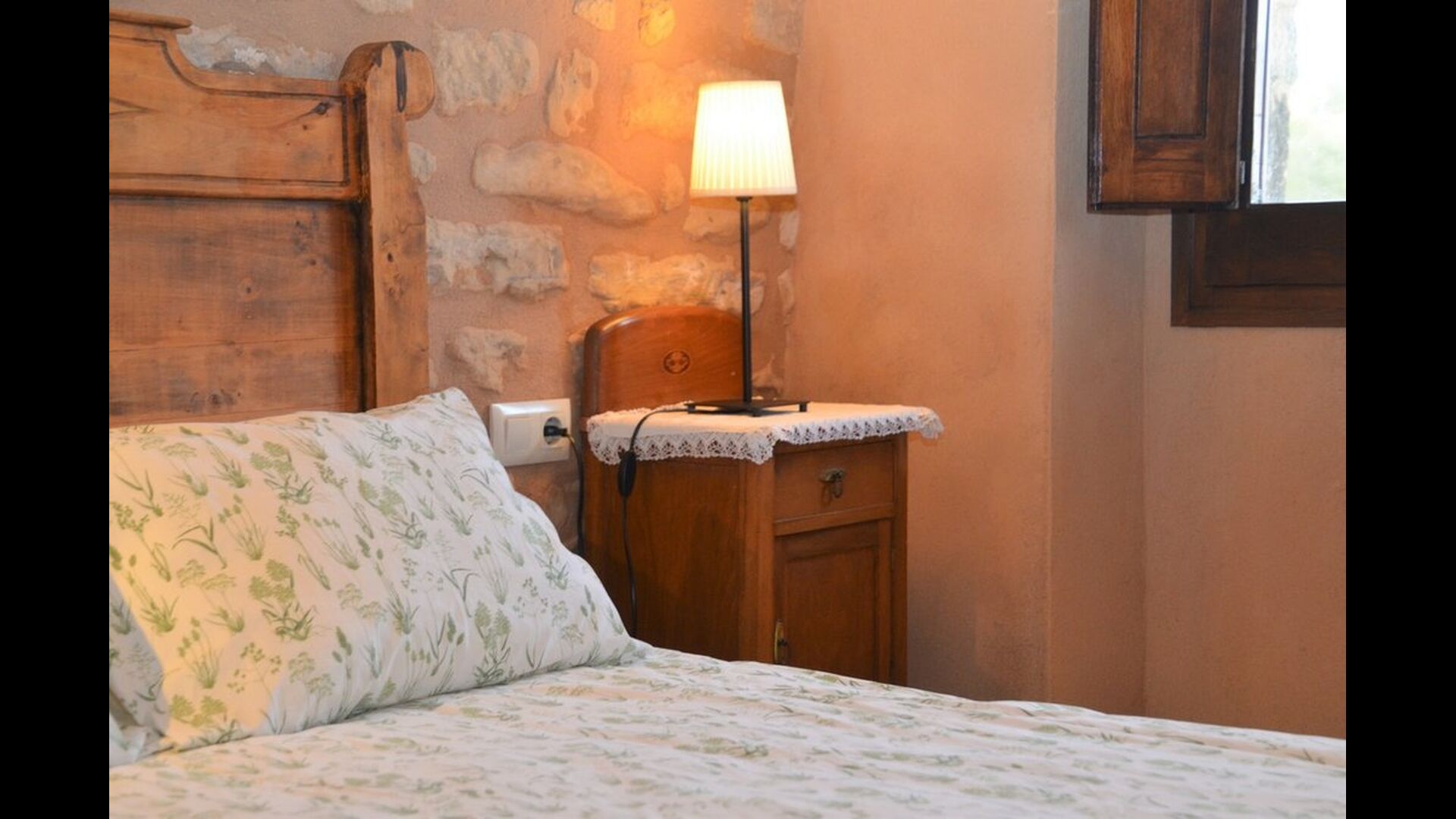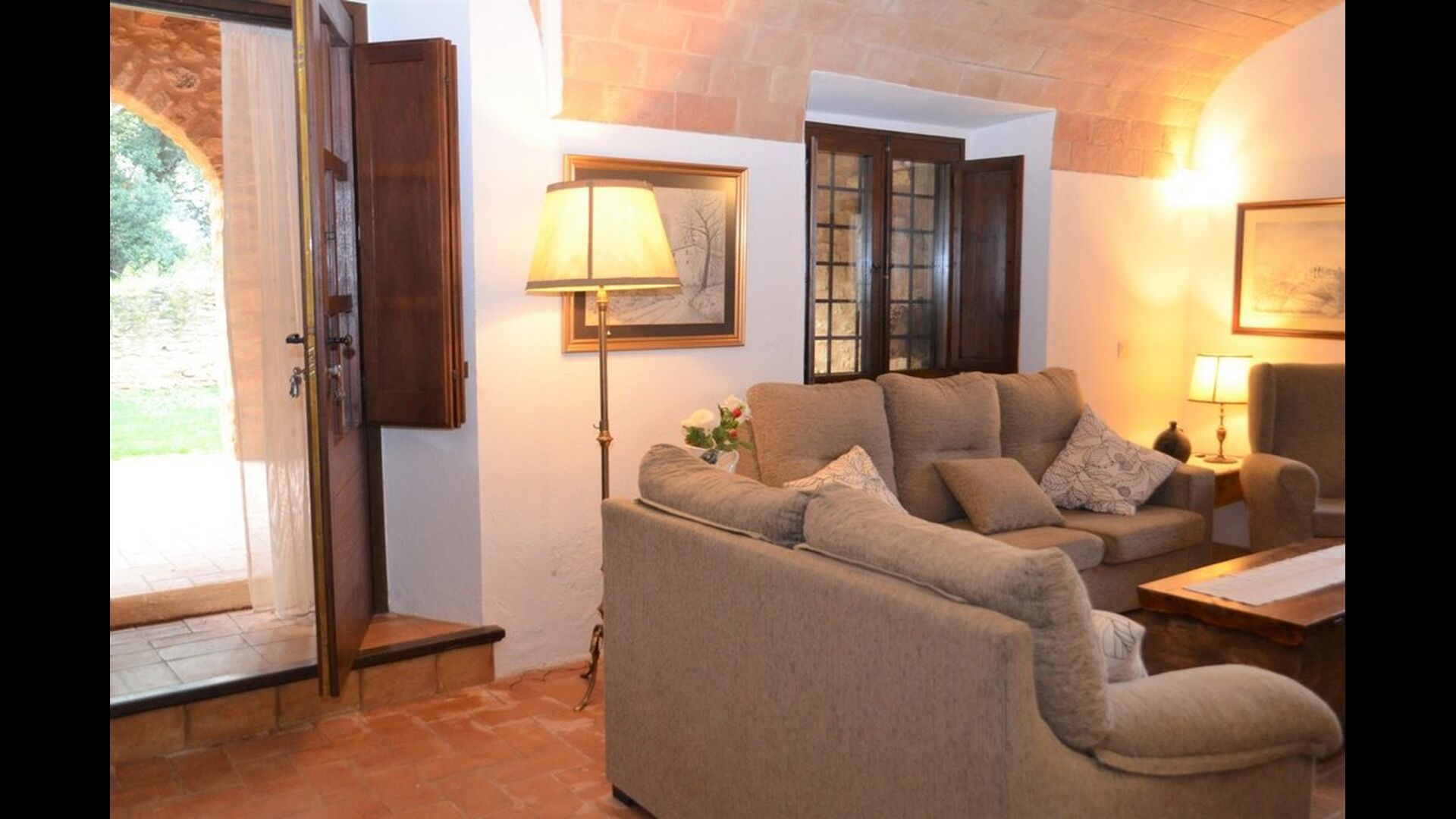 When you enter the ground floor from the pool area you will be lead into the large open kitchen and dining room. The interior and style of the kitchen is very authentic and tasteful, with a large wooden cupboard, wooden chairs and a cozy fireplace. It has a counter bar on one side, with two bar stools and is very well equipped with everything you might need, including; fridge, freezer, dishwasher, microwave and even a Nespresso machine. The dining room is also incredibly cozy with a, arched ceiling and with authentic limestone walls. It has a long wooden dining table with wooden benches. In the next room is the lounge room with comfortable couches and chairs. There is a TV and a DVD machine, and the house also has Wi-Fi, so you will be able to put your feet up and relax here, if desired. There is also a small bathroom with a toilet on this floor, so you do not have to go upstairs if needed. At the end of this part of the house, you will find an exit that takes you outside to a covered terrace with a large table. The perfect spot to dine or enjoy a cool drink at night time, in the lovely Catalan temperatures.