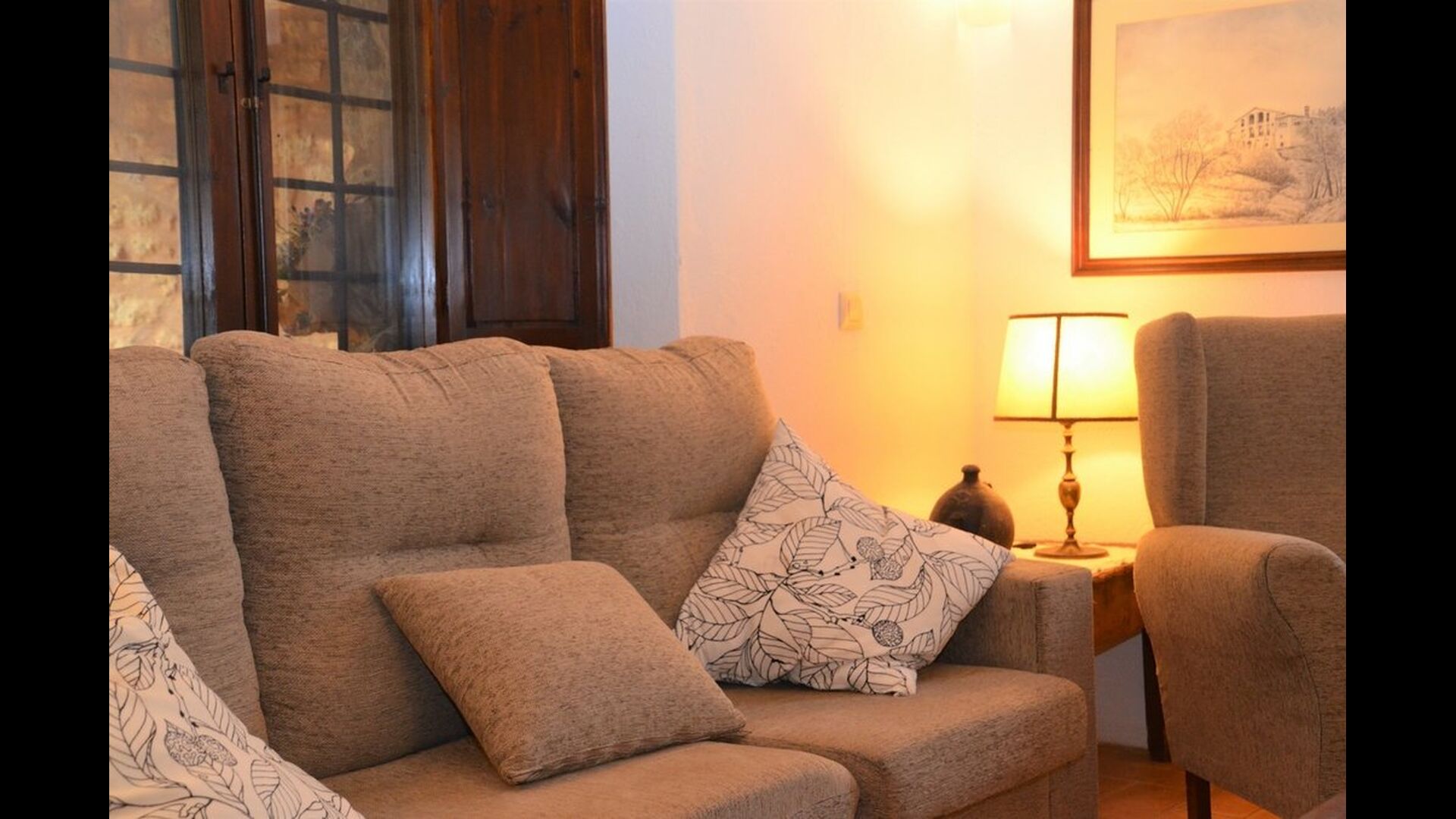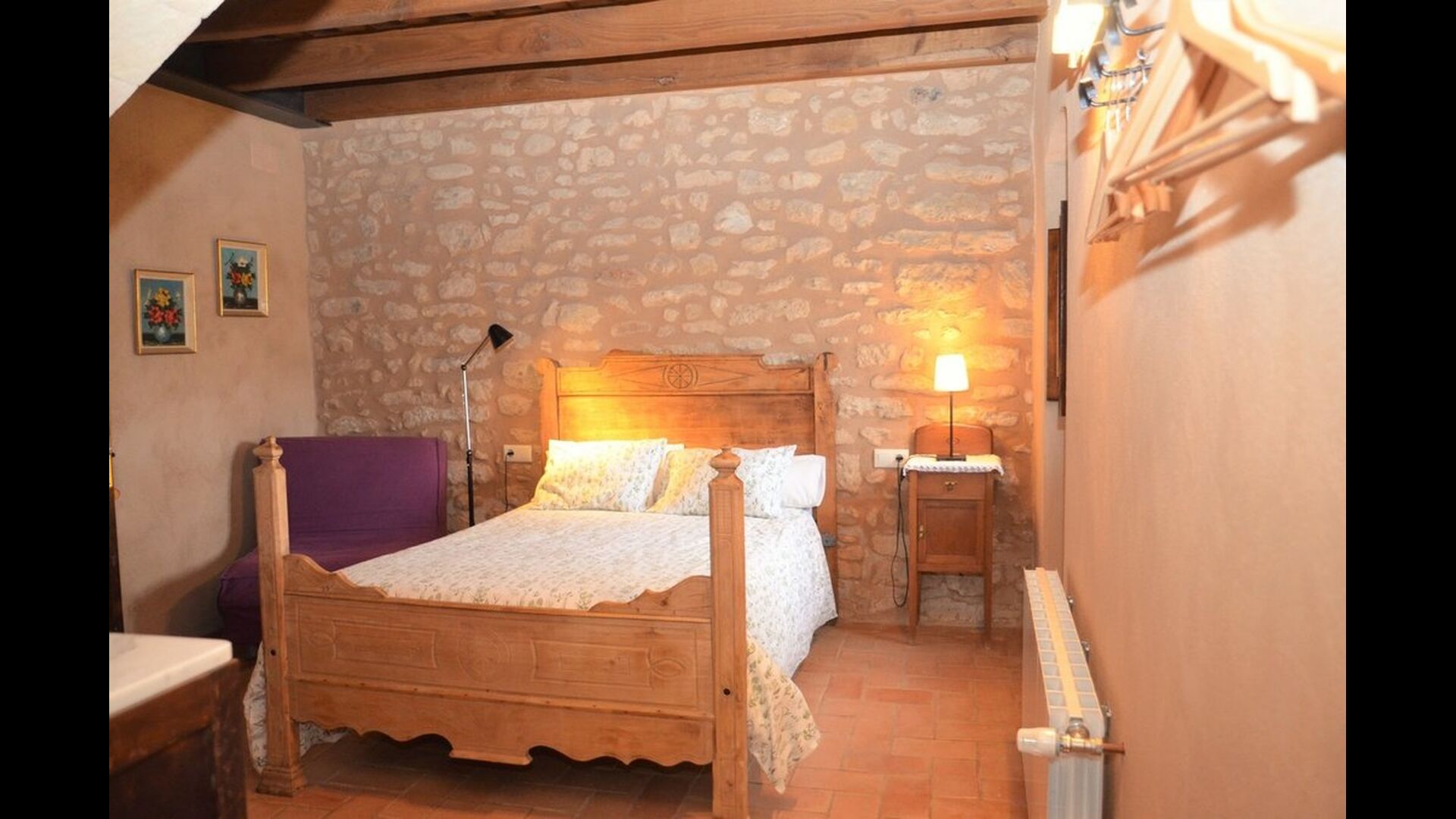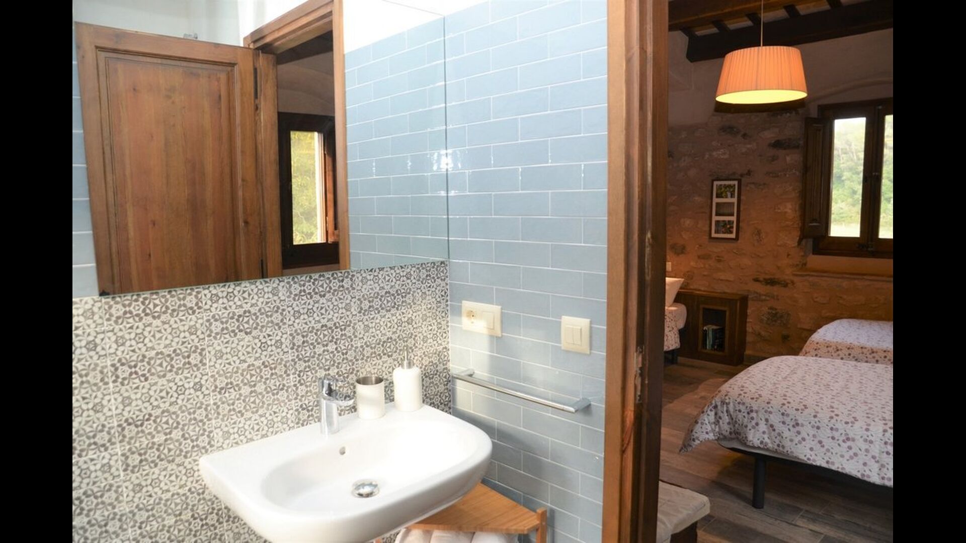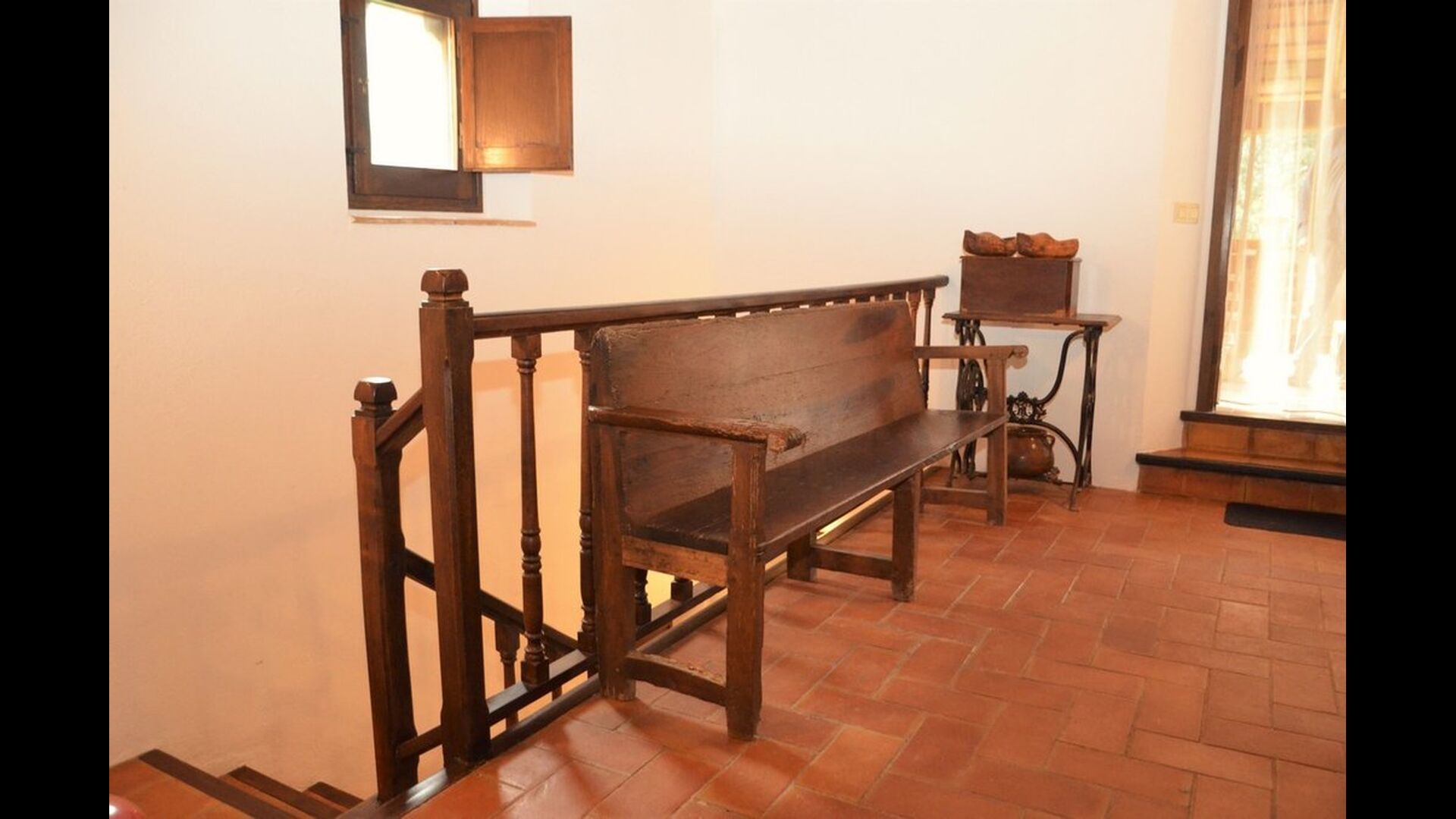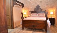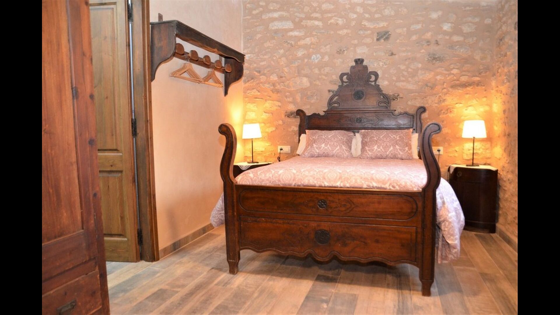 When you enter the ground floor from the pool area you will be lead into the large open kitchen and dining room. The interior and style of the kitchen is very authentic and tasteful, with a large wooden cupboard, wooden chairs and a cozy fireplace. It has a counter bar on one side, with two bar stools and is very well equipped with everything you might need, including; fridge, freezer, dishwasher, microwave and even a Nespresso machine. The dining room is also incredibly cozy with a, arched ceiling and with authentic limestone walls. It has a long wooden dining table with wooden benches. In the next room is the lounge room with comfortable couches and chairs. There is a TV and a DVD machine, and the house also has Wi-Fi, so you will be able to put your feet up and relax here, if desired. There is also a small bathroom with a toilet on this floor, so you do not have to go upstairs if needed. At the end of this part of the house, you will find an exit that takes you outside to a covered terrace with a large table. The perfect spot to dine or enjoy a cool drink at night time, in the lovely Catalan temperatures.