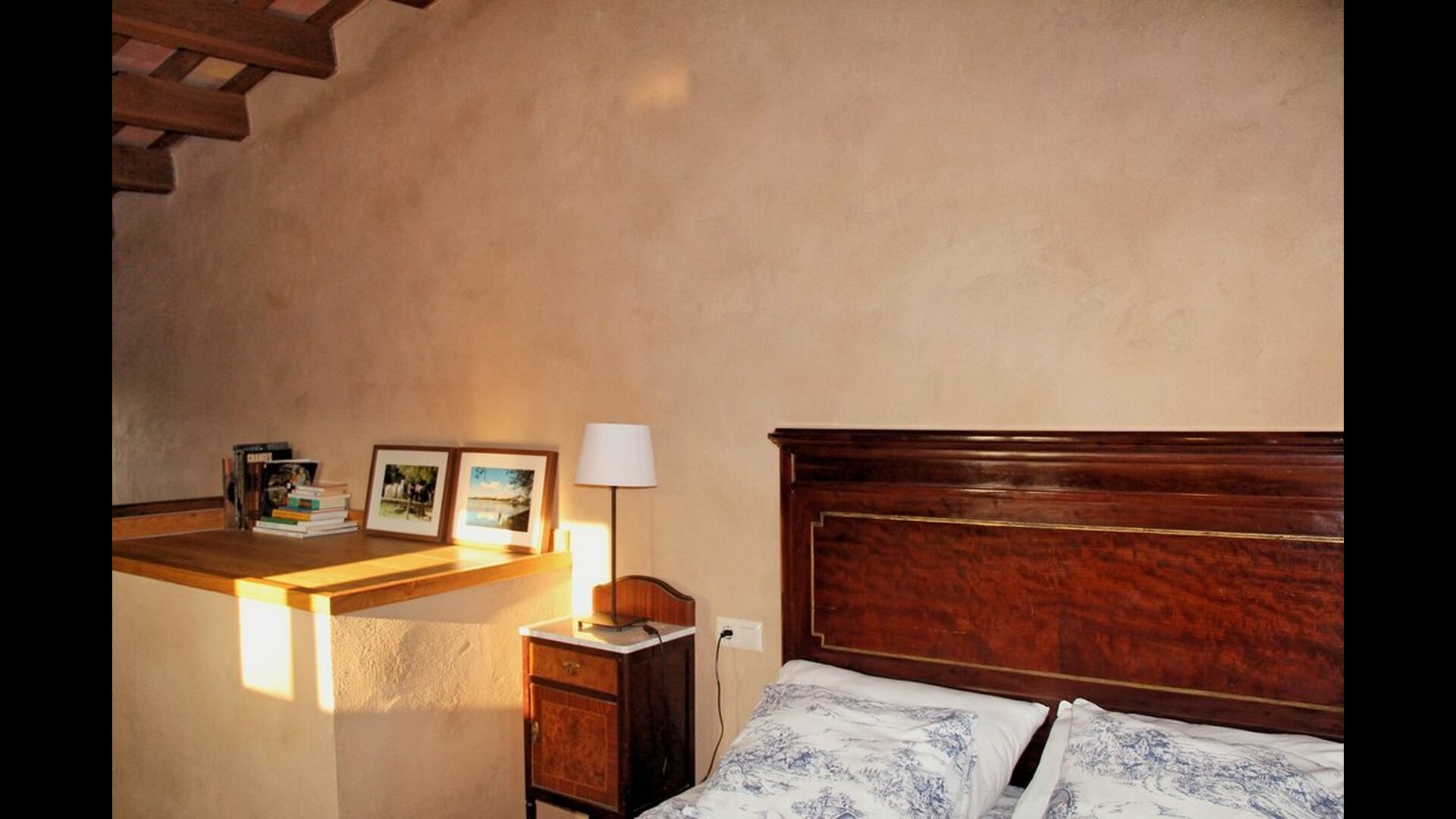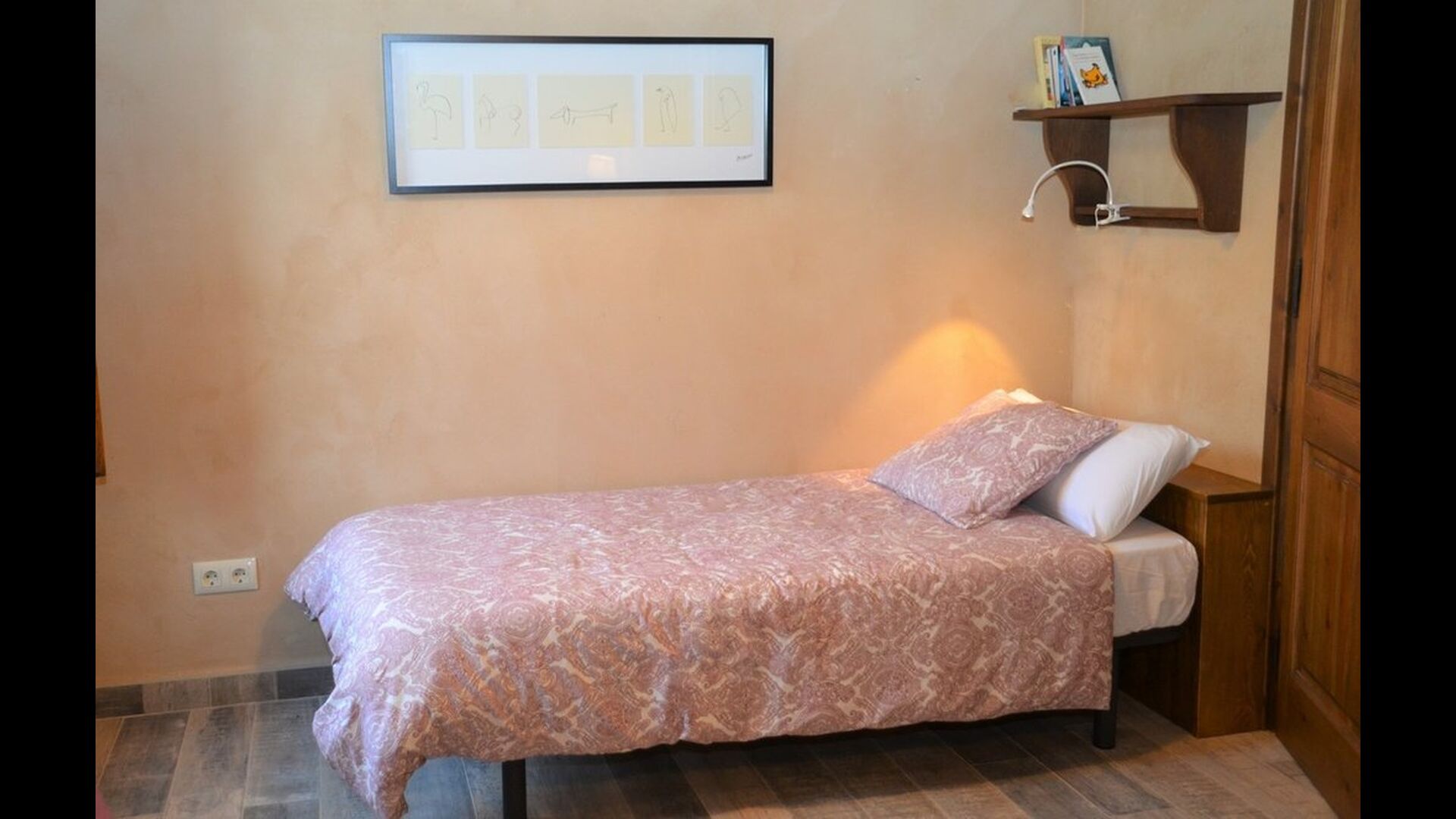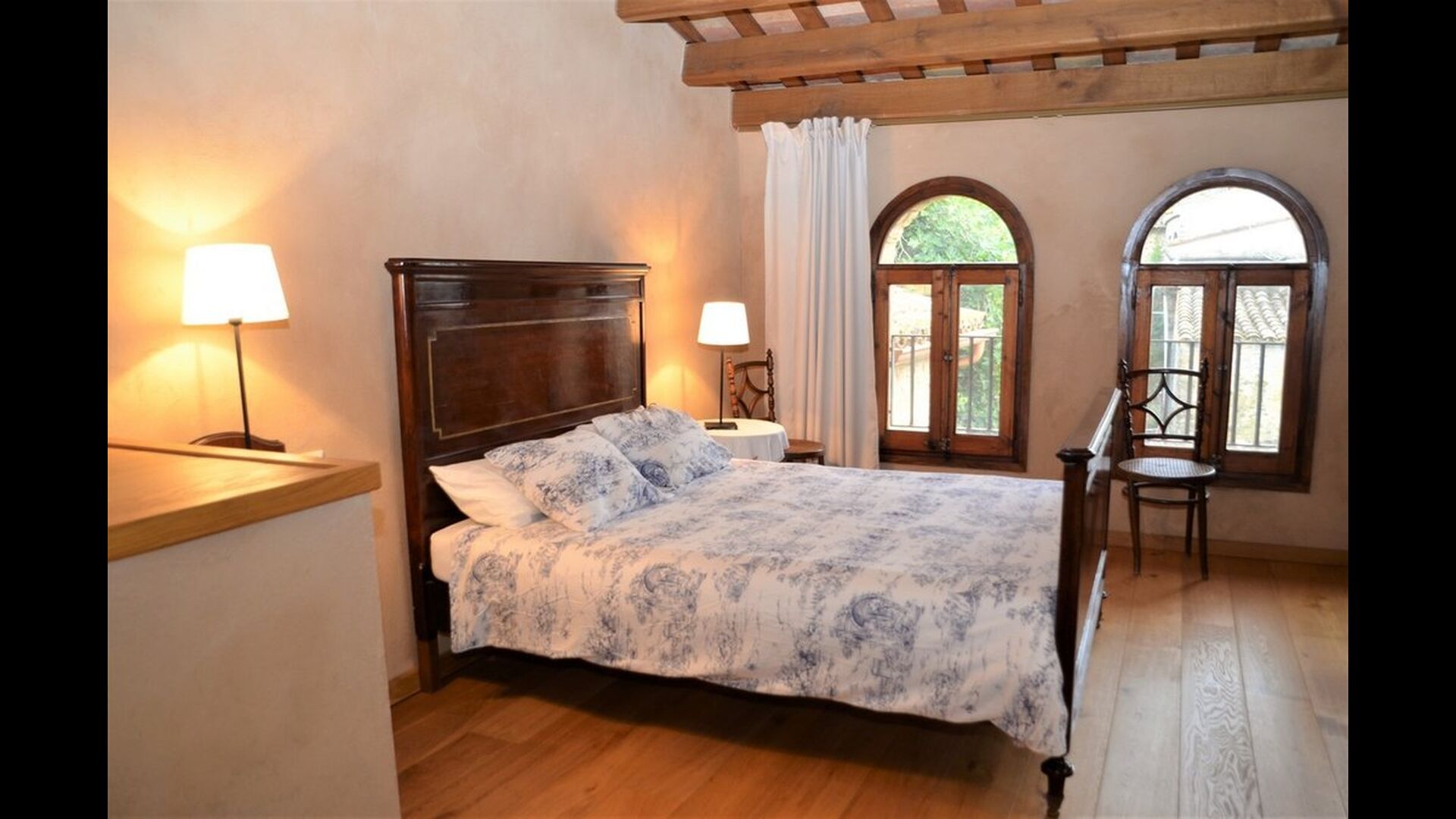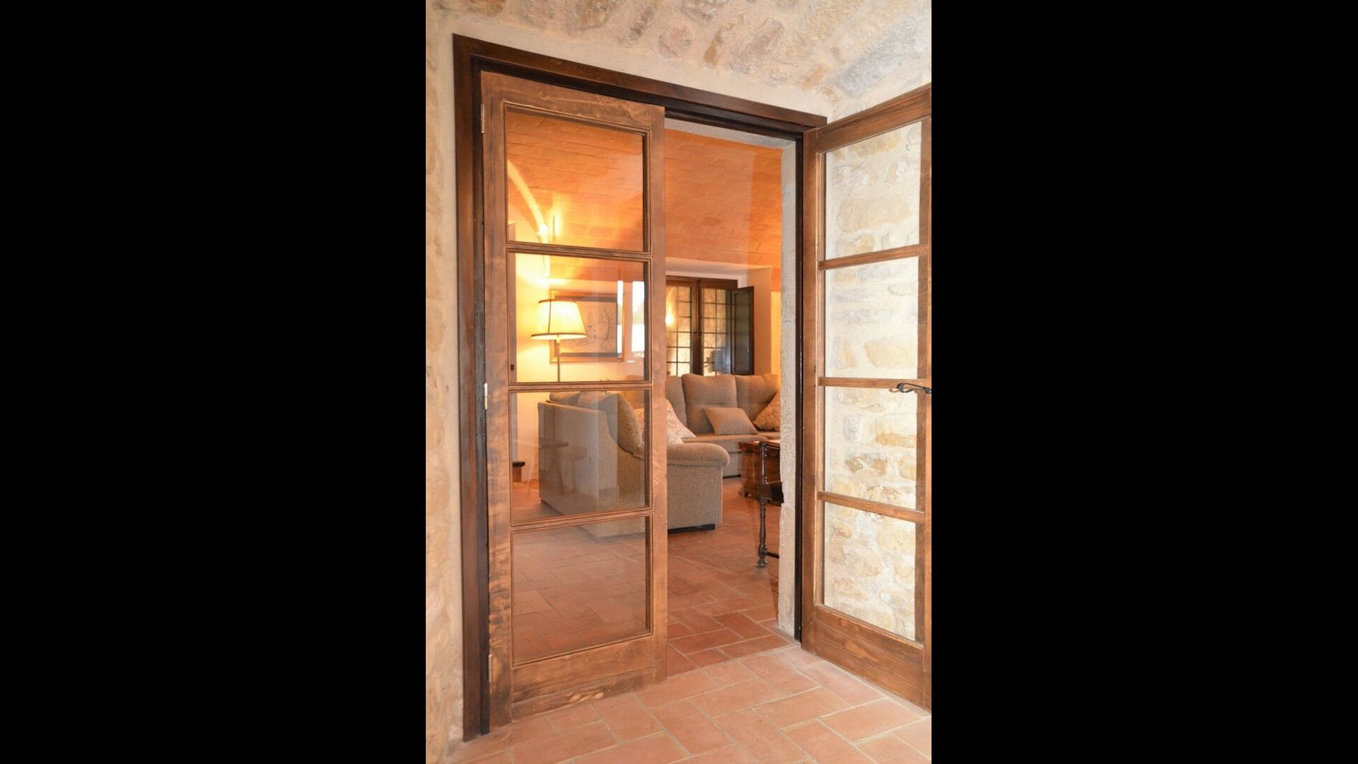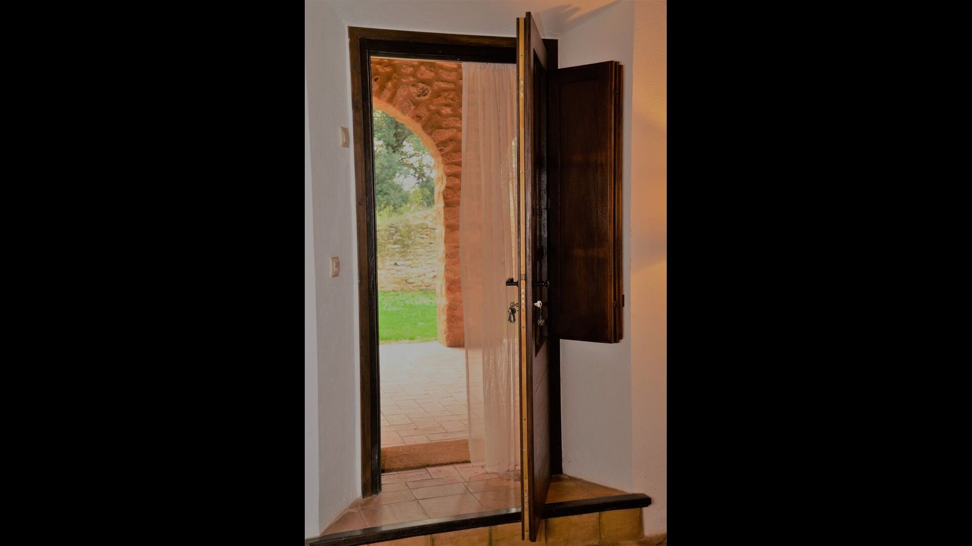 When you enter the ground floor from the pool area you will be lead into the large open kitchen and dining room. The interior and style of the kitchen is very authentic and tasteful, with a large wooden cupboard, wooden chairs and a cozy fireplace. It has a counter bar on one side, with two bar stools and is very well equipped with everything you might need, including; fridge, freezer, dishwasher, microwave and even a Nespresso machine. The dining room is also incredibly cozy with a, arched ceiling and with authentic limestone walls. It has a long wooden dining table with wooden benches. In the next room is the lounge room with comfortable couches and chairs. There is a TV and a DVD machine, and the house also has Wi-Fi, so you will be able to put your feet up and relax here, if desired. There is also a small bathroom with a toilet on this floor, so you do not have to go upstairs if needed. At the end of this part of the house, you will find an exit that takes you outside to a covered terrace with a large table. The perfect spot to dine or enjoy a cool drink at night time, in the lovely Catalan temperatures.