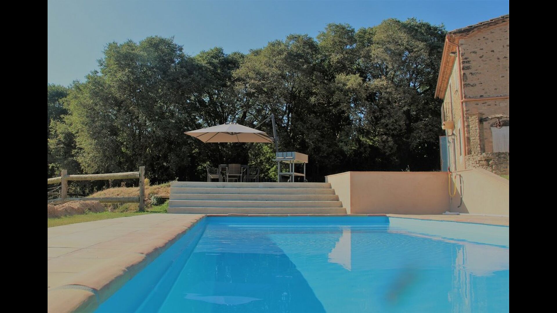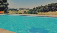 The holiday homeis located on a large property surrounded by beautiful nature. The pool area is located on the right side of the house. Here you will find plenty of sunbeds lined up next to the pool, with a covered area when in need of shade from the long sunny days. The pool area has a great view looking over green fields with grazing sheep, and the local train passing through the valley. There is also a large table by the pool area, where you can enjoy outdoor meals.