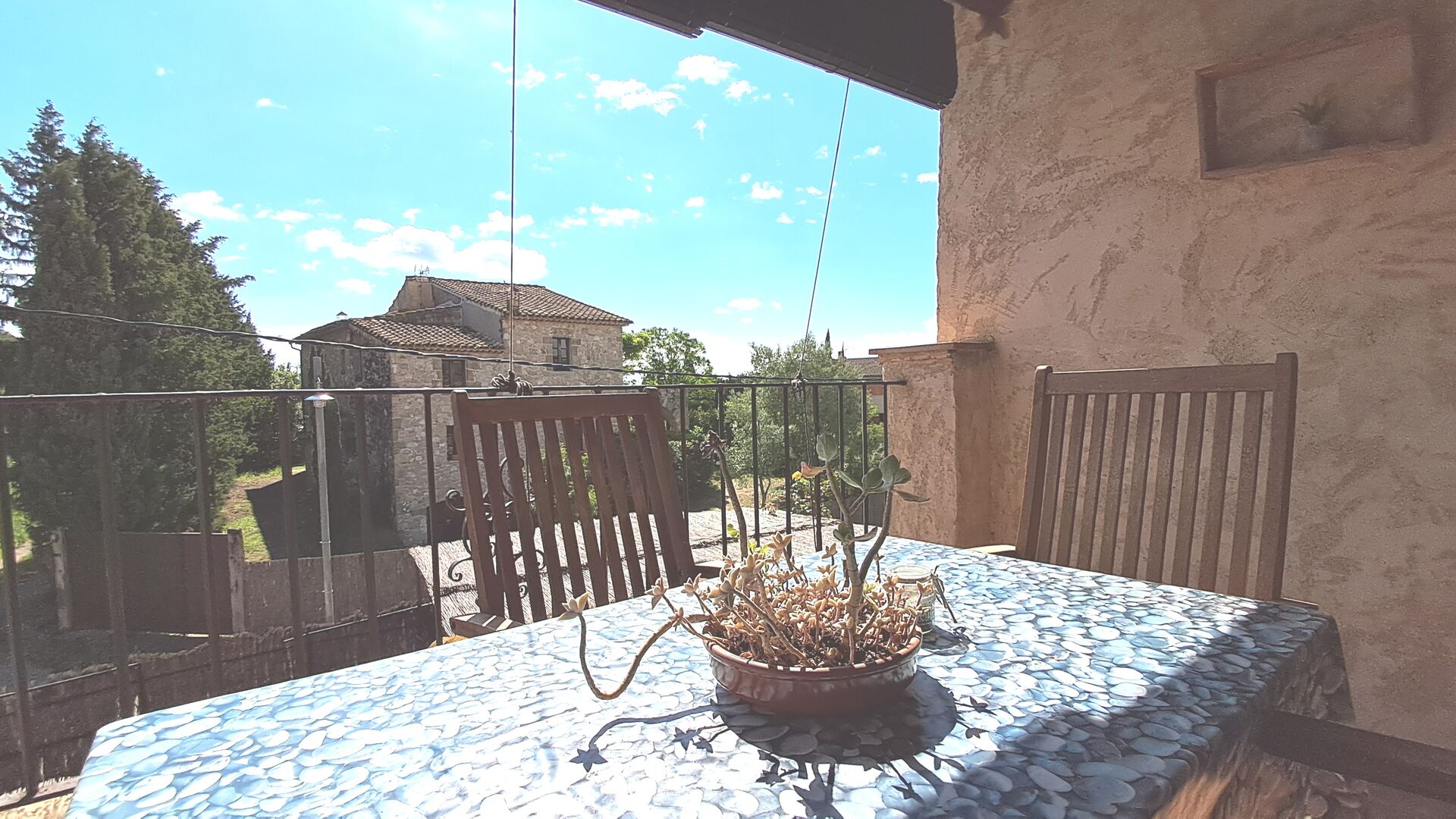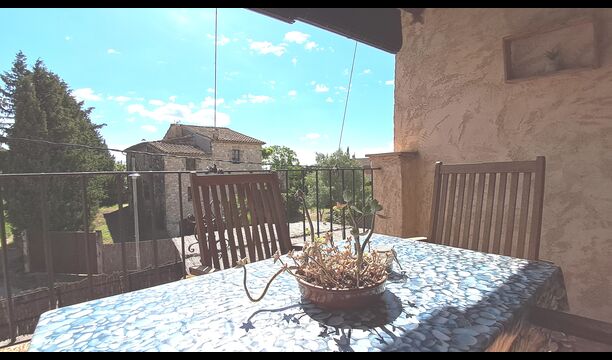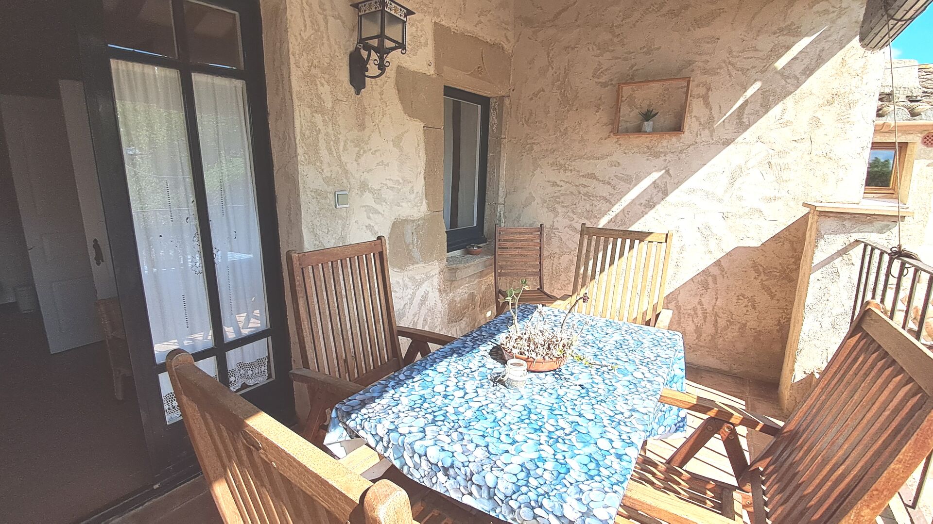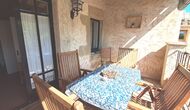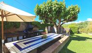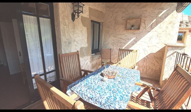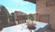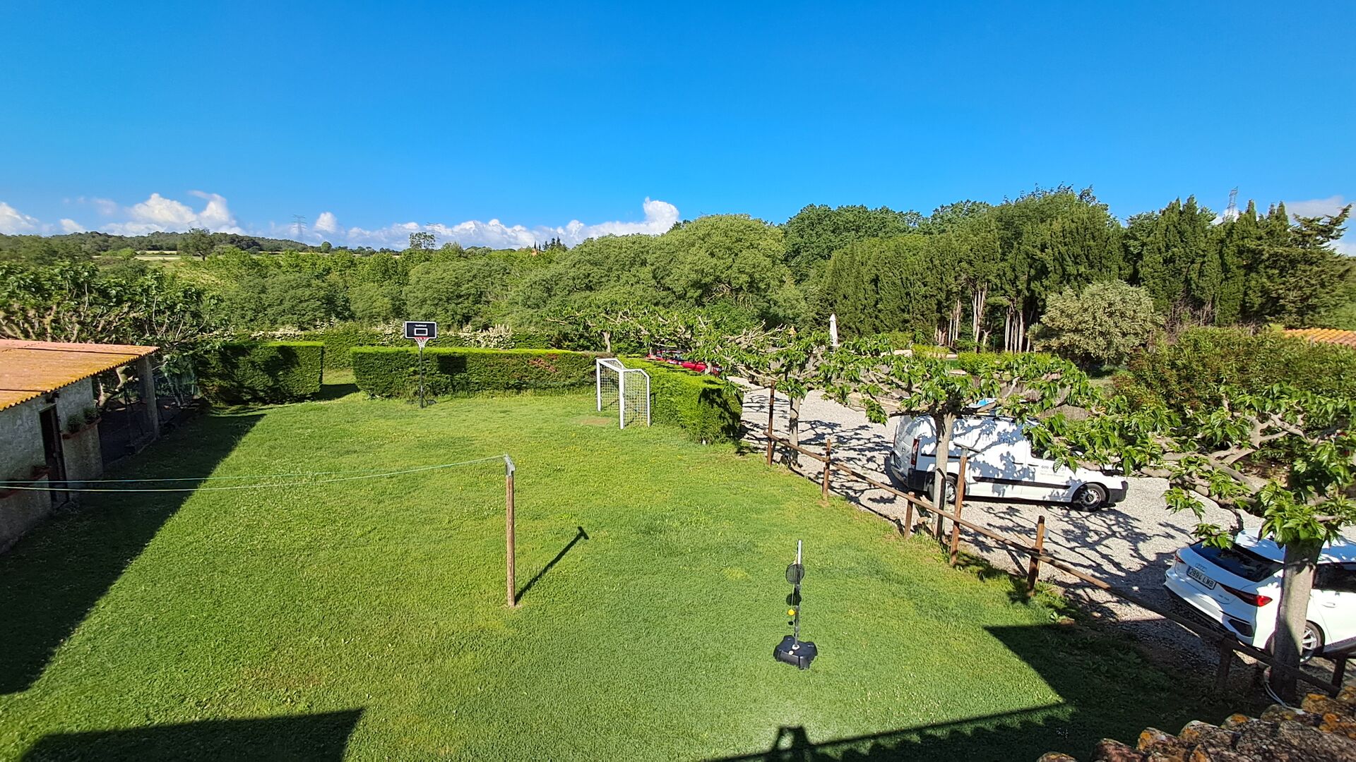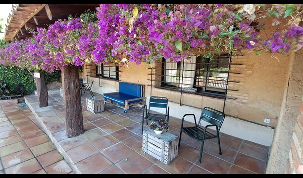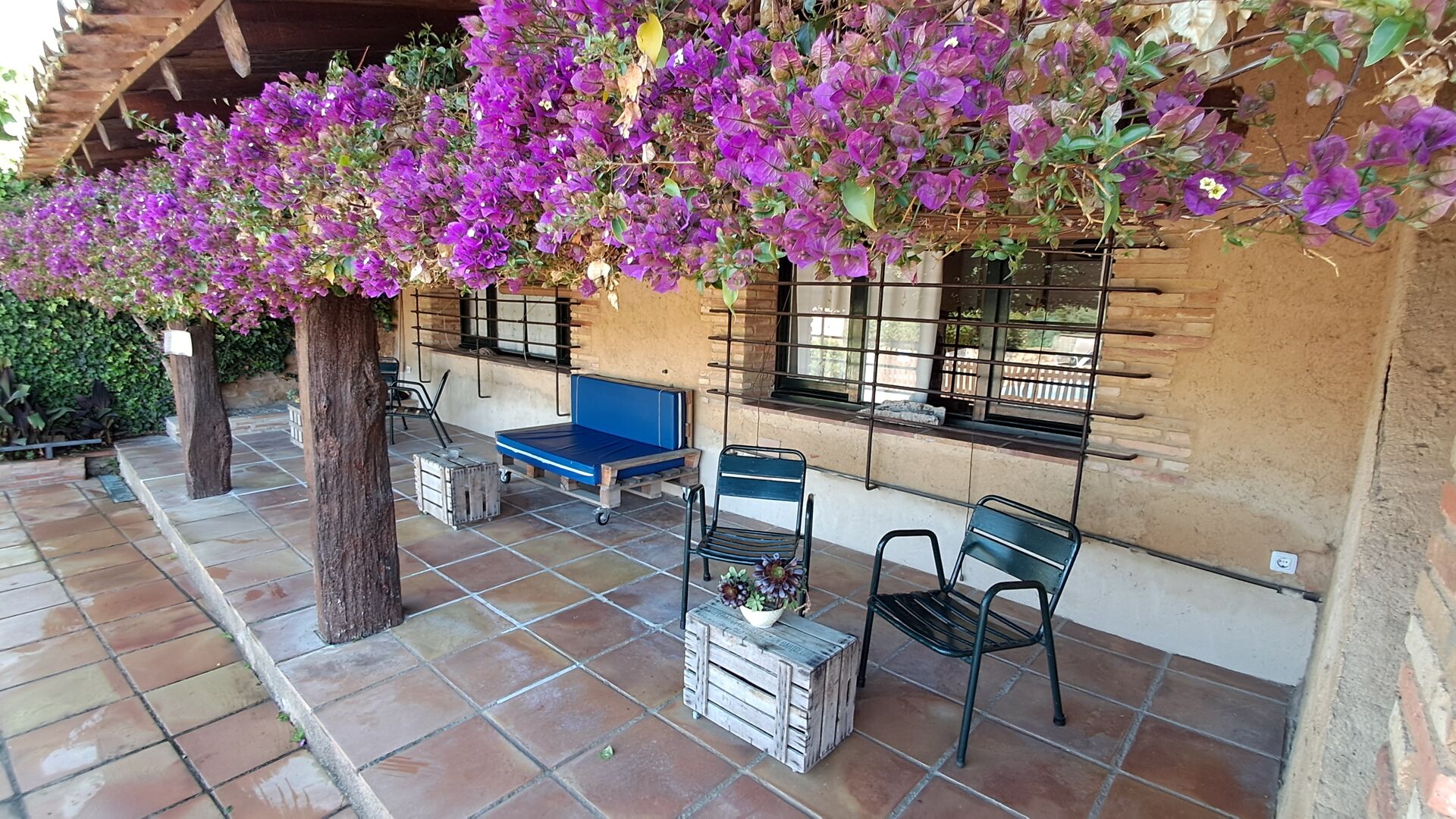 Es gibt auch die überdachte Terrasse mit Stühlen, einem kleinen Tisch und – weiter hinten – ein an der Wand befestigtes Steinsofa. Im Garten finden Sie außerdem eine Tischtennisanlage und einen kleinen Fußballplatz.
