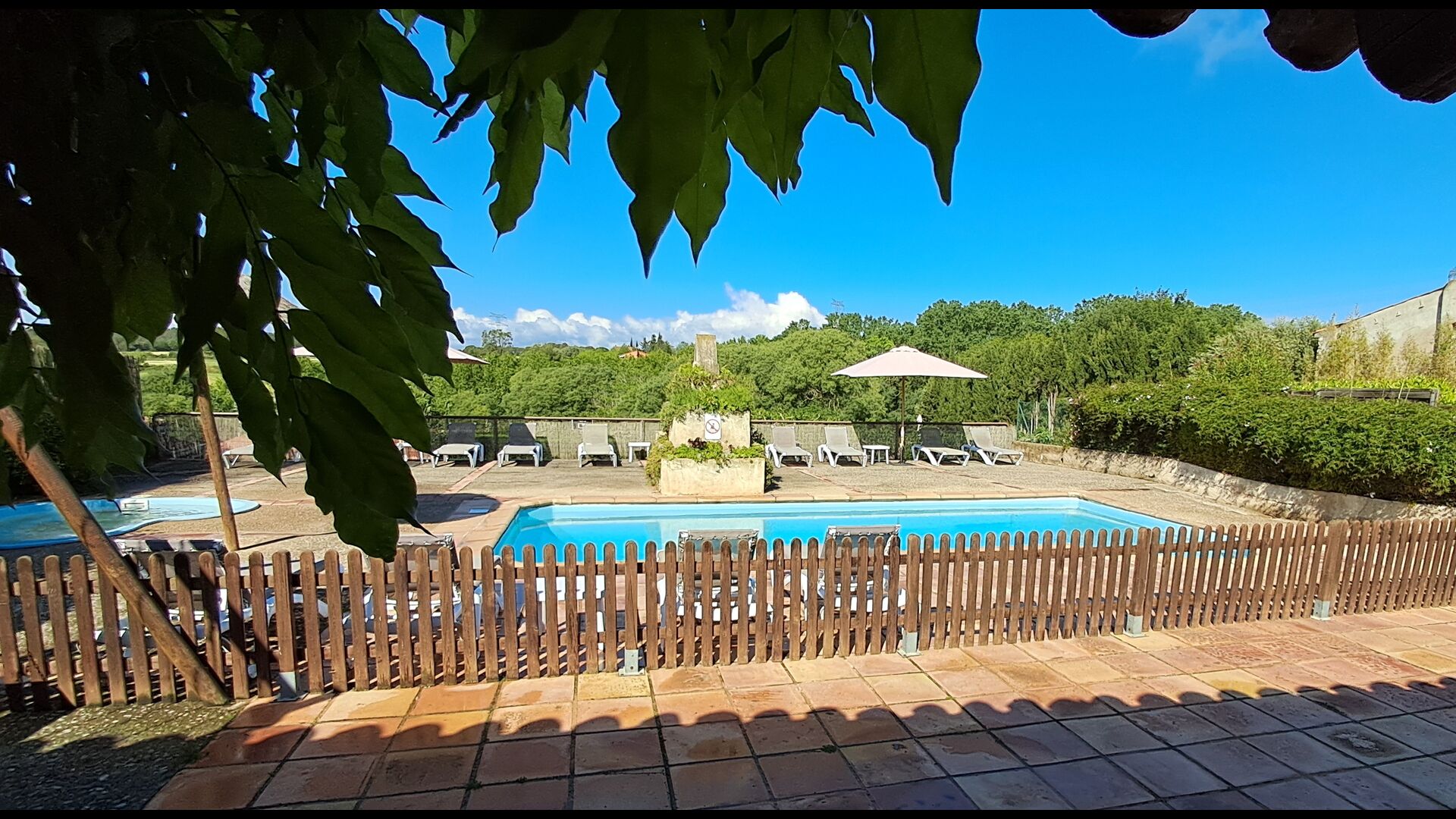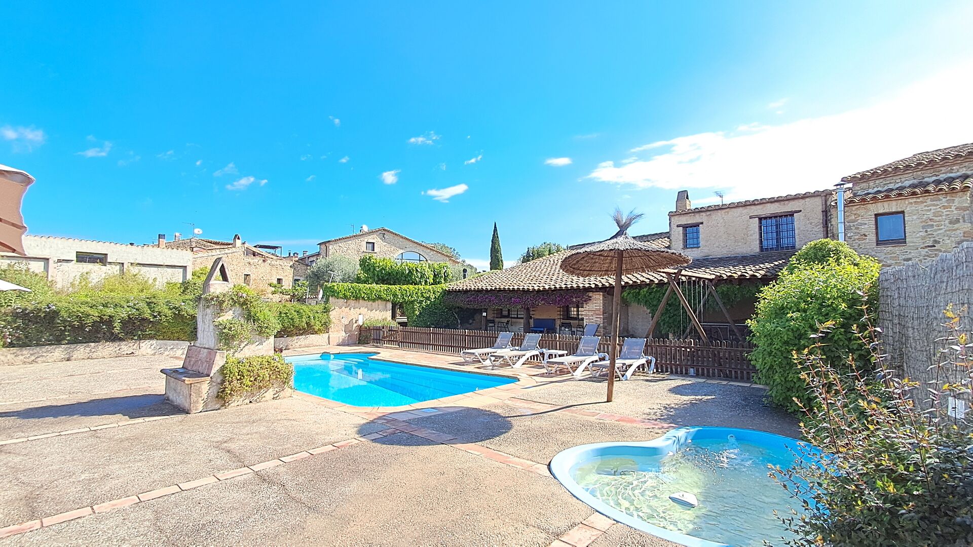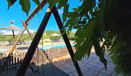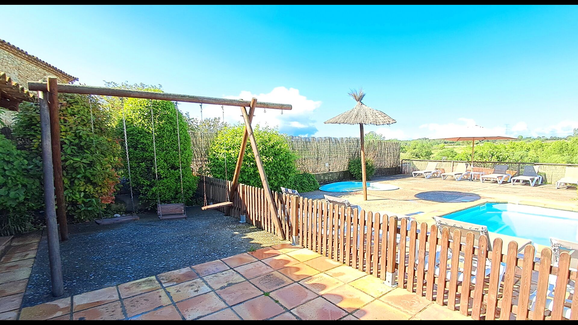 Eine davon ist der gemeinsame, gemeinschaftliche Pool mit einem separaten runden Pool für die Kinder. Beide Pools befinden sich im selben Bereich, der eingezäunt ist. Es gibt mehrere Sonnenliegen zum Zurücklehnen und Entspannen. Auf der anderen Seite des Zauns gibt es eine Schaukel für die Kinder.