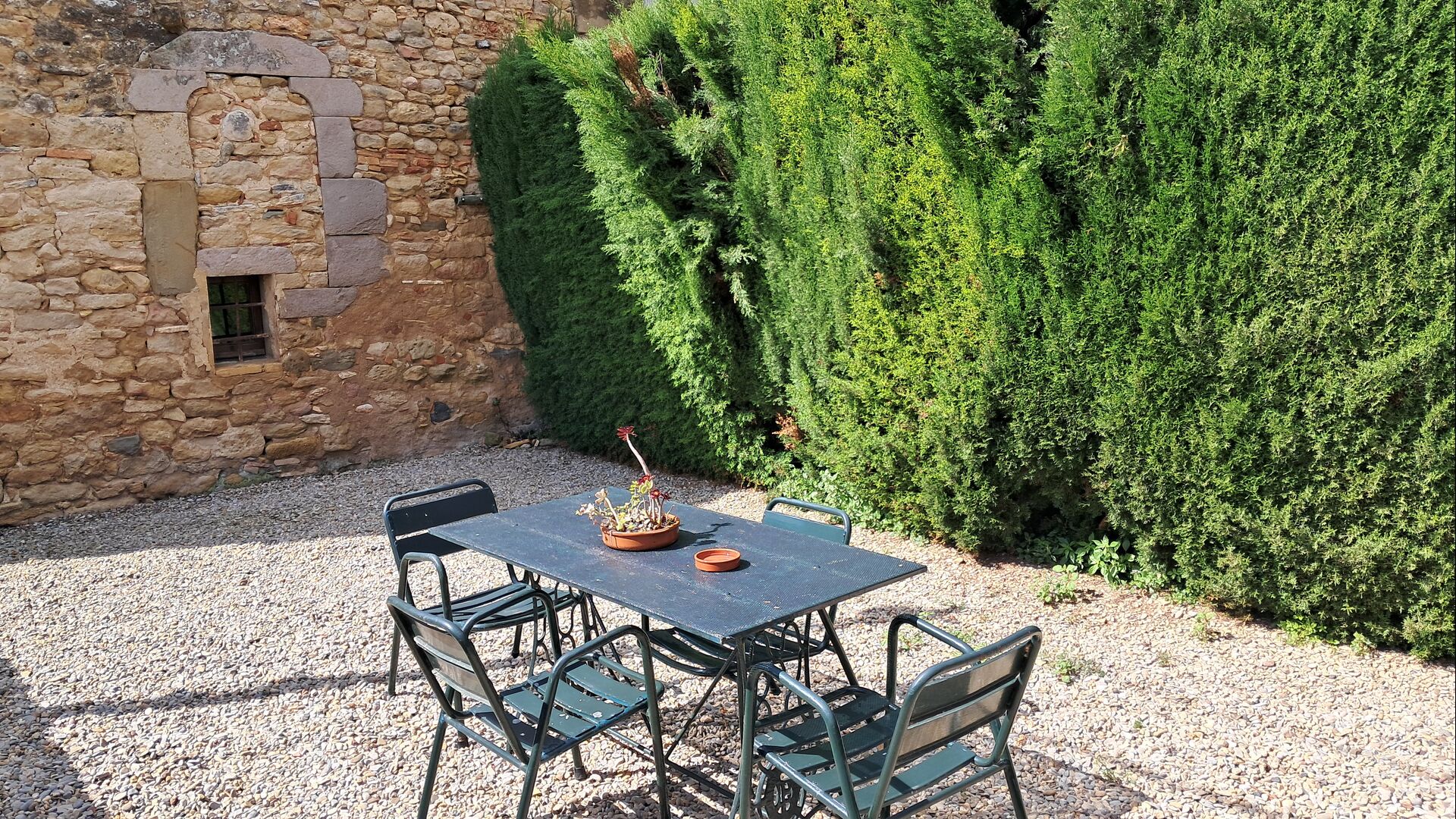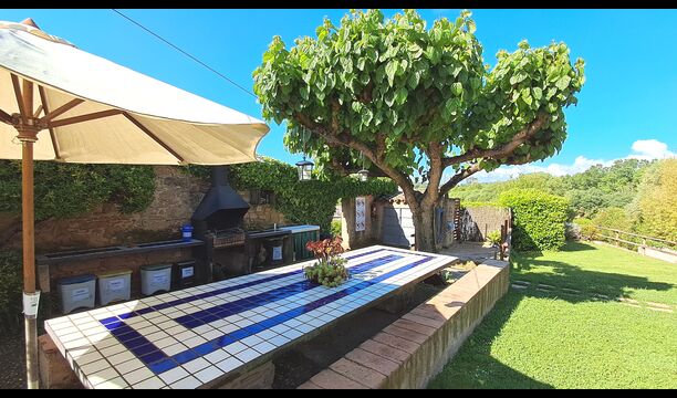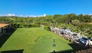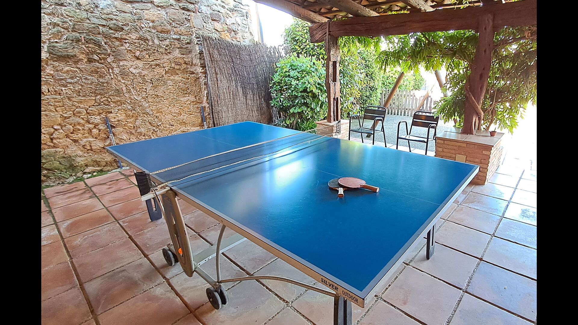 Dort gibt es auch die überdachte Terrasse mit Stühlen, einem kleinen Tisch und – weiter hinten – einem an der Wand befestigten Steinsofa. Im Garten finden Sie auch eine Tischtennisplatte und einen kleinen Fußballplatz.