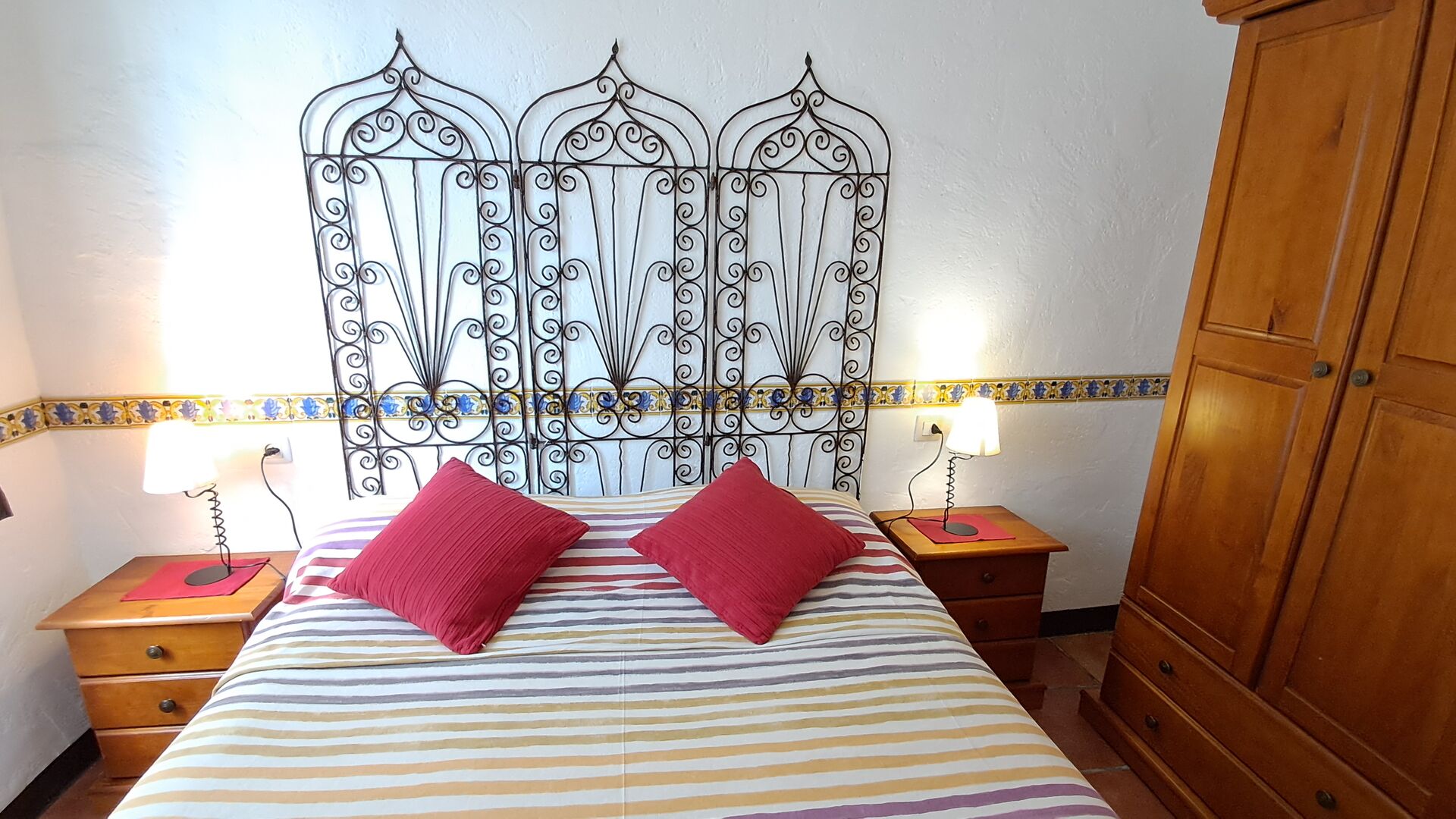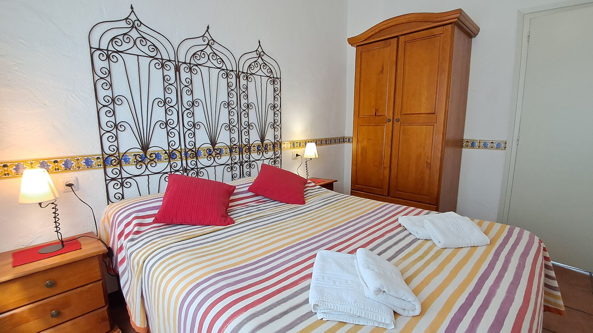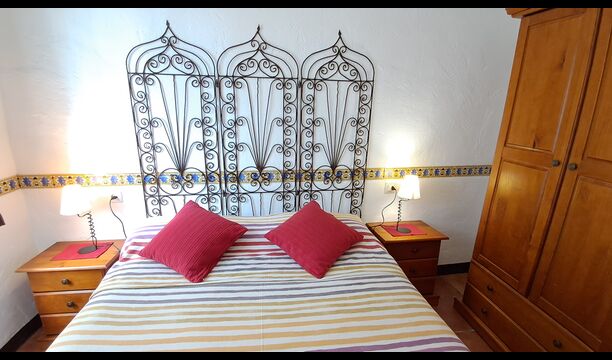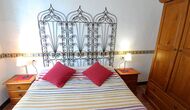 Es gibt zwei gemütliche Schlafzimmer, eines mit zwei Doppelbetten, von wo aus Sie auch Zugang zur privaten Terrasse haben. Es hat Ventilatoren für warme Nächte. Dann gibt es noch das zweite Schlafzimmer, ein Doppelzimmer, und hier gibt es einen Deckenventilator, um die Temperatur angenehm zu halten. Die beiden Schlafzimmer teilen sich das Badezimmer mit Badewanne.