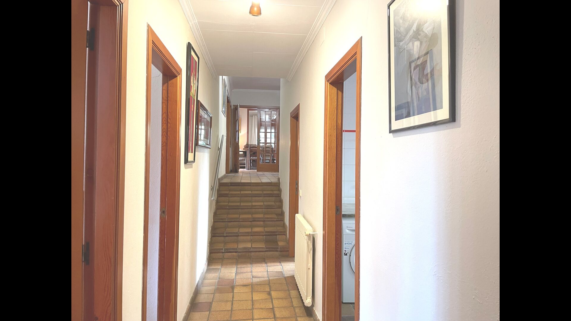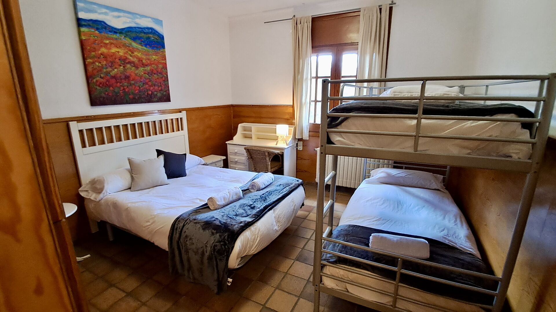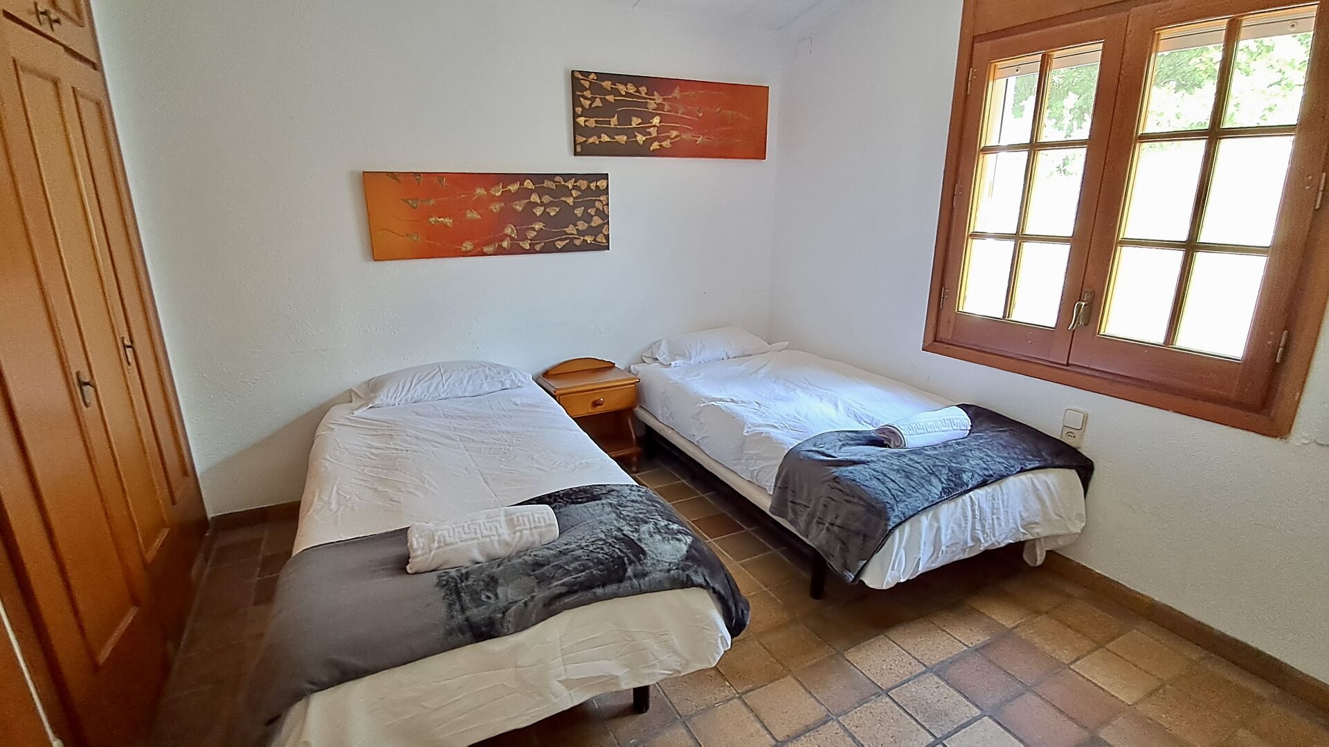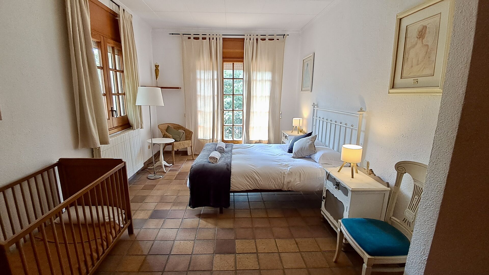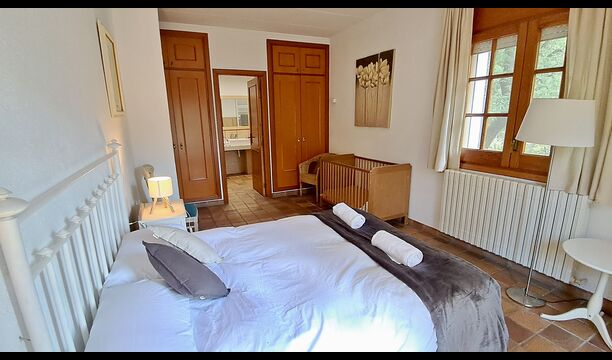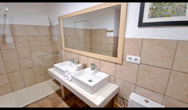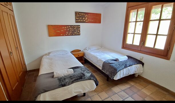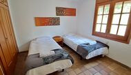 Der andere Gang erstreckt sich über die gesamte Länge des Hauses und die Schlafzimmer bieten Blick auf den Golfplatz. Hier finden Sie ein Doppelzimmer mit Doppelbett, ein Doppelzimmer mit zwei Einzelbetten (als Doppelbett angeordnet), dann ein Schlafzimmer mit Doppelbett und ein Etagenbett (ideal für eine Familie). Diese Zimmer teilen sich ein Badezimmer mit Dusche. Am Ende gibt es ein Zimmer in Suite-Größe mit Doppelbett, eigenem Bad und direktem Zugang zur Terrasse. Es gibt ein Babybett im Zimmer und bei Bedarf auch Platz für ein Zustellbett.