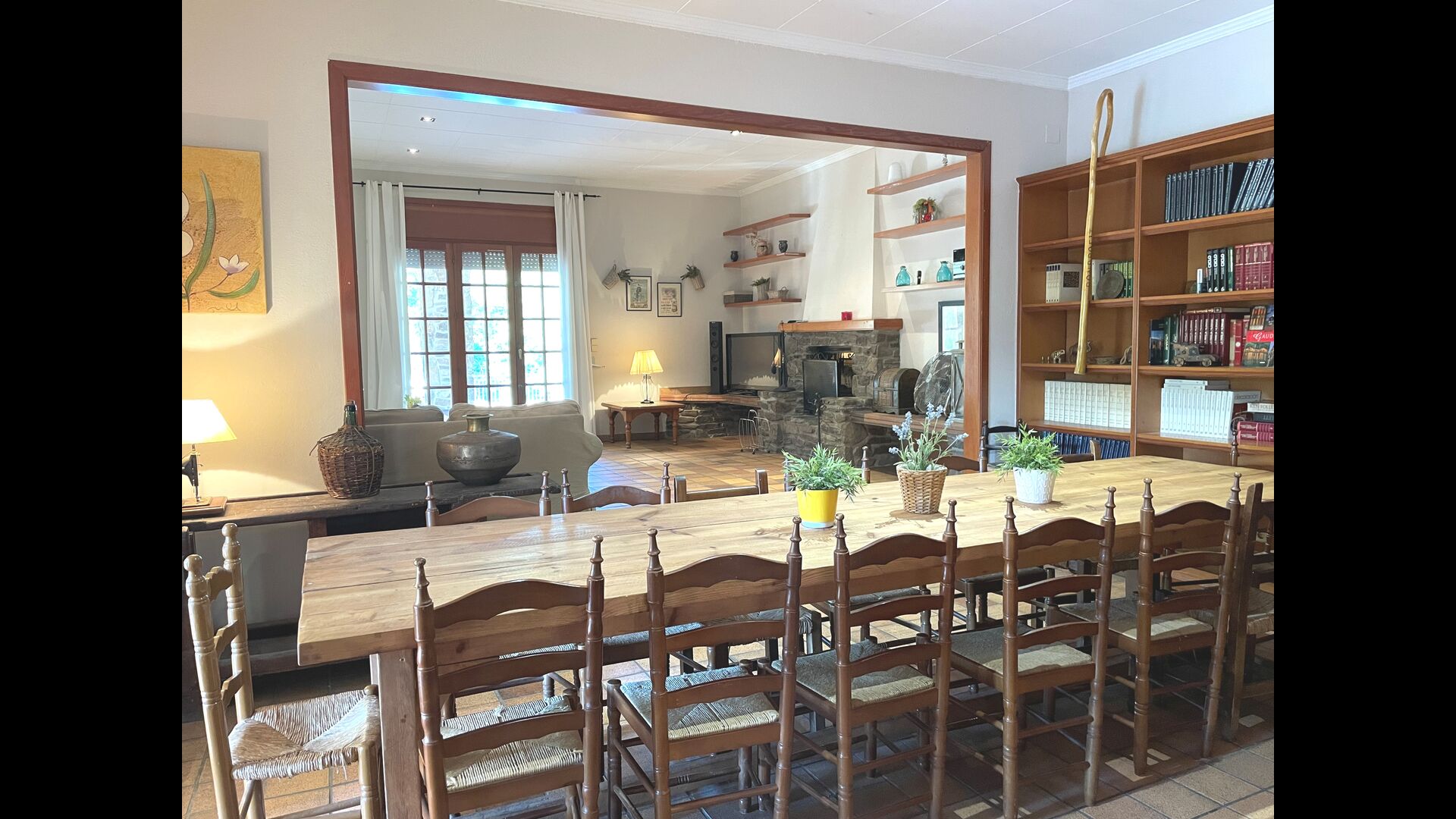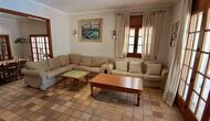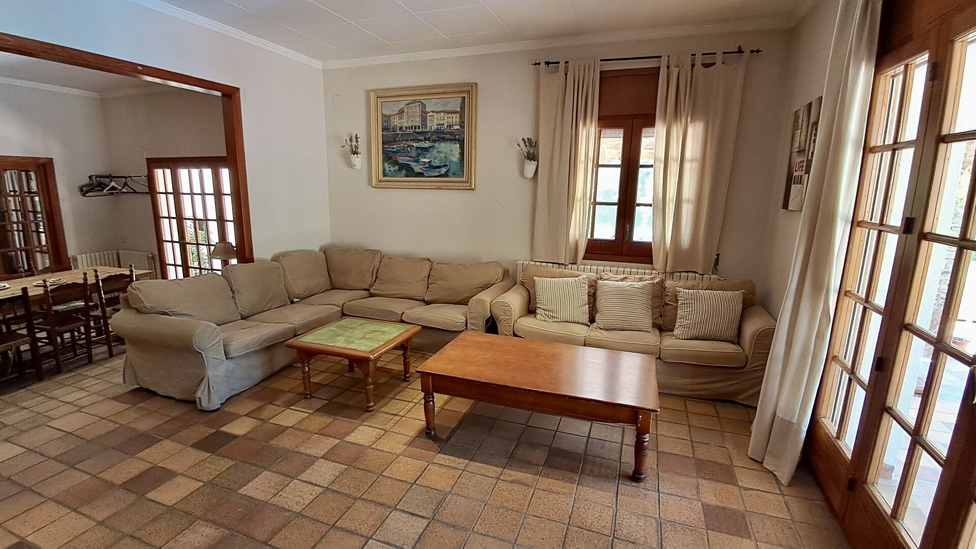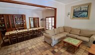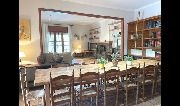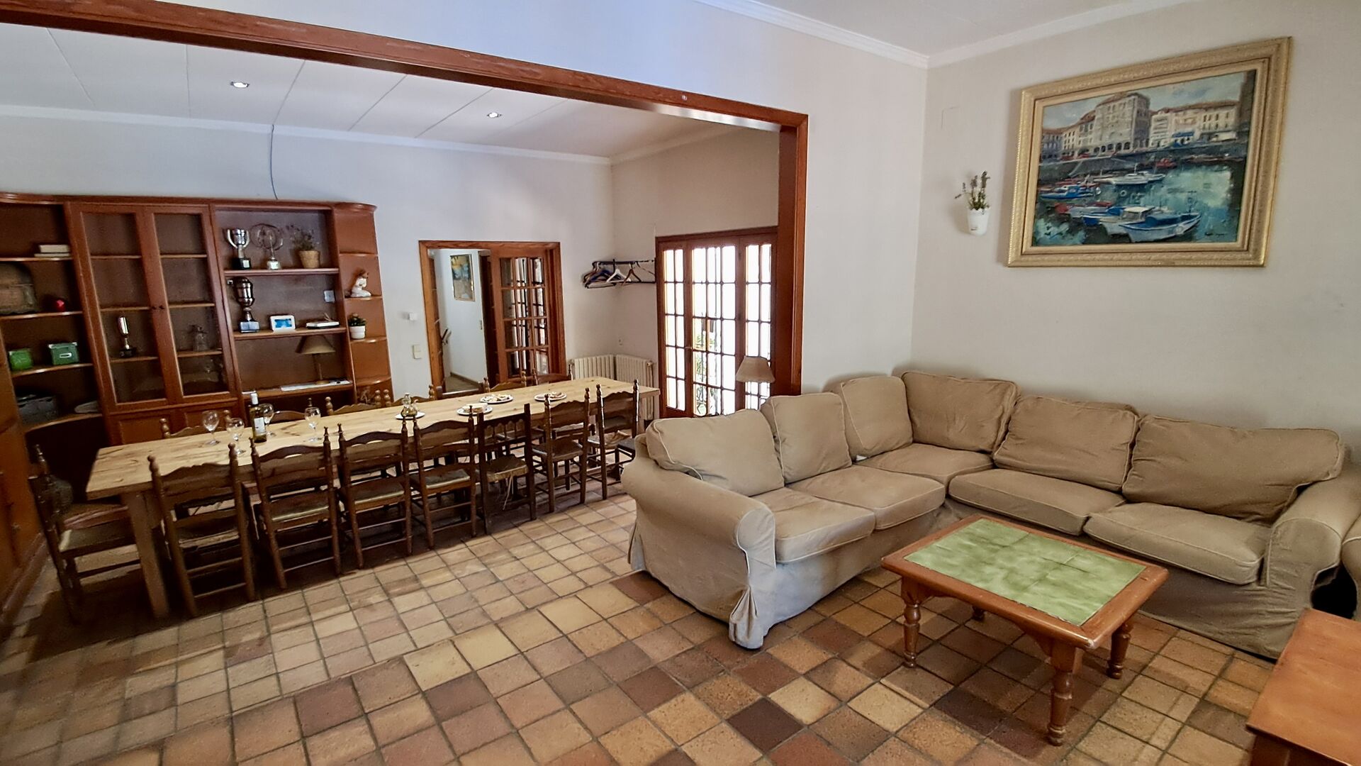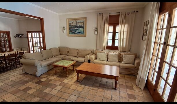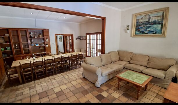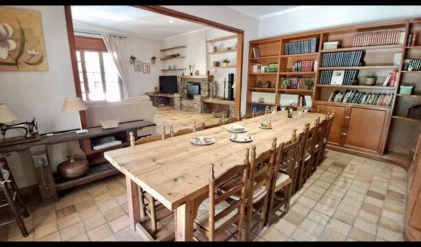 Das Haus verfügt über einen sehr schönen und sehr großen Gemeinschaftsraum mit einem langen Esstisch an einem Ende und einer großen Sofaecke. Große Doppeltüren ermöglichen sowohl den Blick als auch den Zugang zum Poolbereich.