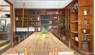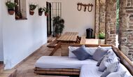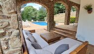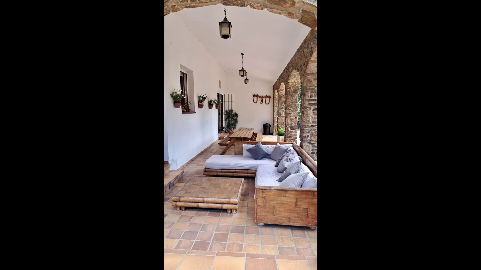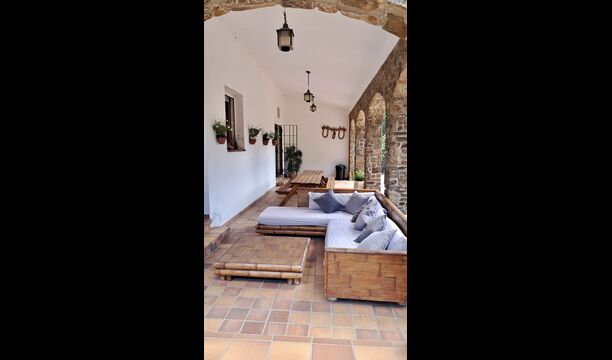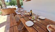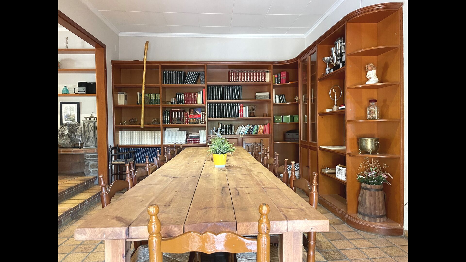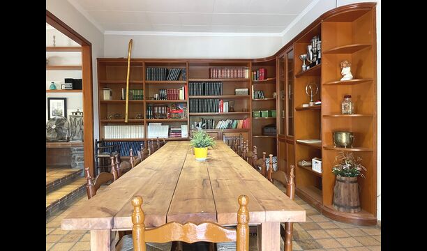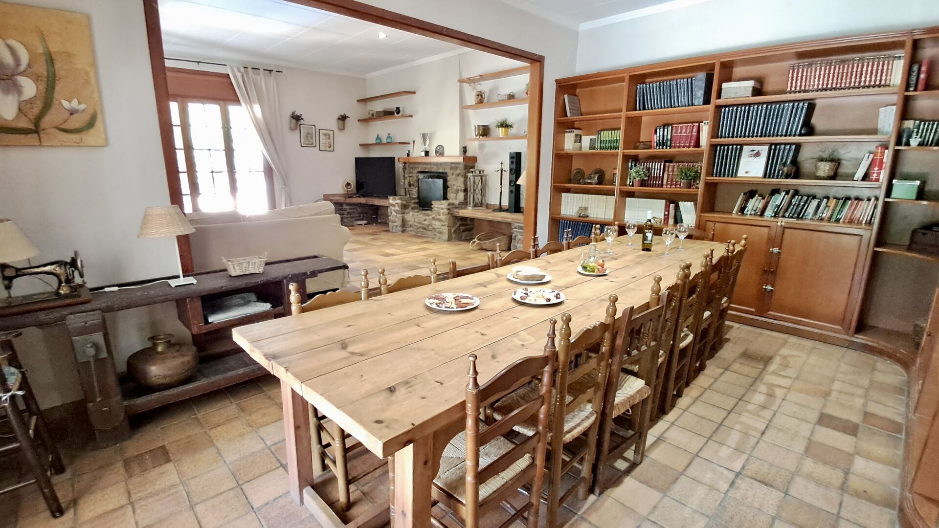 Das Haus verfügt über einen sehr schönen und sehr großen Gemeinschaftsraum mit einem langen Esstisch an einem Ende und einer großen Sofaecke. Große Doppeltüren ermöglichen sowohl den Blick als auch den Zugang zum Poolbereich.