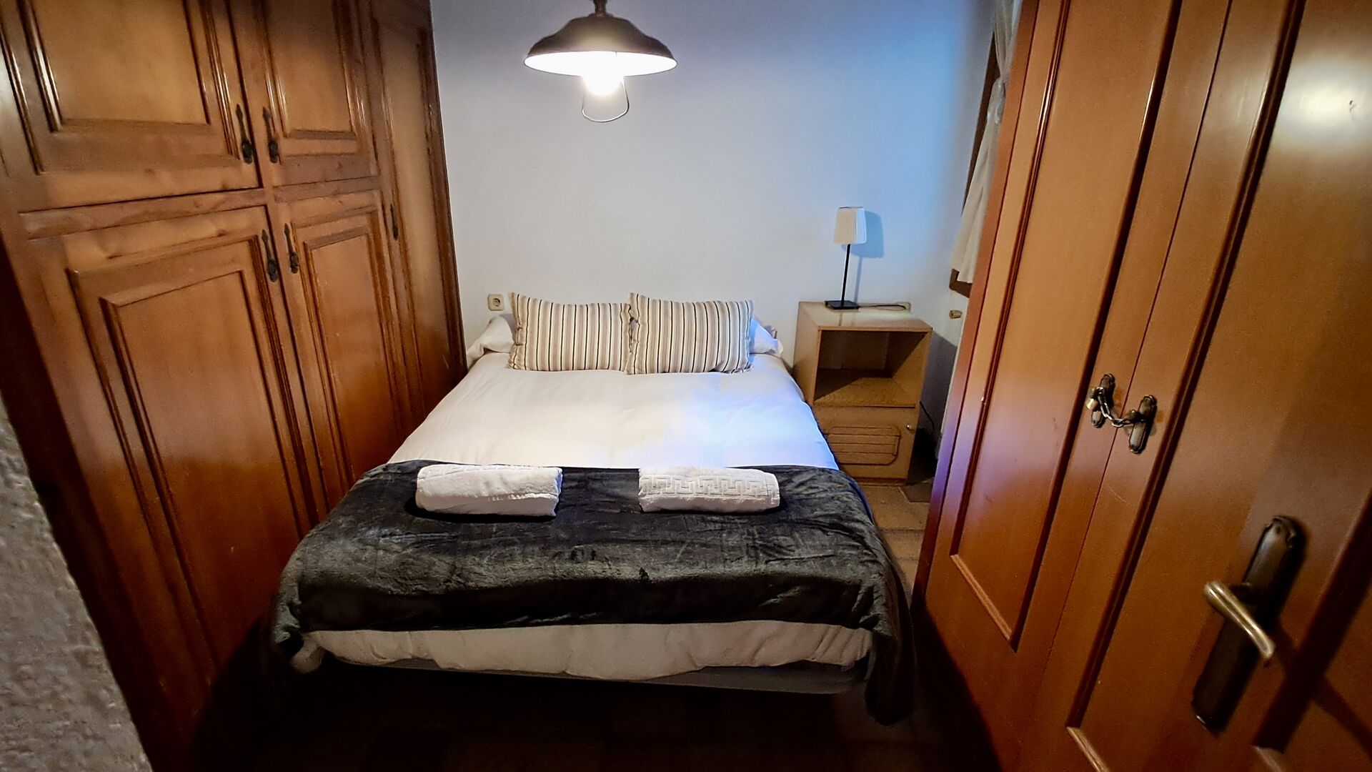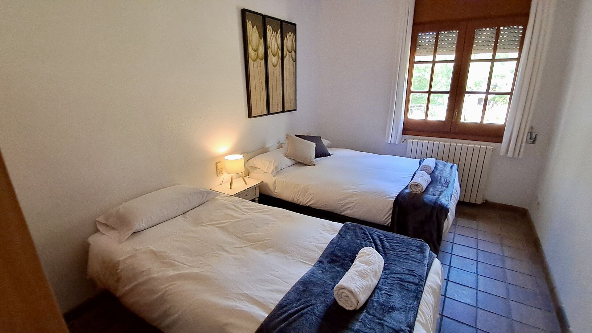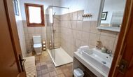 Zwei Gänge verteilen die Schlafzimmer. Die Schlafzimmer sind schlicht, aber gut eingerichtet und liegen mit 3 Schlafzimmern und 1 Badezimmer über eine Treppe auf einer Seite. Hier finden Sie 2 Dreibettzimmer mit Doppelbett und Einzelbett und ein Zweibettzimmer mit zwei Einzelbetten. Sie teilen sich ein Badezimmer mit Dusche.