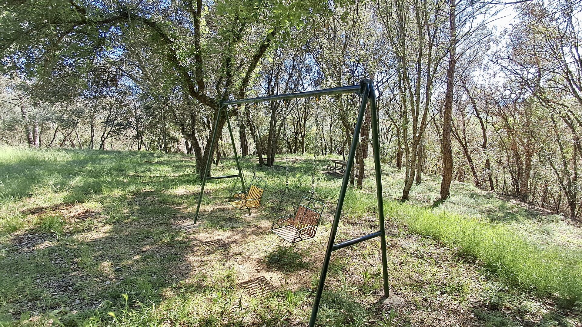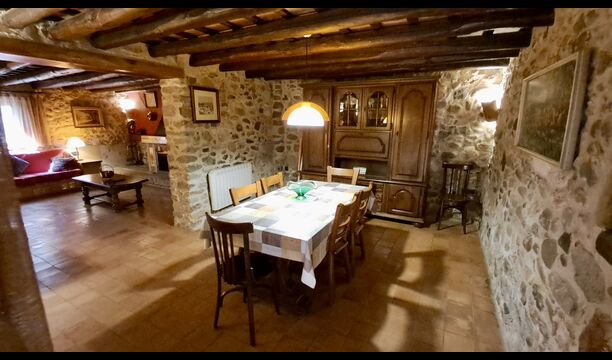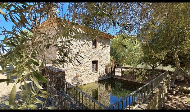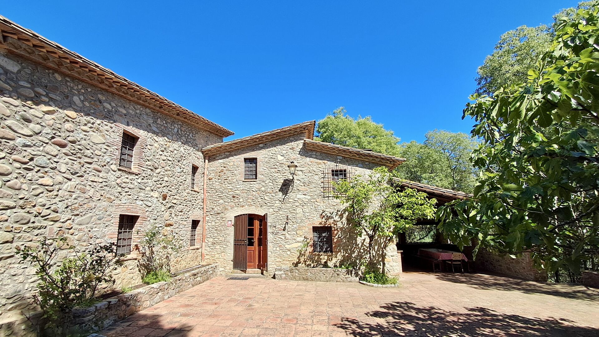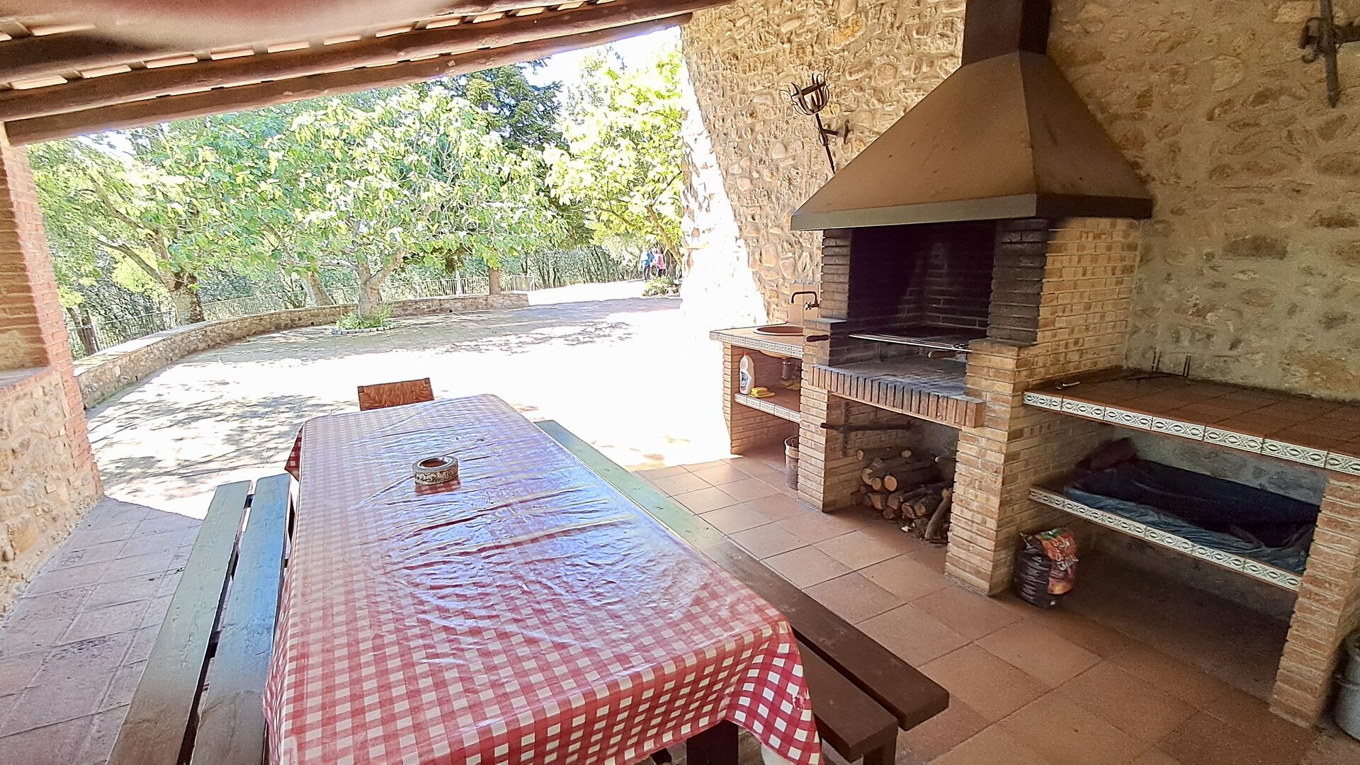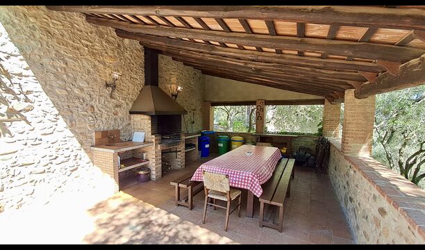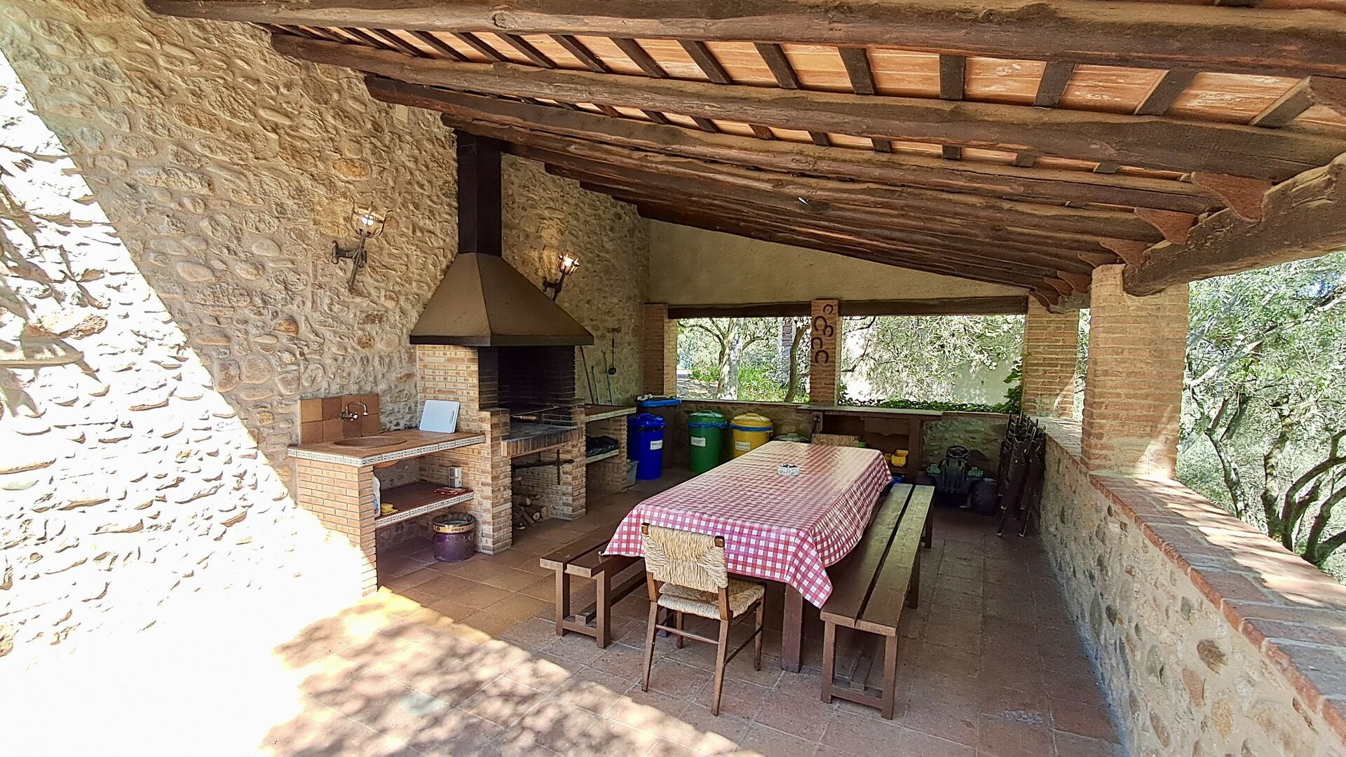 Hier werden die Gäste von zwei riesigen Zypressen nahe dem Eingang des Hauses begrüßt. Vor langer Zeit war dies ein Signal für Fremde, dass das Haus eine Mahlzeit und ein Bett zum Schlafen anbot (nur eines bedeutete, dass man gerne eine Mahlzeit bekommen durfte). Der vordere Terrassenbereich ist groß und an der Seite des Hauses befindet sich ein geräumiger überdachter Grillplatz mit Außenküche und einem schönen Blick über das Tal.