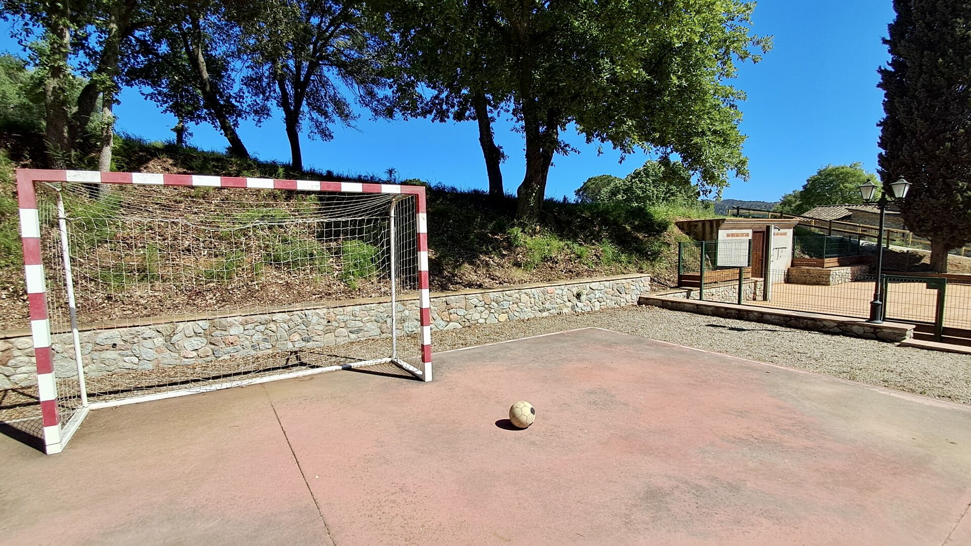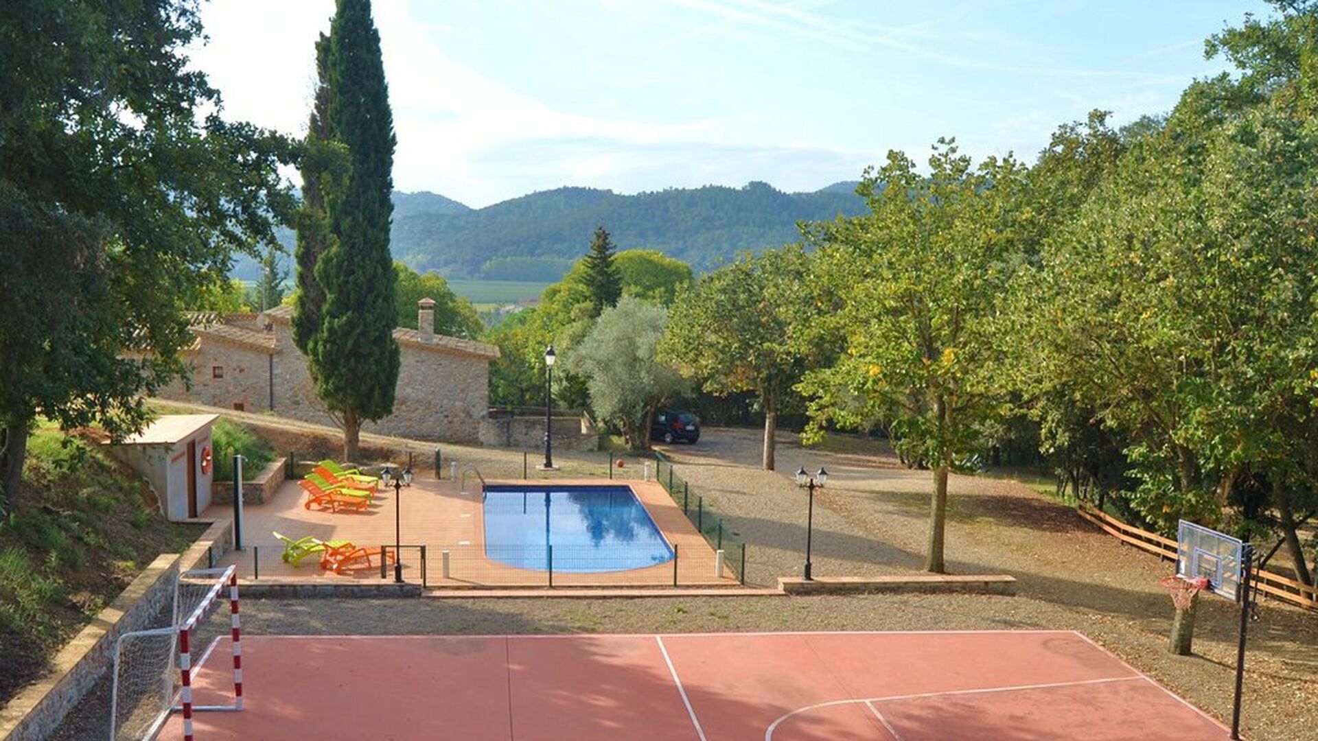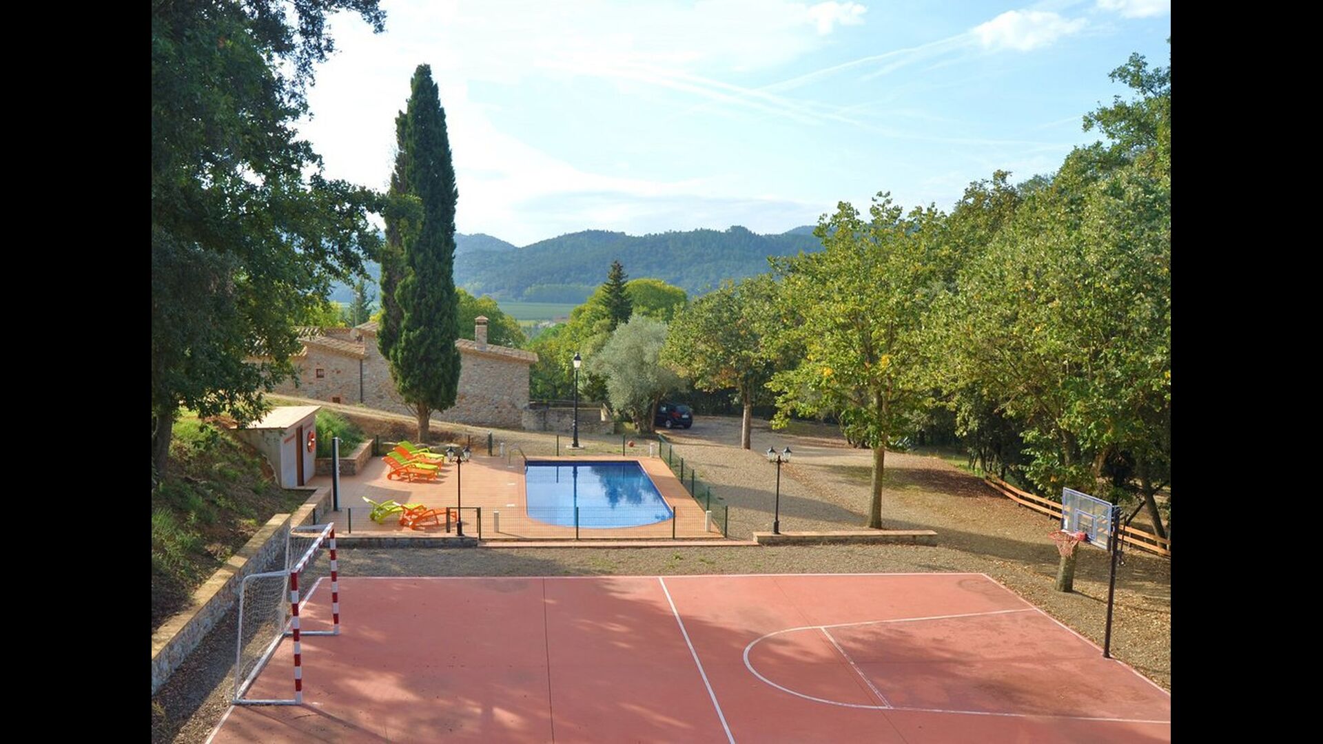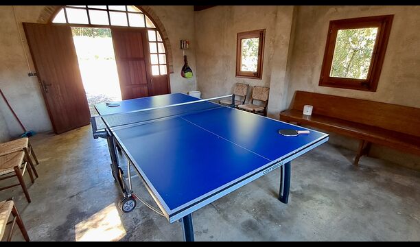 Der Garten verfügt über einen schönen eingezäunten Poolbereich mit vielen Liegestühlen und hier gibt es auch einen Bereich zum Fußball- oder Basketballspielen. An einem kleinen Häuschen im hinteren Teil ist eine Tischtennisplatte und eine kleine Sitzecke aufgestellt. Der gesamte Außenbereich ist riesig und die Aussicht hier ist atemberaubend und von hier aus kann man wirklich die Stille und die atemberaubende Natur genießen.