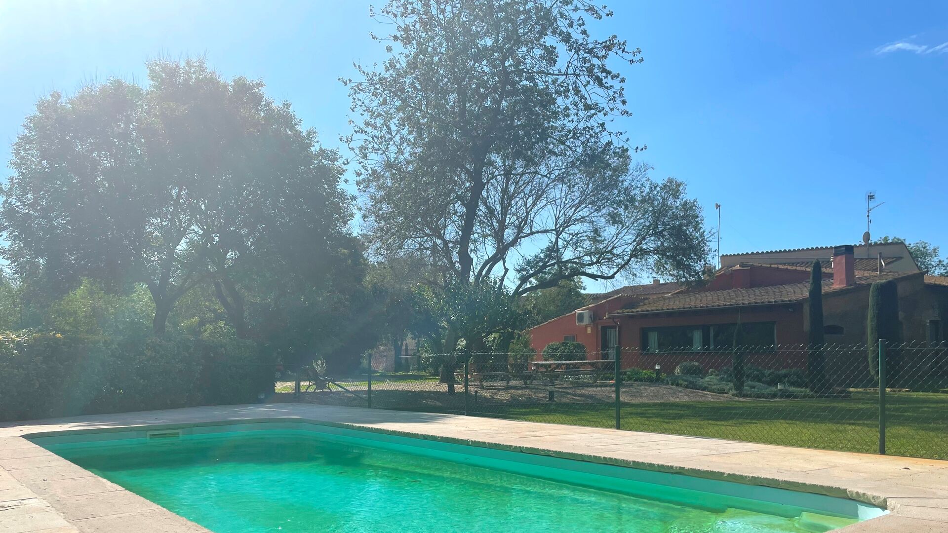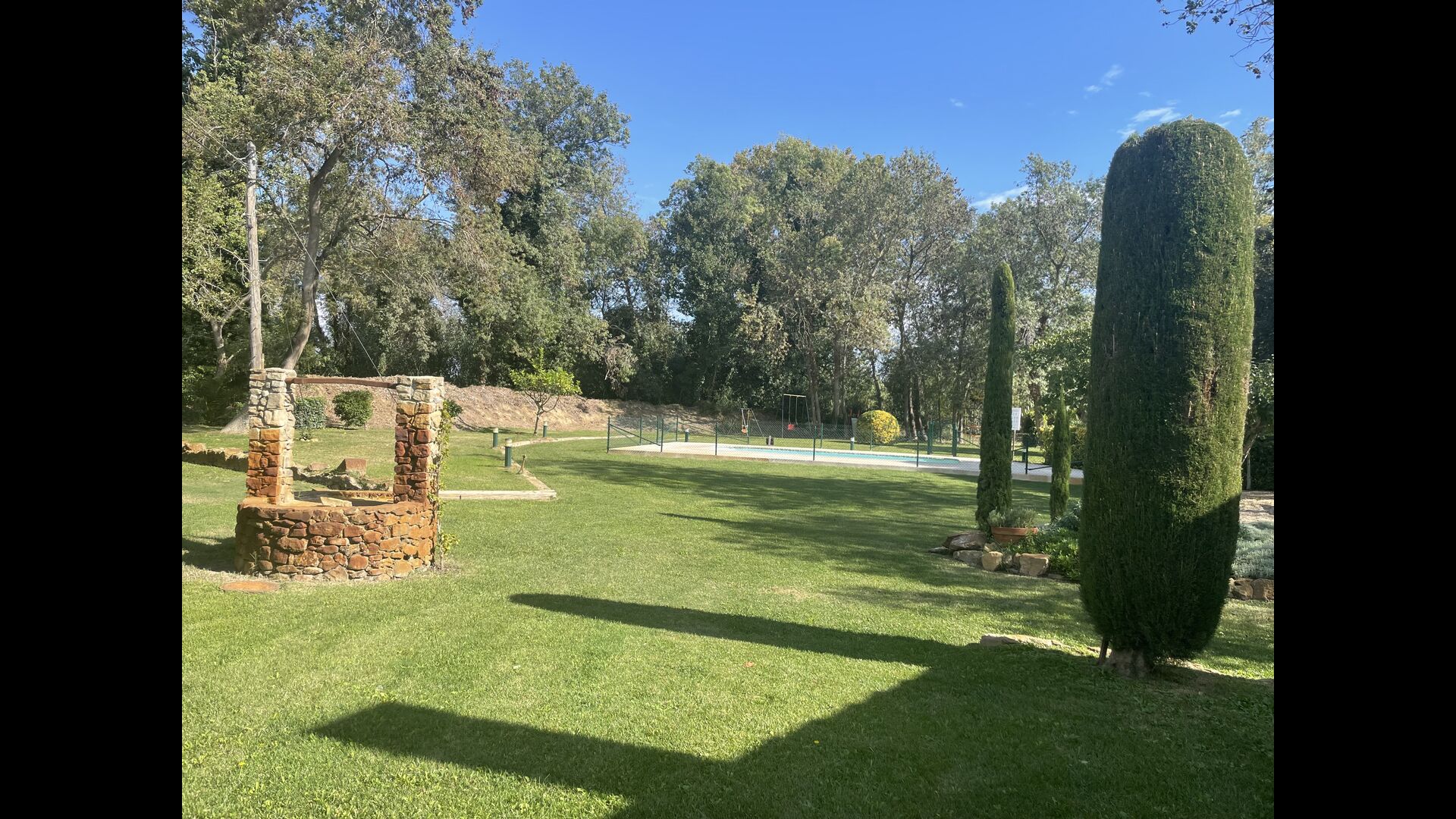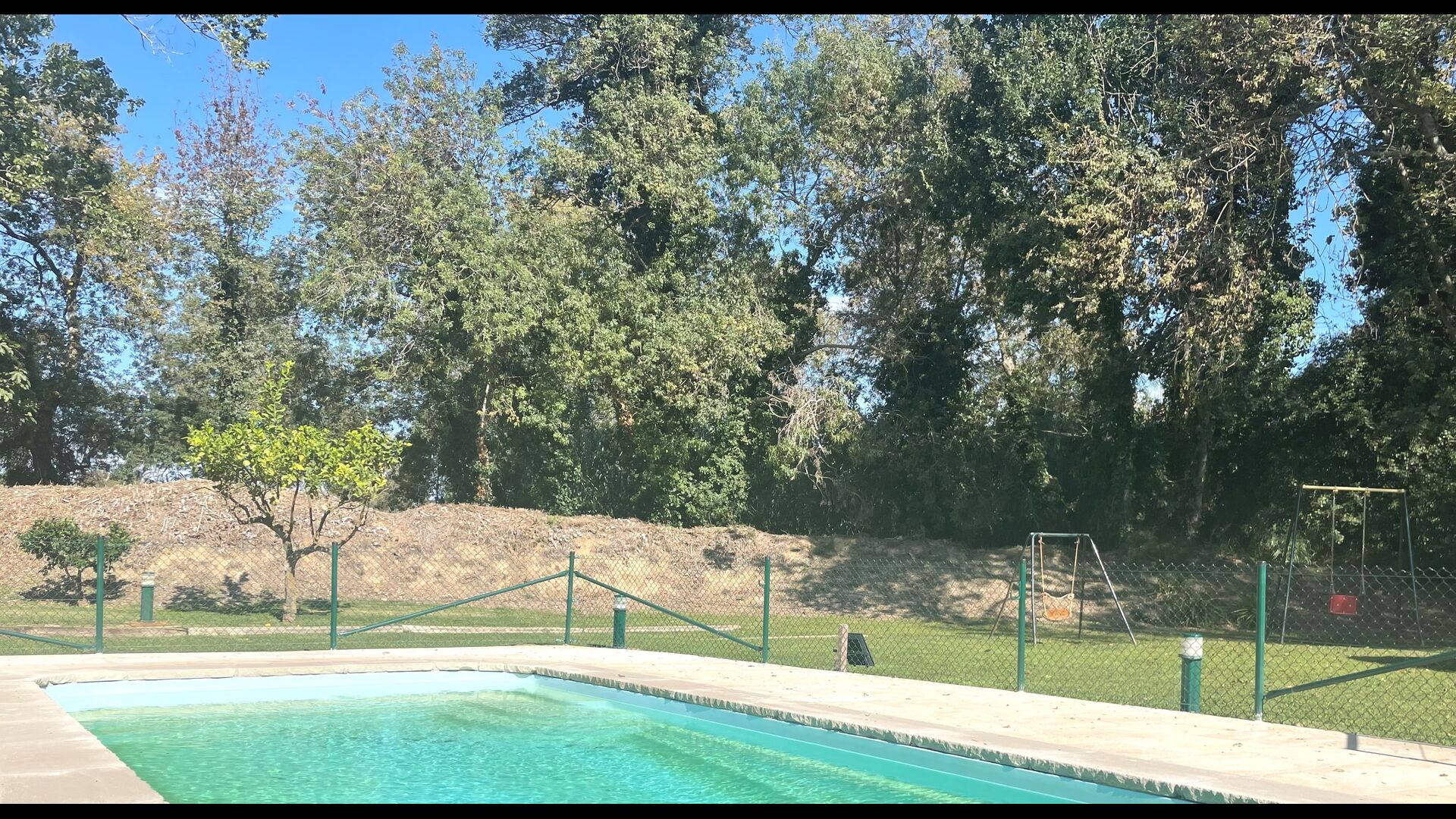 Die größte Qualität des Anwesens ist jedoch der sehr weitläufige und schöne Garten mit dem Swimmingpool (umzäunt zum Schutz kleiner Kinder), der Terrasse neben dem Swimmingpool und der großen Liegewiese mit Fußballtore und ein Spielplatz am anderen Ende.