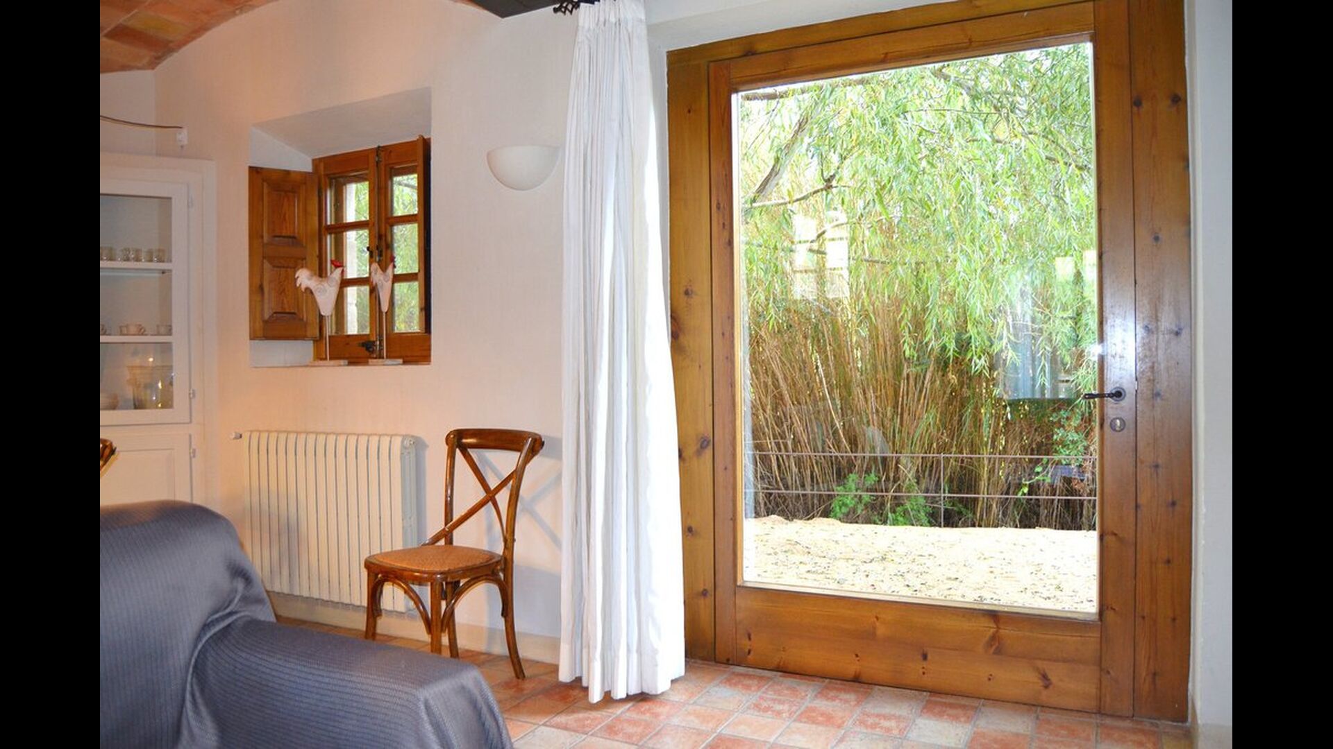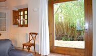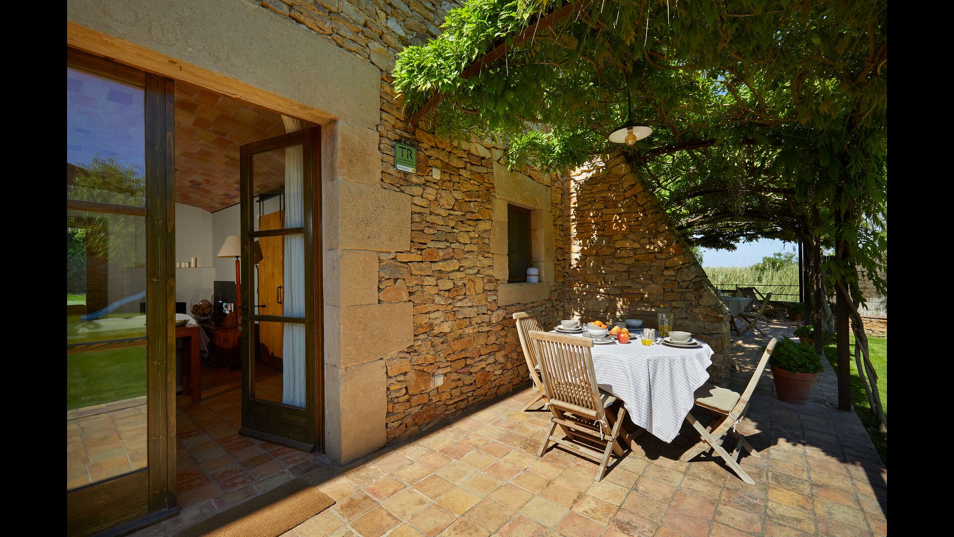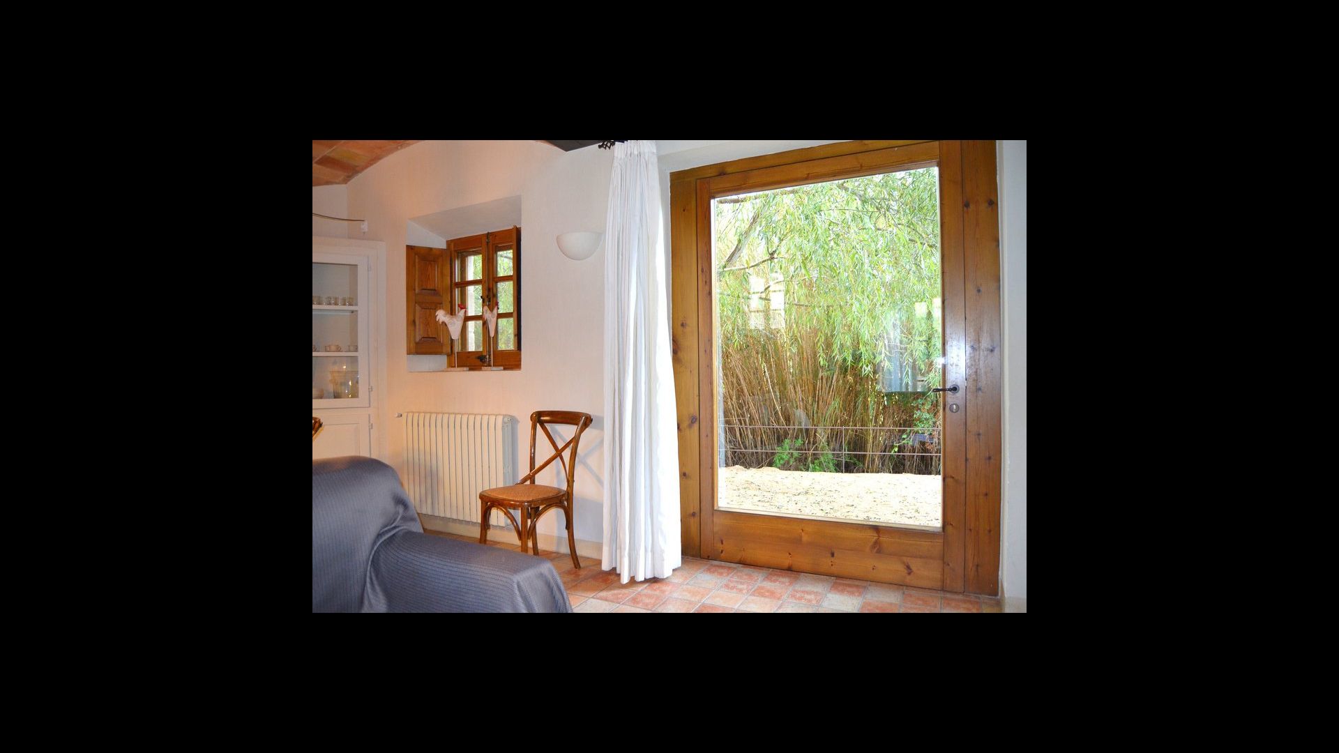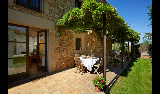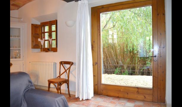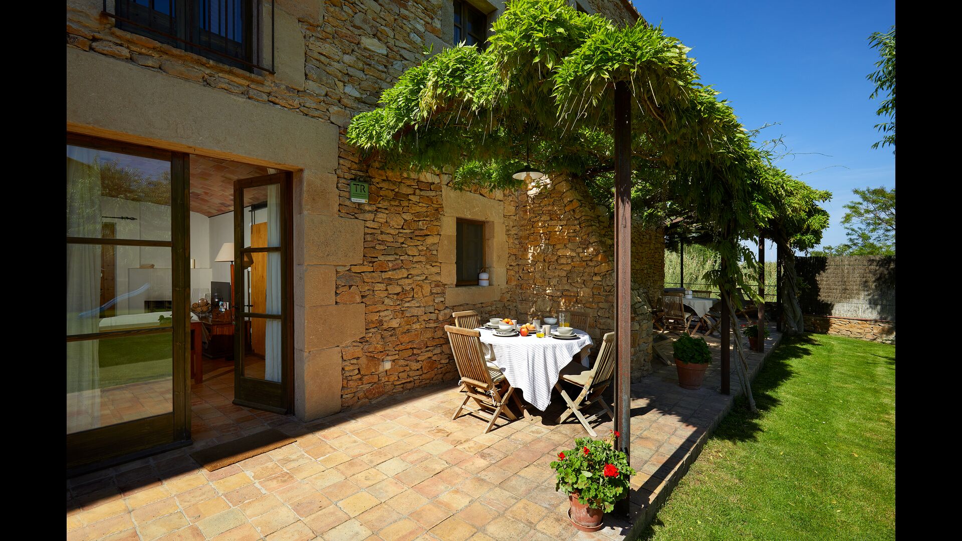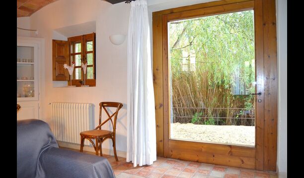 Vorderseite der schönen Ferienwohnung hat Blick auf den großen Garten. Das Haus mit seinen Steinmauern hat eine sehr authentische und rustikale Atmosphäre. Die Wohnung verfügt über eine Terrasse, wo Sie Ihre hausgemachte Mahlzeiten während der warmen katalanischen Abenden genießen können.
