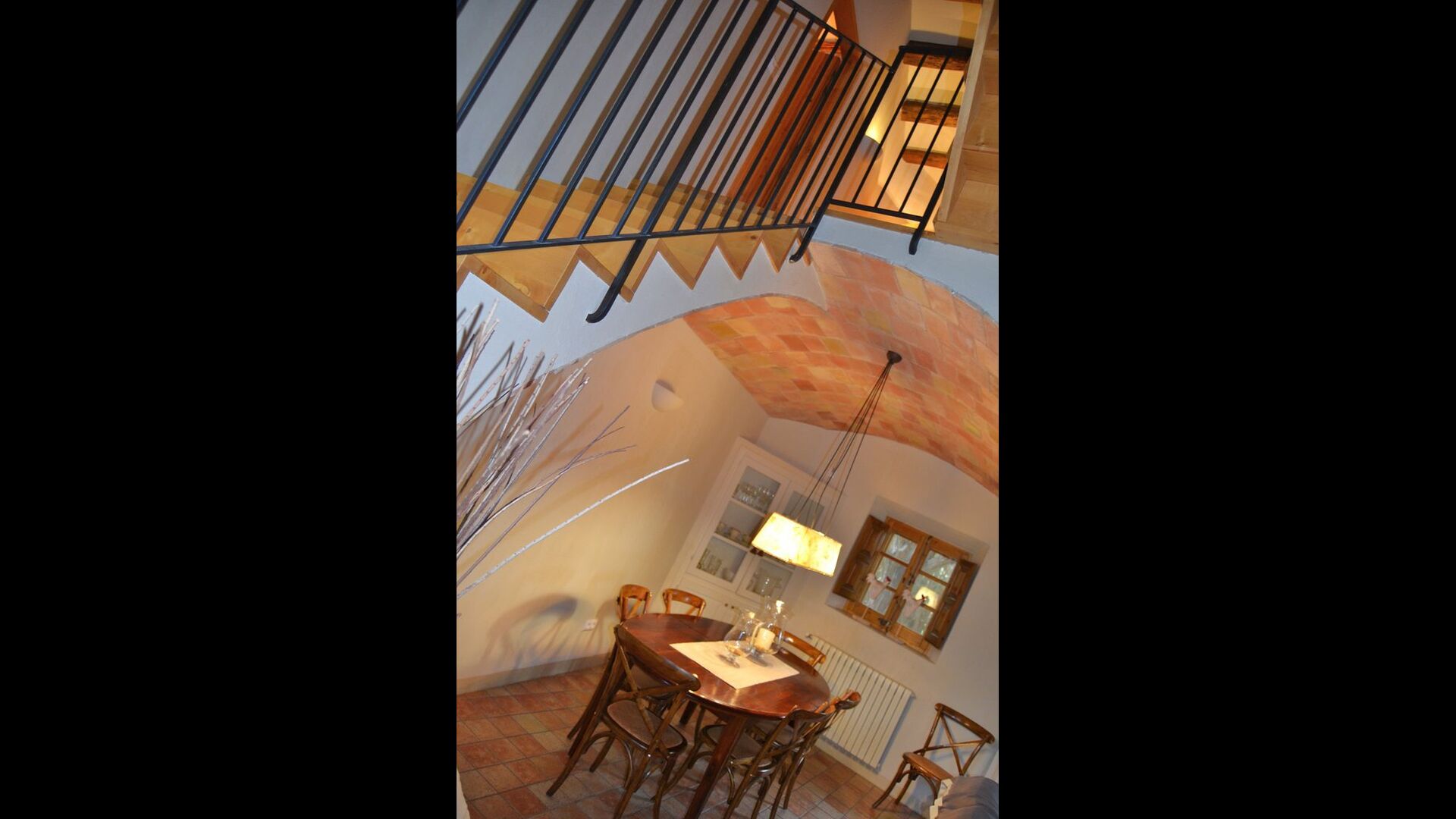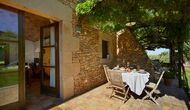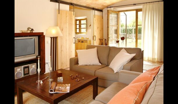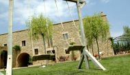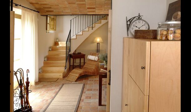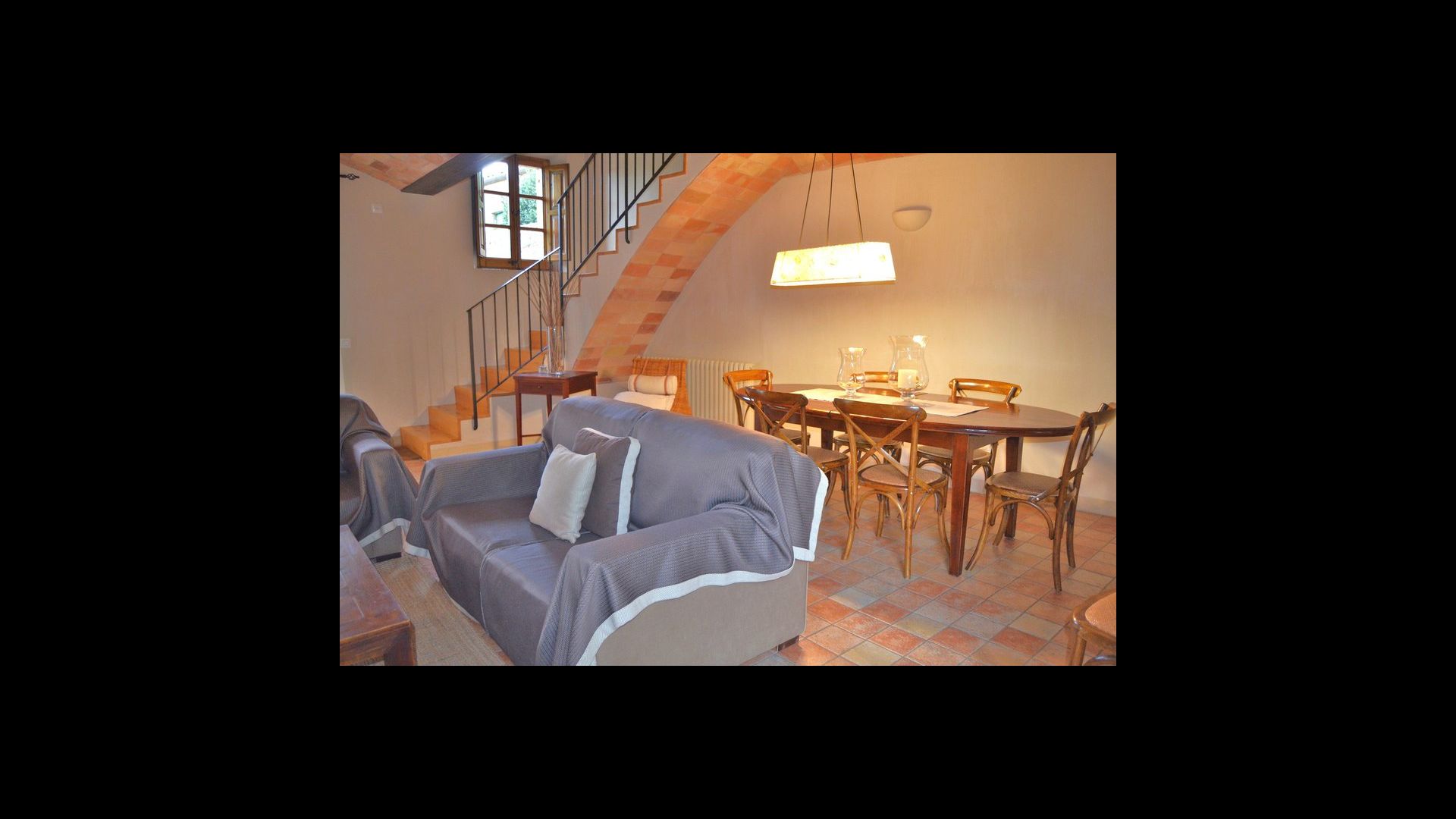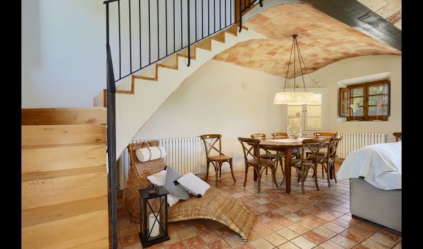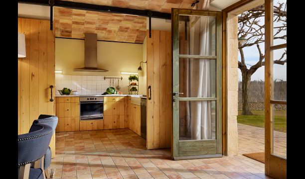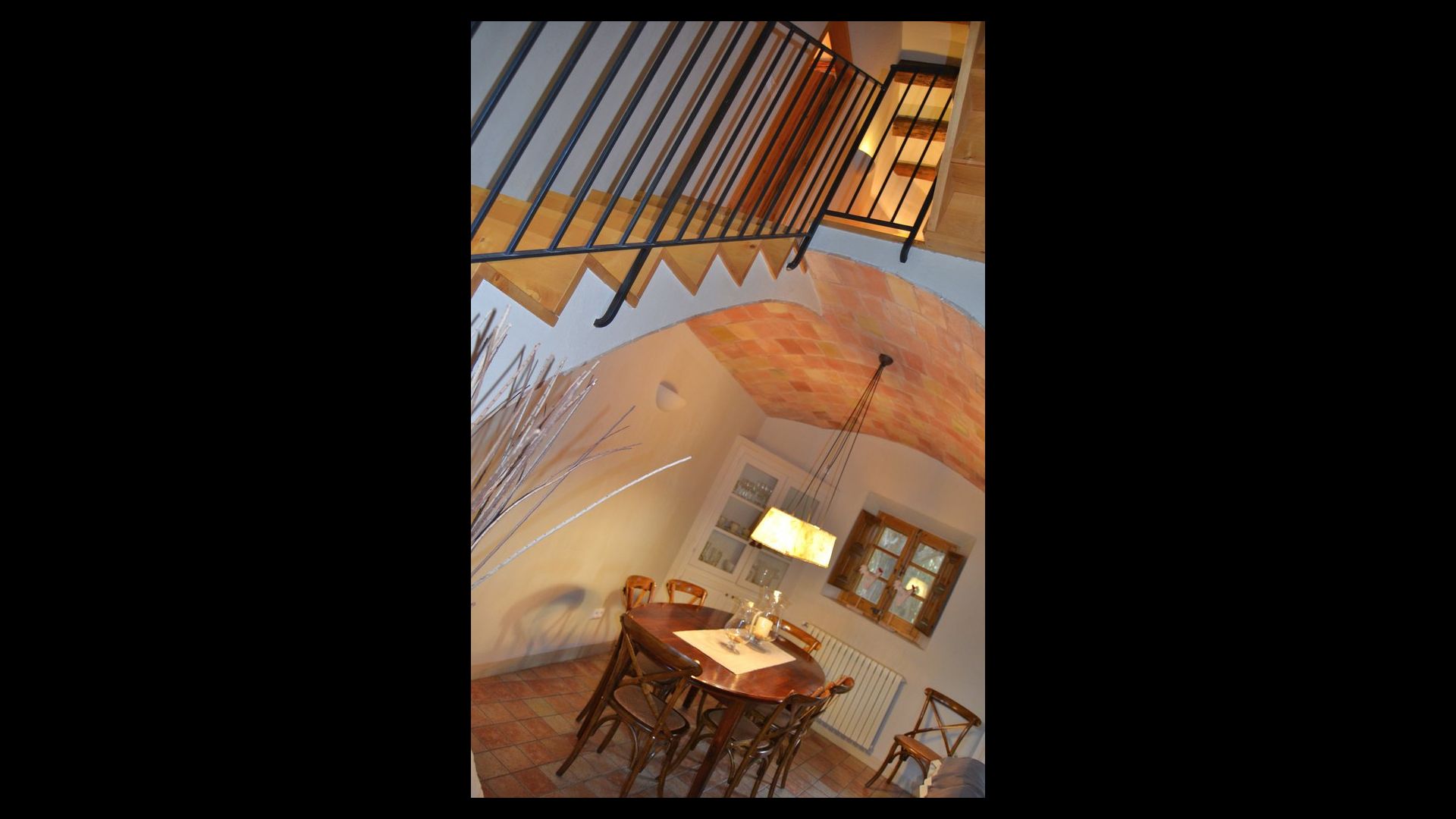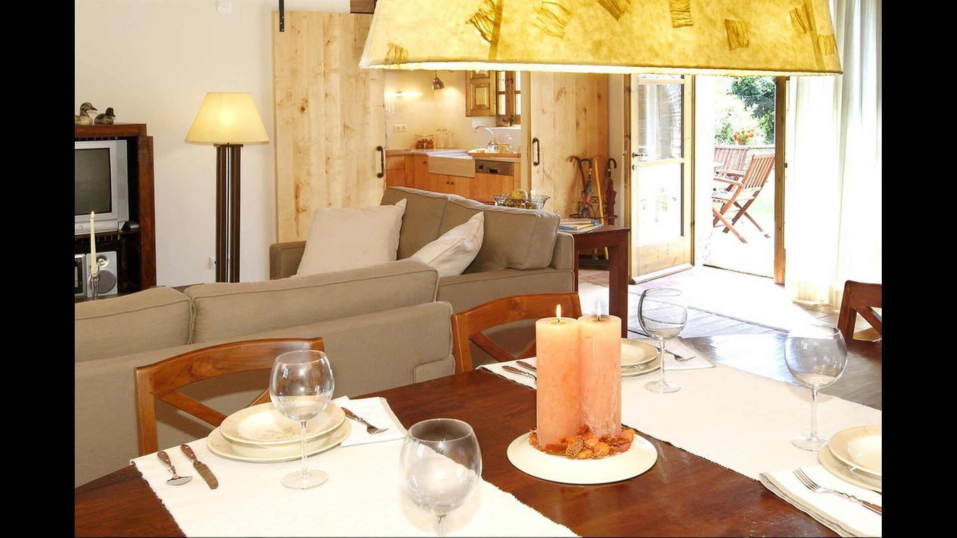 Vorderseite der schönen Ferienwohnung hat Blick auf den großen Garten. Das Haus mit seinen Steinmauern hat eine sehr authentische und rustikale Atmosphäre. Die Wohnung verfügt über eine Terrasse, wo Sie Ihre hausgemachte Mahlzeiten während der warmen katalanischen Abenden genießen können.