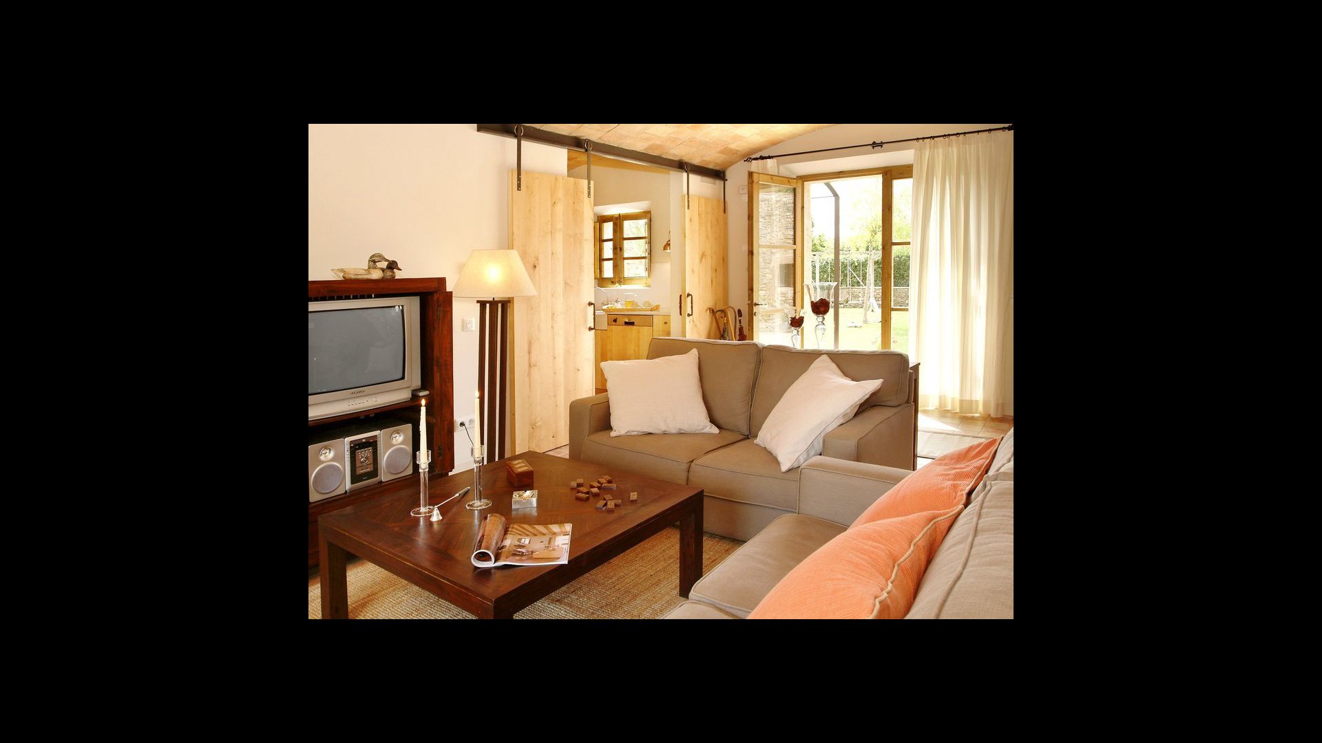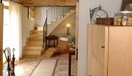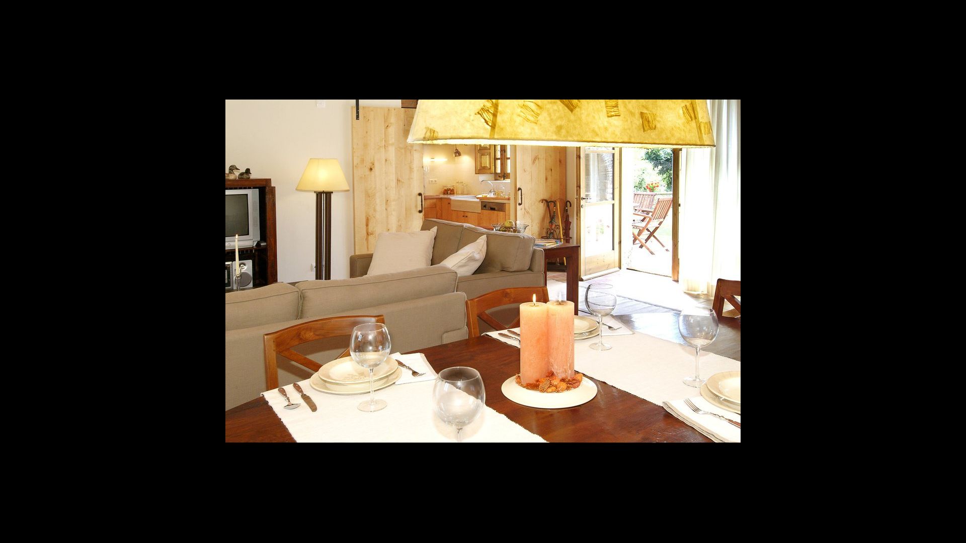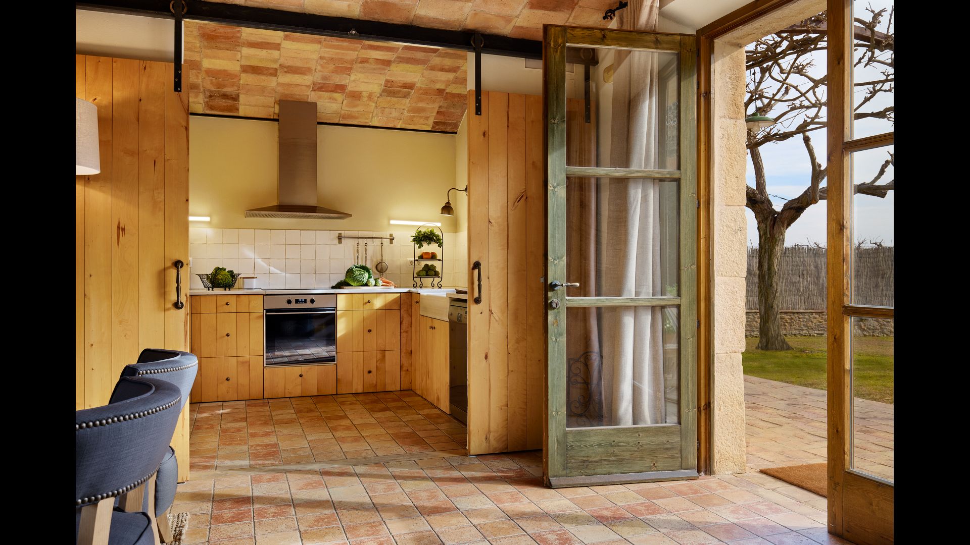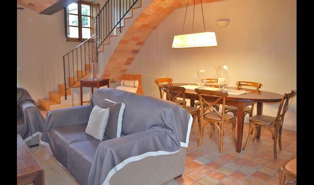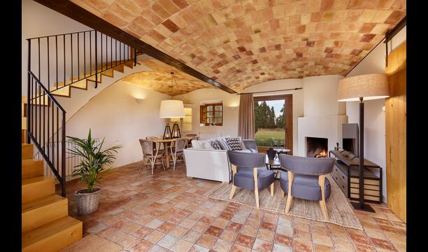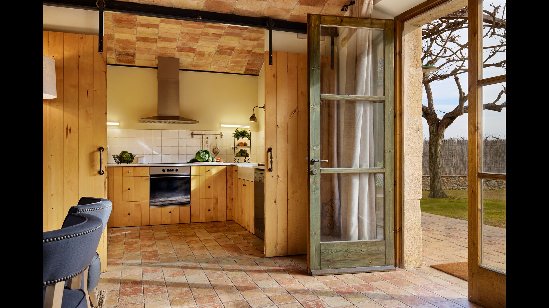 Vorderseite der schönen Ferienwohnung hat Blick auf den großen Garten. Das Haus mit seinen Steinmauern hat eine sehr authentische und rustikale Atmosphäre. Die Wohnung verfügt über eine Terrasse, wo Sie Ihre hausgemachte Mahlzeiten während der warmen katalanischen Abenden genießen können.