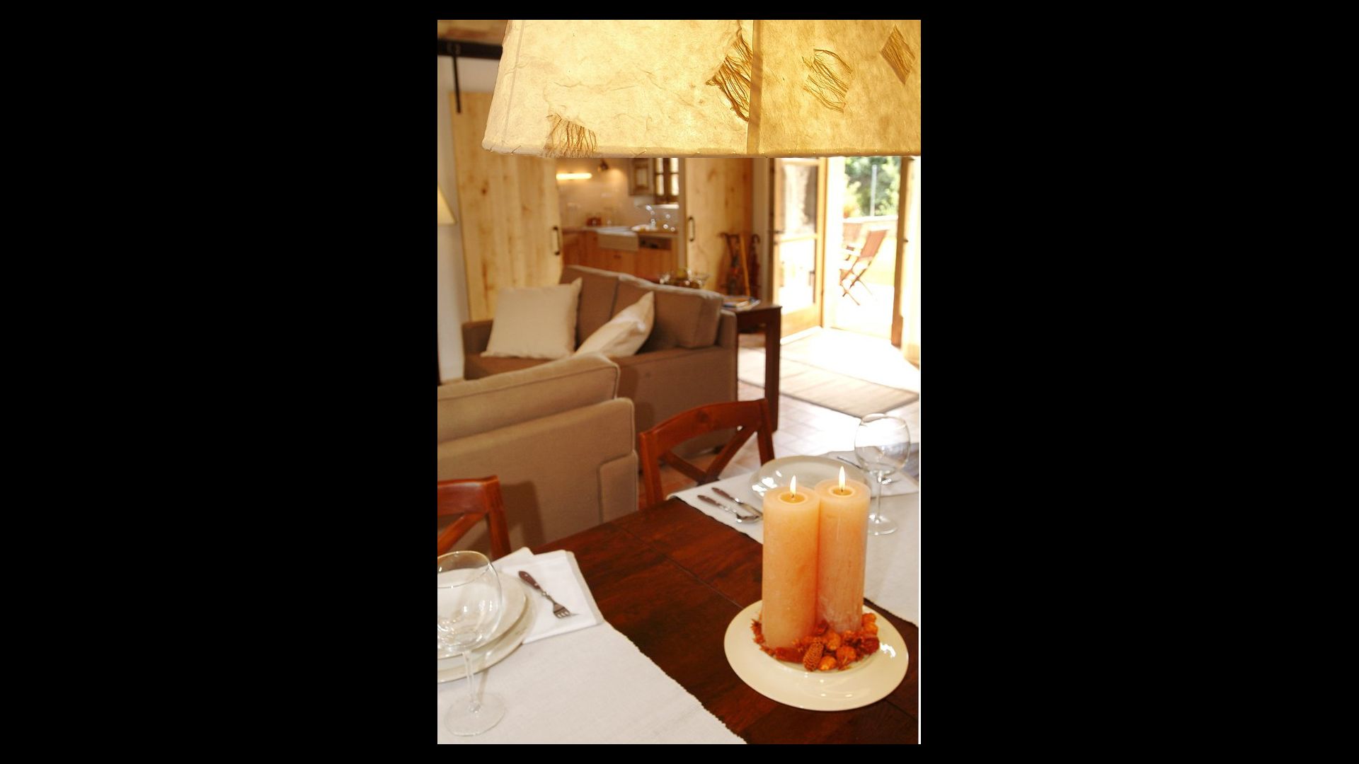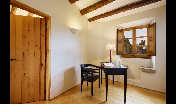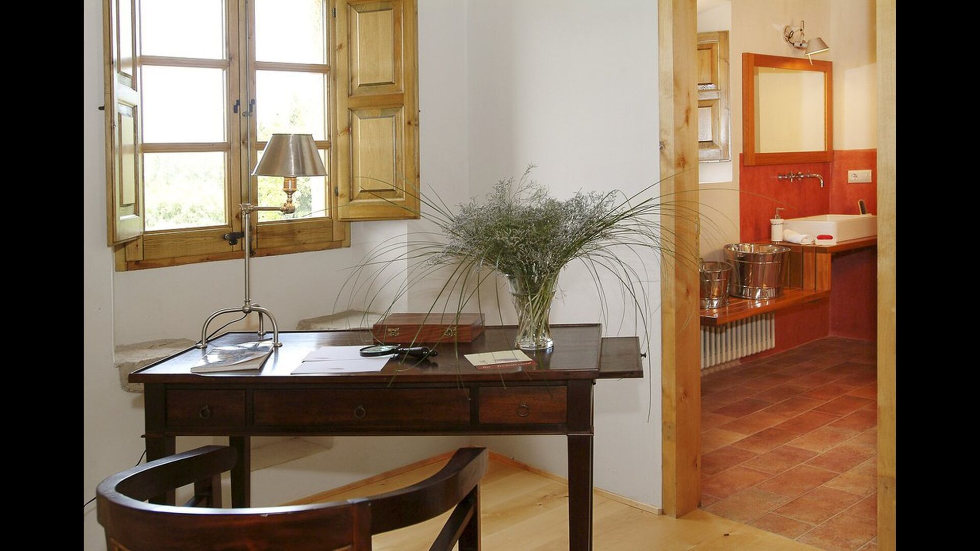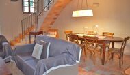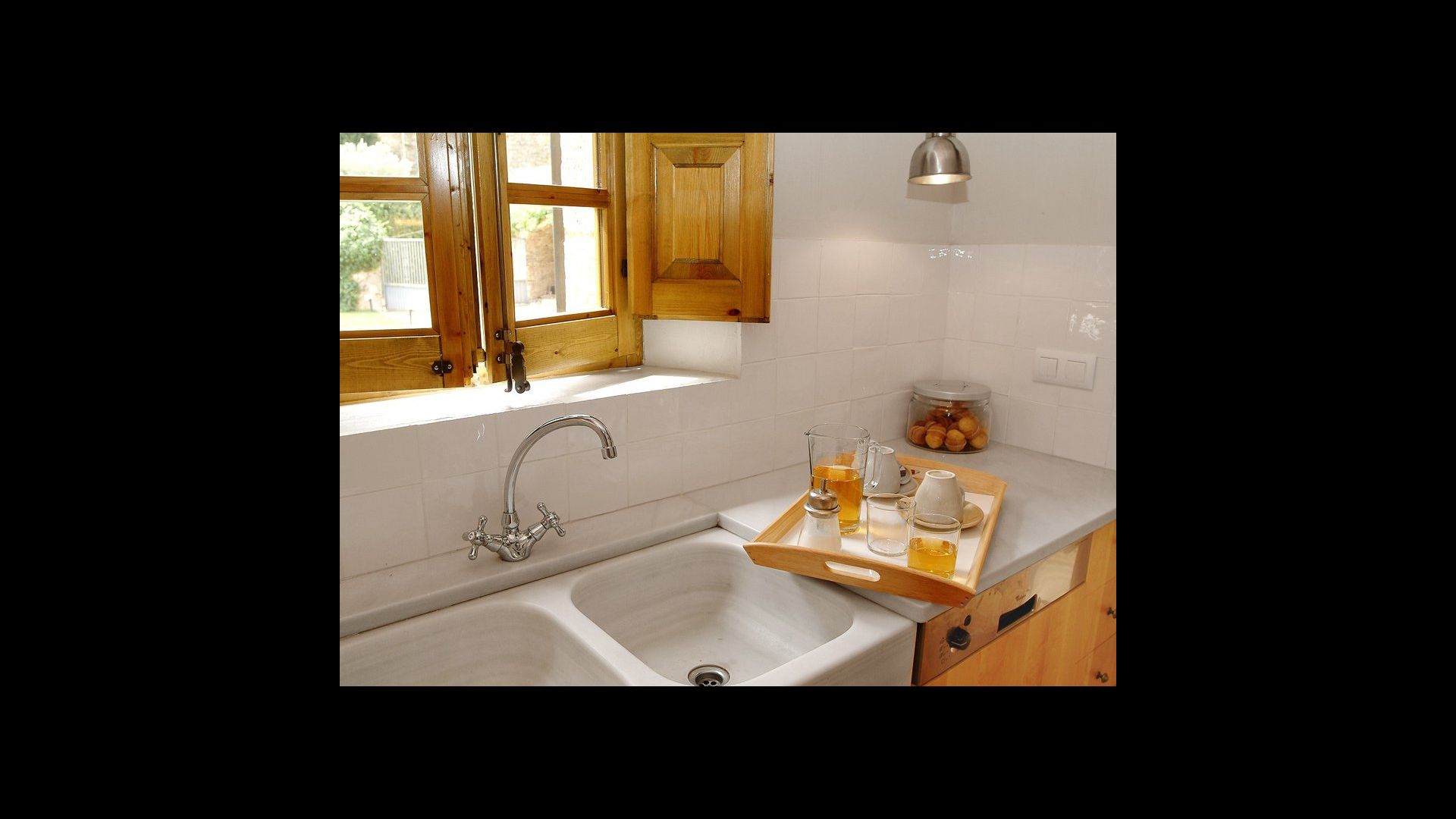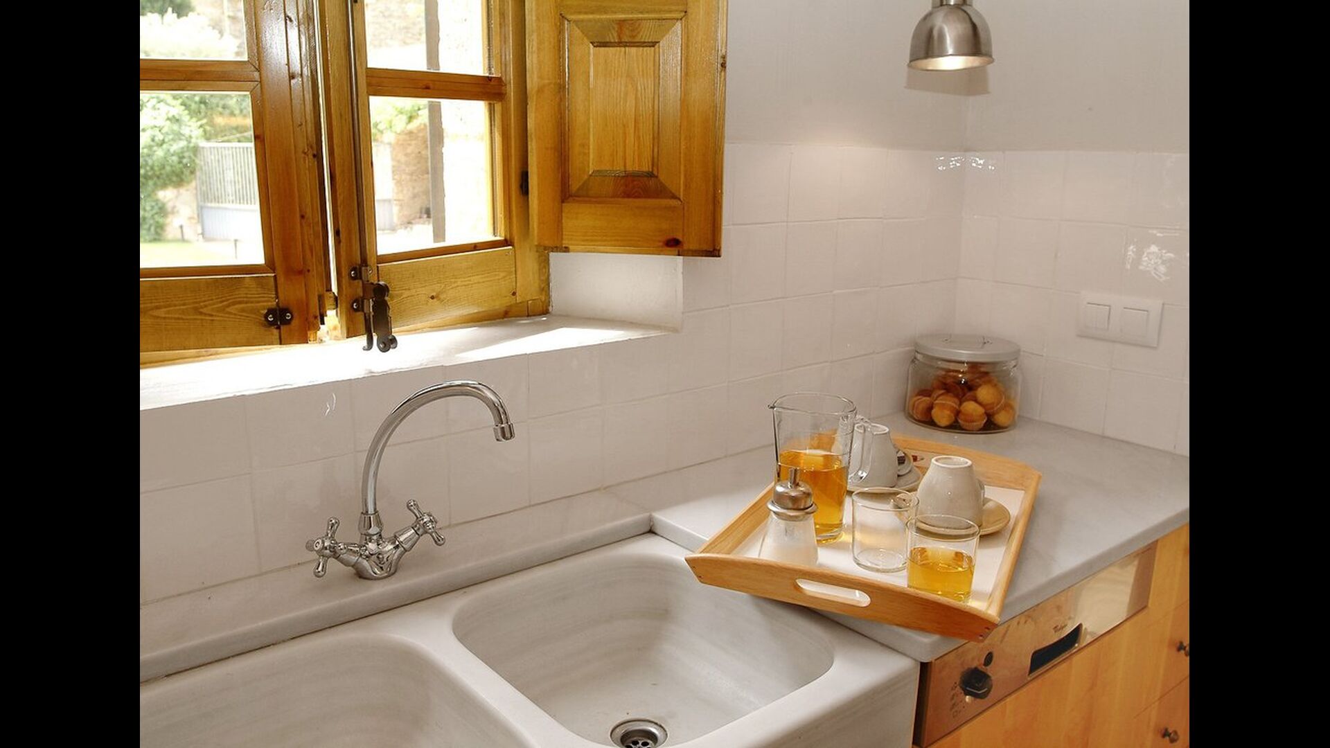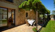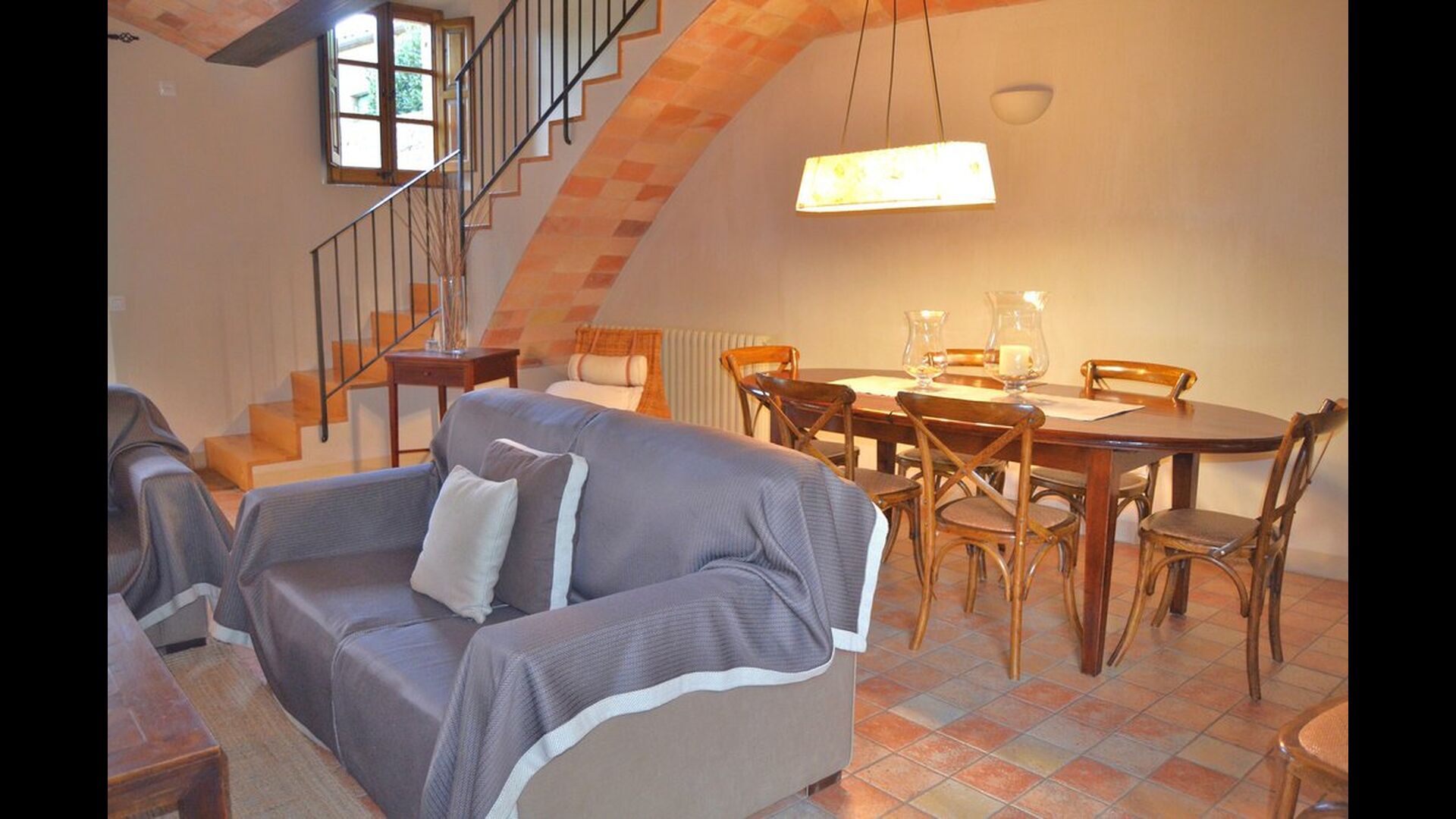 Vorderseite der schönen Ferienwohnung hat Blick auf den großen Garten. Das Haus mit seinen Steinmauern hat eine sehr authentische und rustikale Atmosphäre. Die Wohnung verfügt über eine Terrasse, wo Sie Ihre hausgemachte Mahlzeiten während der warmen katalanischen Abenden genießen können.