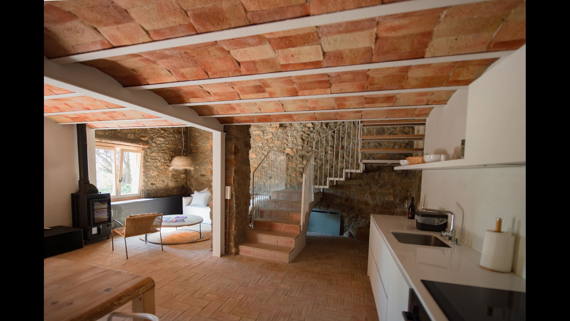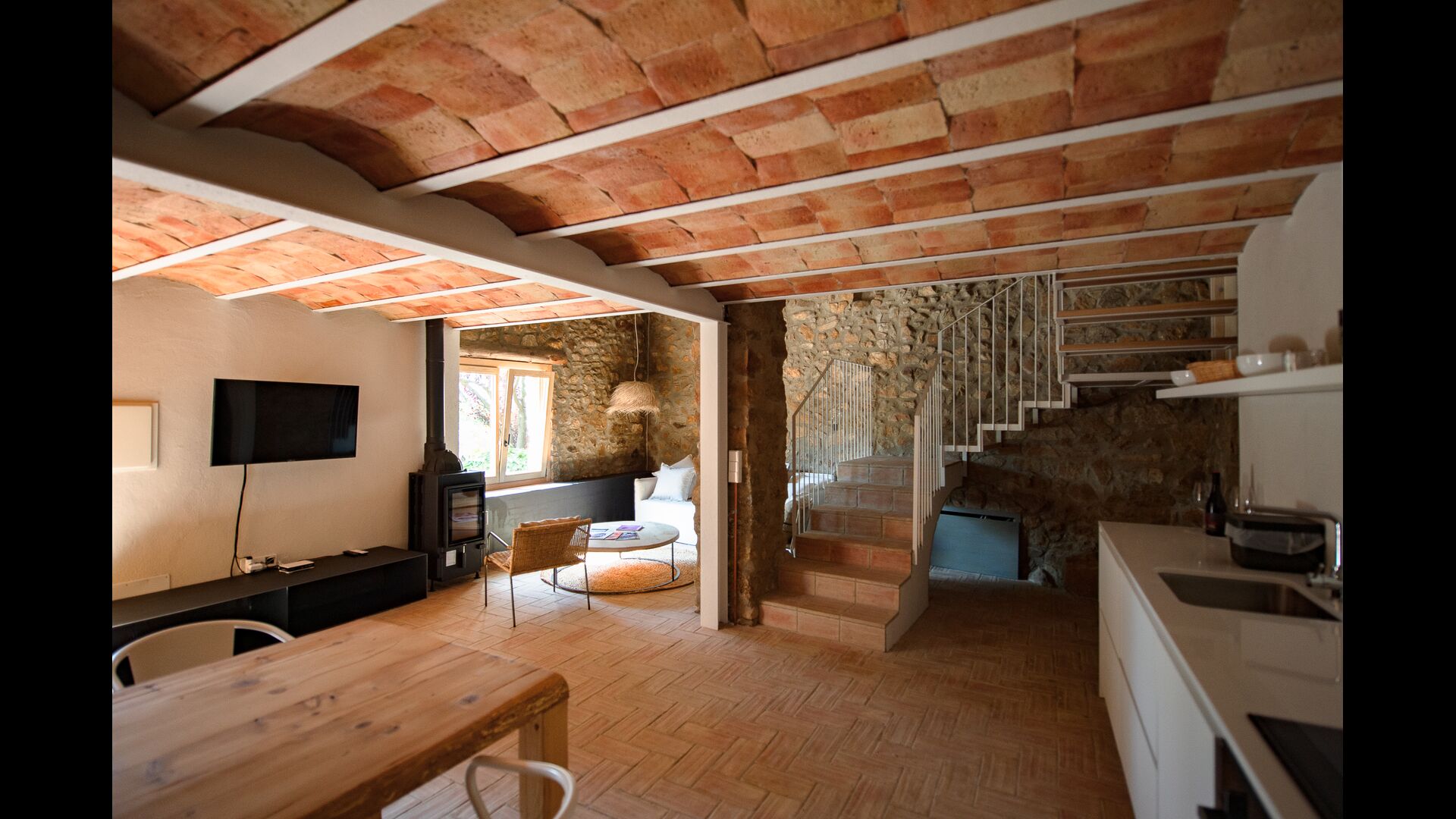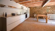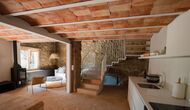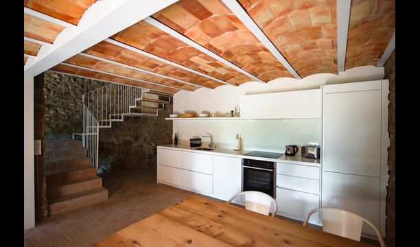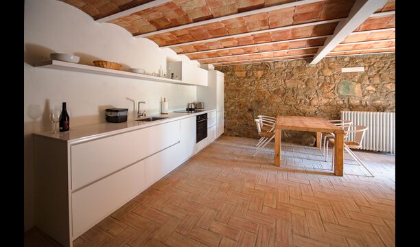 Das erste Gebäude verfügt im Erdgeschoss über einen Gemeinschaftsbereich mit Küche, Wohnzimmer und Esszimmer für große Gruppen, falls Sie lieber drinnen essen möchten. Im ersten Stock finden Sie die „Migjorn-Wohnung“.