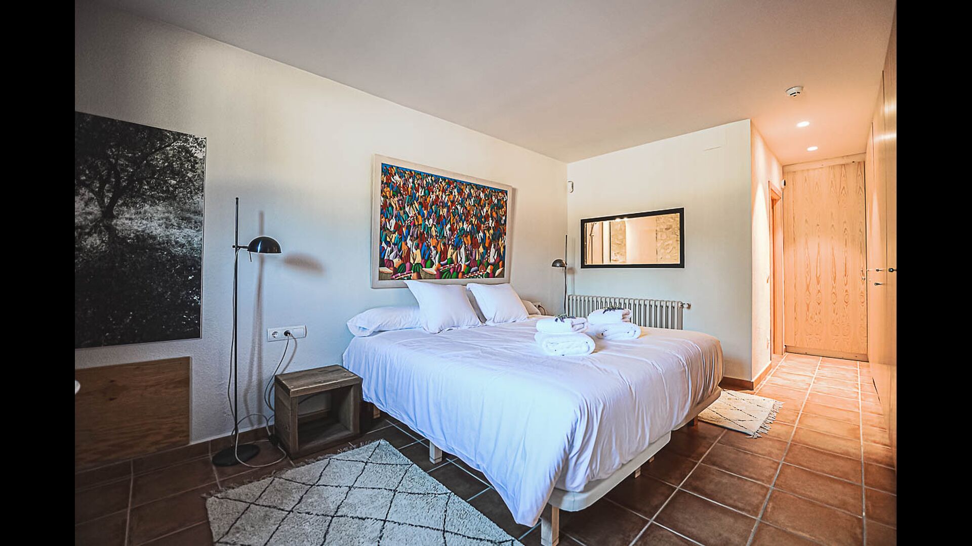 Das Apartment Tramuntana ist ein 65 m² großes Apartment mit Zugang vom Haupteingang des Mas. Es verfügt über einen großen Wohn-/Küchenbereich mit halbhoher Decke, von dem aus Sie in den Raum mit Arbeitstisch und separatem Badezimmer gelangen. Es verfügt über ein Doppelzimmer und eine Wohnküche mit einem 140 x 180 cm großen Schlafsofa. Außerdem gibt es einen Fernseher, eine Heizung und einen Deckenventilator, um die Temperatur angenehm zu halten.