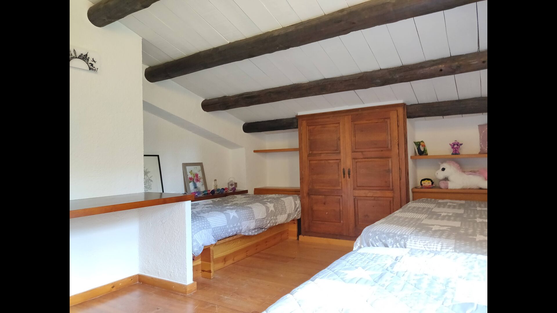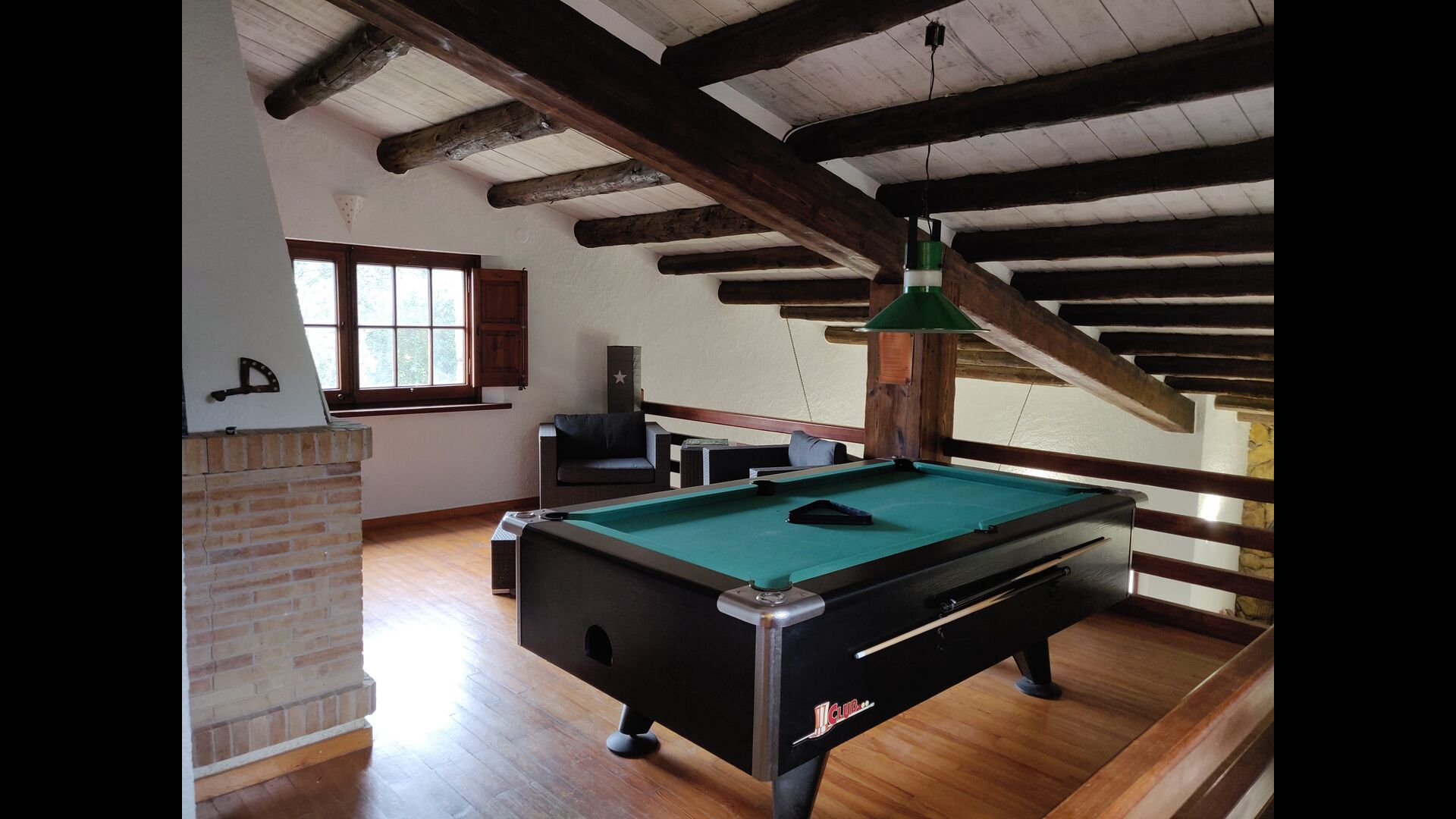 Im Obergeschoss befinden sich weitere 4 Schlafzimmer, ein Badezimmer, ein Duschbad und ein Lesesaal mit Billardtisch. Schließlich führt Sie eine kleine Holztreppe zum Dachboden, in dem sich das letzte Schlafzimmer und das private Duschbad befinden.