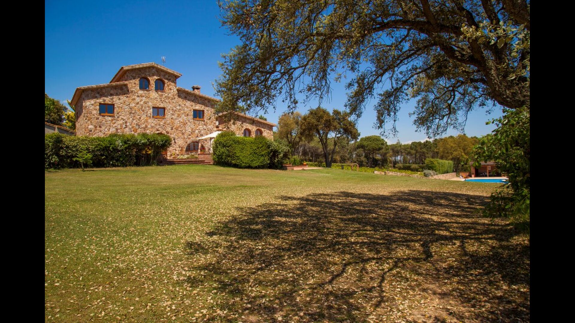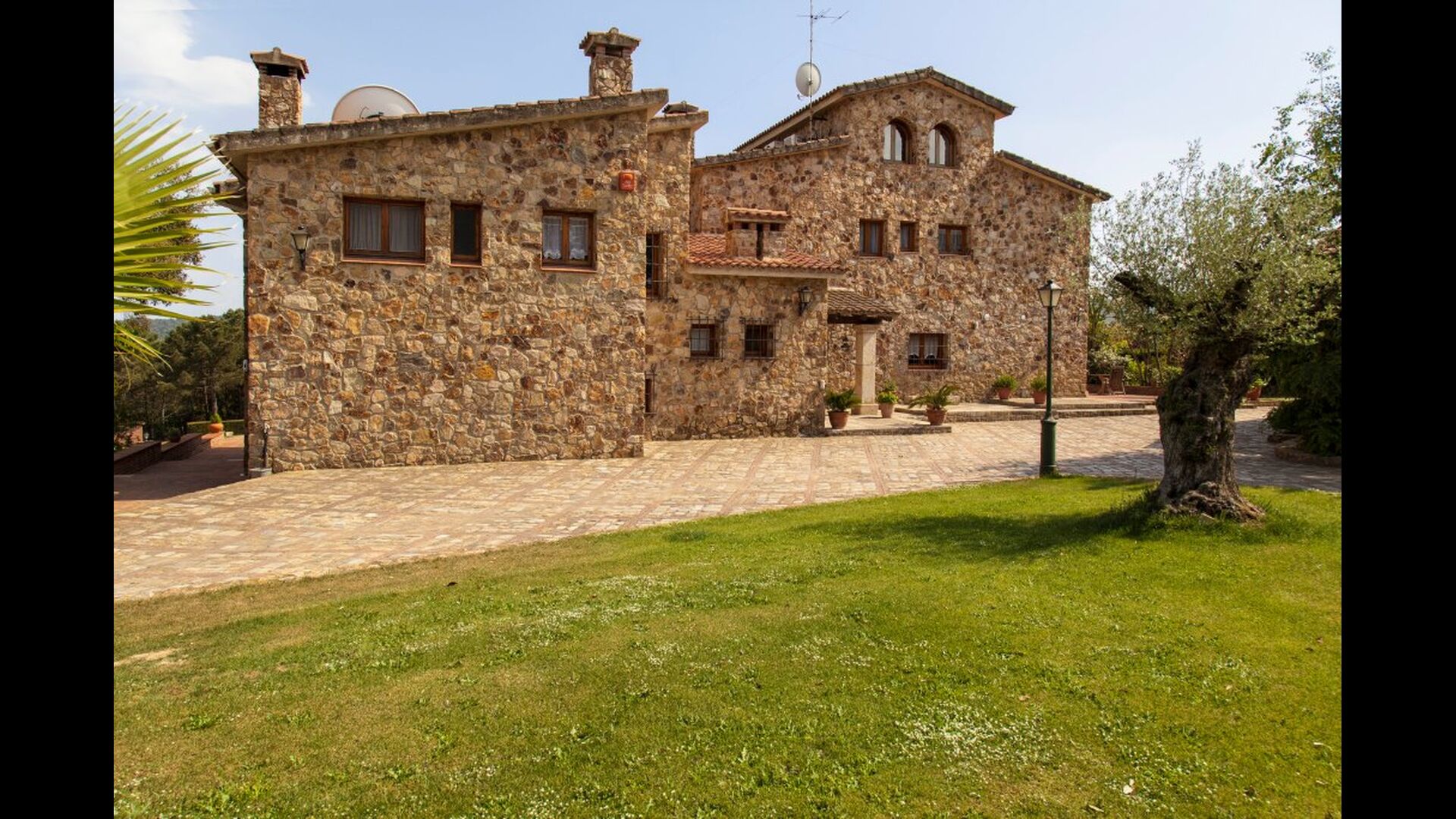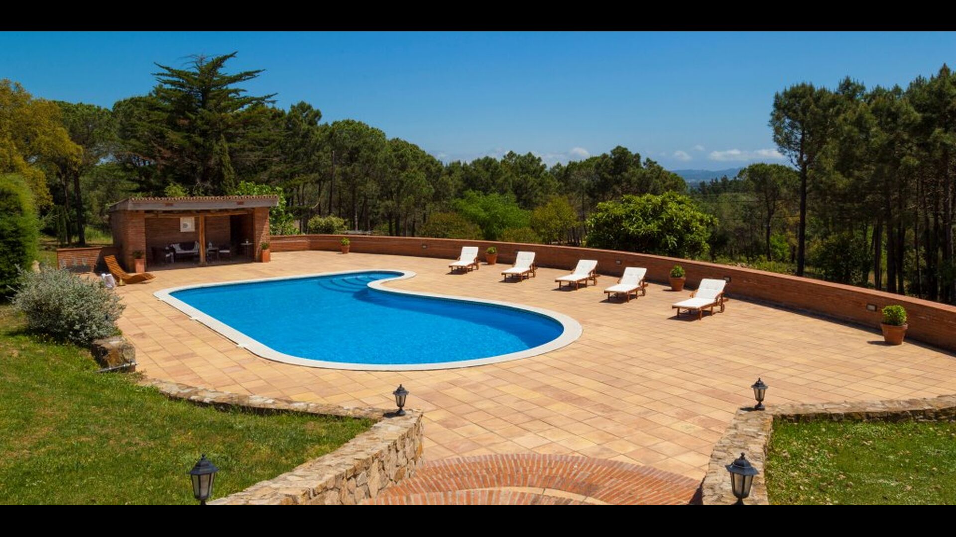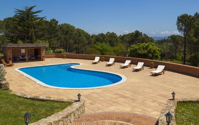 Auf der einen Seite finden wir draußen den spektakulären 14-Meter-Swimmingpool, umgeben von Rasen und Weinbergen, ergänzt durch eine gemütliche Veranda. Auf der anderen Seite gibt es eine herrliche Veranda mit Sofabereich für Versammlungen und einen Essbereich im Freien unter einem schmiedeeisernen Baldachin, der einen atemberaubenden Blick auf das Anwesen bietet, mit Blick auf die Stadt Blanes und den Naturpark Montnegre. In einem anderen Teil des Anwesens befinden sich der Obstgarten, der Pinienwald und ein großer Teich. Auf der hinteren Terrasse befindet sich ein gemütlicher Ruhebereich mit einem Steintisch zum Ausruhen neben den Bäumen.