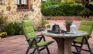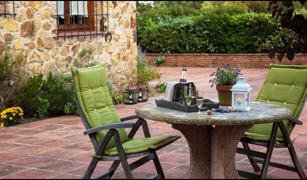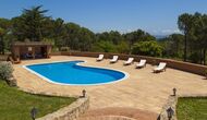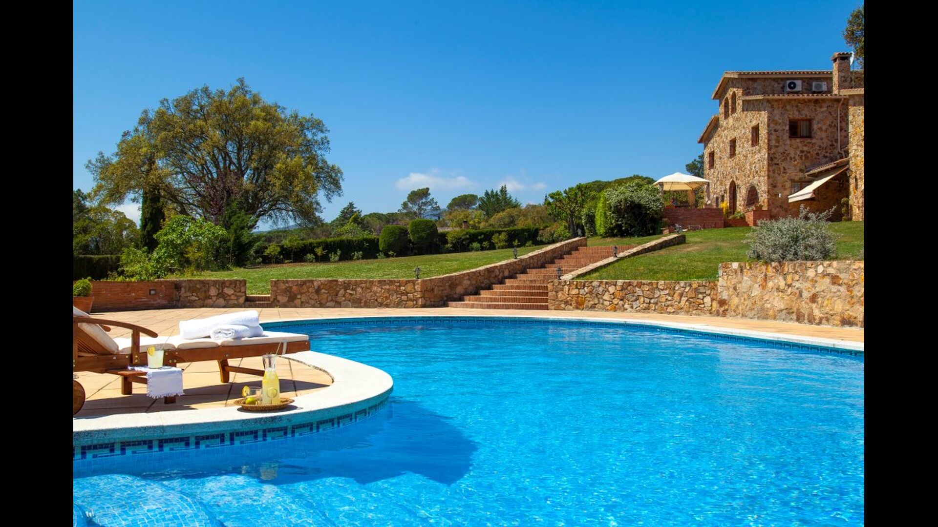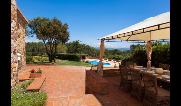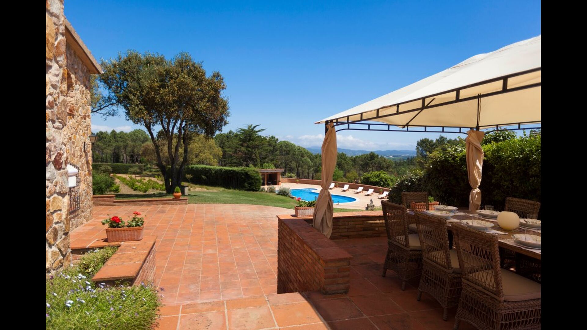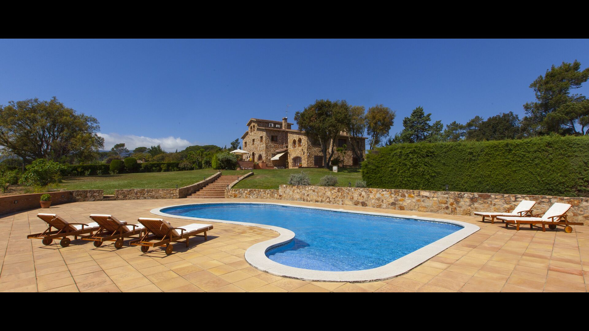 Auf der einen Seite finden wir draußen den spektakulären 14-Meter-Swimmingpool, umgeben von Rasen und Weinbergen, ergänzt durch eine gemütliche Veranda. Auf der anderen Seite gibt es eine herrliche Veranda mit Sofabereich für Versammlungen und einen Essbereich im Freien unter einem schmiedeeisernen Baldachin, der einen atemberaubenden Blick auf das Anwesen bietet, mit Blick auf die Stadt Blanes und den Naturpark Montnegre. In einem anderen Teil des Anwesens befinden sich der Obstgarten, der Pinienwald und ein großer Teich. Auf der hinteren Terrasse befindet sich ein gemütlicher Ruhebereich mit einem Steintisch zum Ausruhen neben den Bäumen.