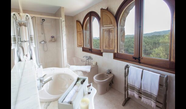 Die Vineyard Deluxe Suite ist eine 80 m² große Super-Deluxe-Suite mit spektakulärem Blick auf den Pool, die Weinberge des Anwesens, die Stadt Blanes und das Meer und die fantastische Aussicht Umgebung des Naturparks Montnegre. Es befindet sich im Nordflügel des Hauses im Dachgeschoss. Es verfügt über ein Kingsize-Bett von 2 x 2 m, eine Lounge mit TV und DVD, ein Ankleidezimmer, ein Badezimmer mit Dusche und einen Tisch mit zwei Stühlen, um bei Bedarf mit der Familie zu frühstücken. Dies kann in der kleinen exklusiven Küchenzeile zubereitet werden, die sich neben dieser exklusiven Unterkunft befindet. Es ist mit einem Kühlschrank, einem Toaster, einem Wasserkocher sowie Tassen und Untertassen ausgestattet. Das Dekor ist sehr provenzalisch, mit Pastellfarben und einzigartigen Stücken aus antikem Holz.