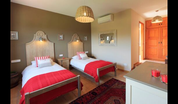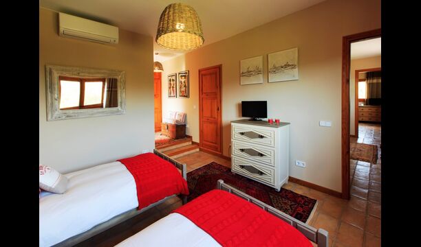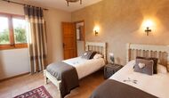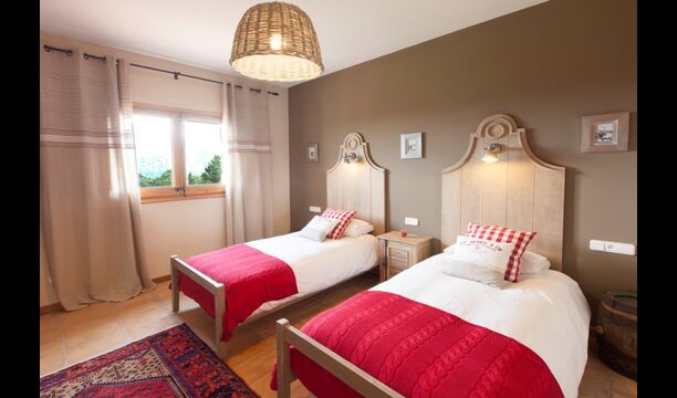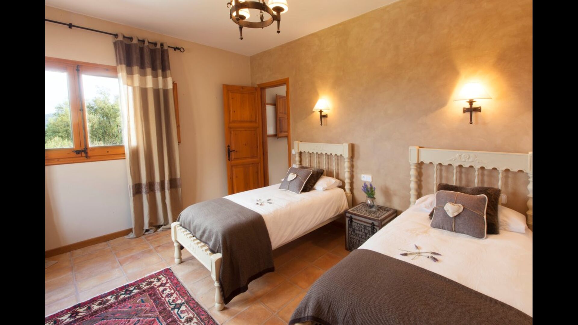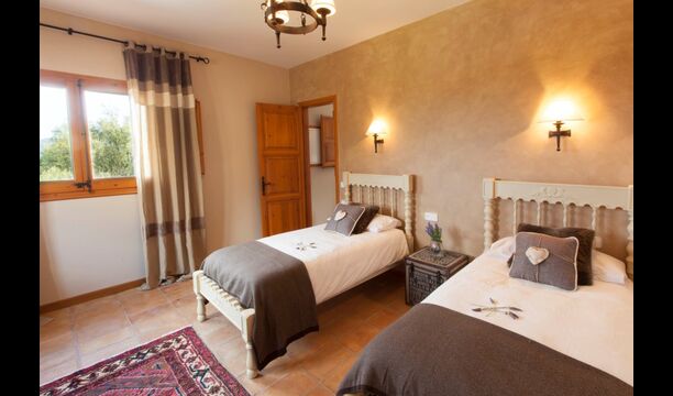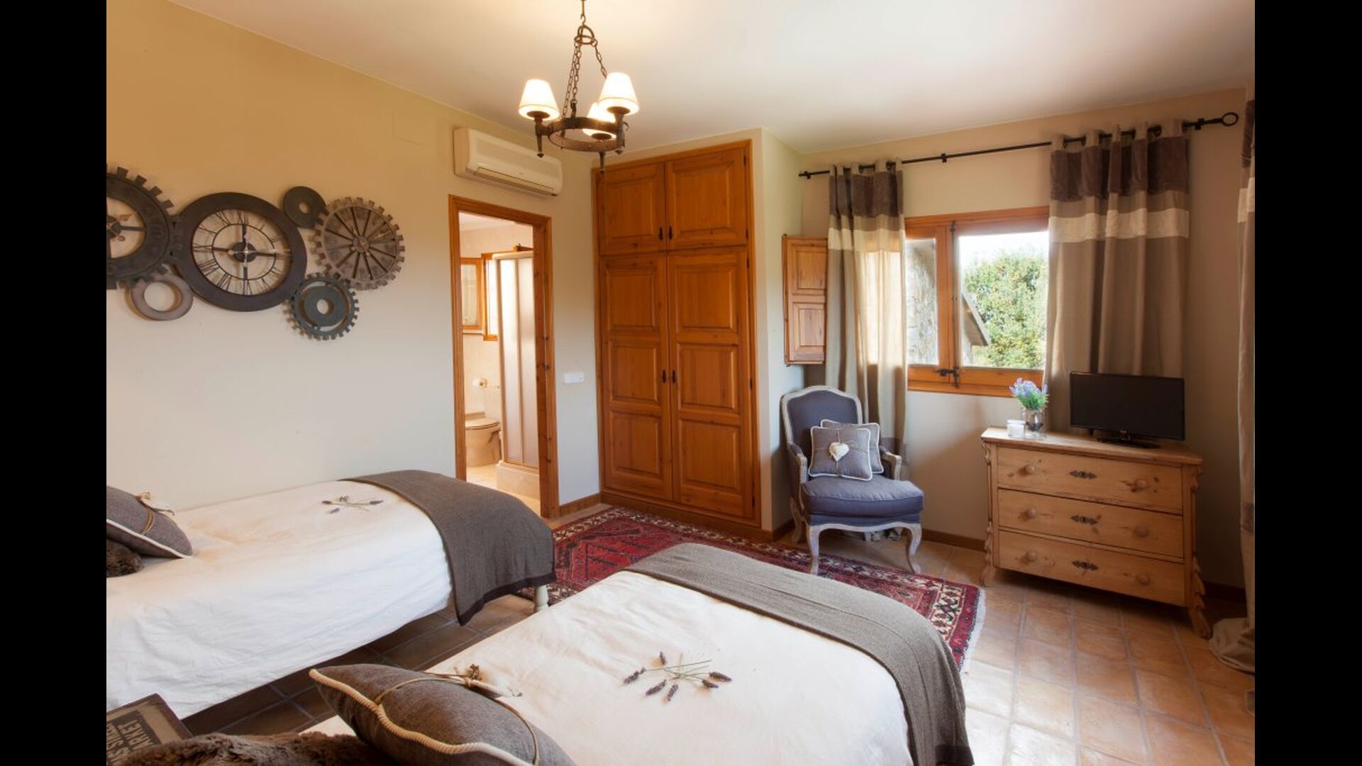 Die Montnegre Suite ist eine 32 m² große Suite mit zwei Einzelbetten, komplett ausgestattet mit TV, Badezimmer mit Dusche und Badewanne und Kleiderschrank. Es blickt auf den Garten und den Pool. Es befindet sich im Südflügel des Dachgeschosses. Das pastellfarbene Dekor mit dunkelbraunen Akzenten verleiht eine klare Persönlichkeit, die Sie in die Ruhe und Frische der Landschaft entführt. Die große Metalluhr an der Wand verleiht ihm einen einzigartigen Charakter.