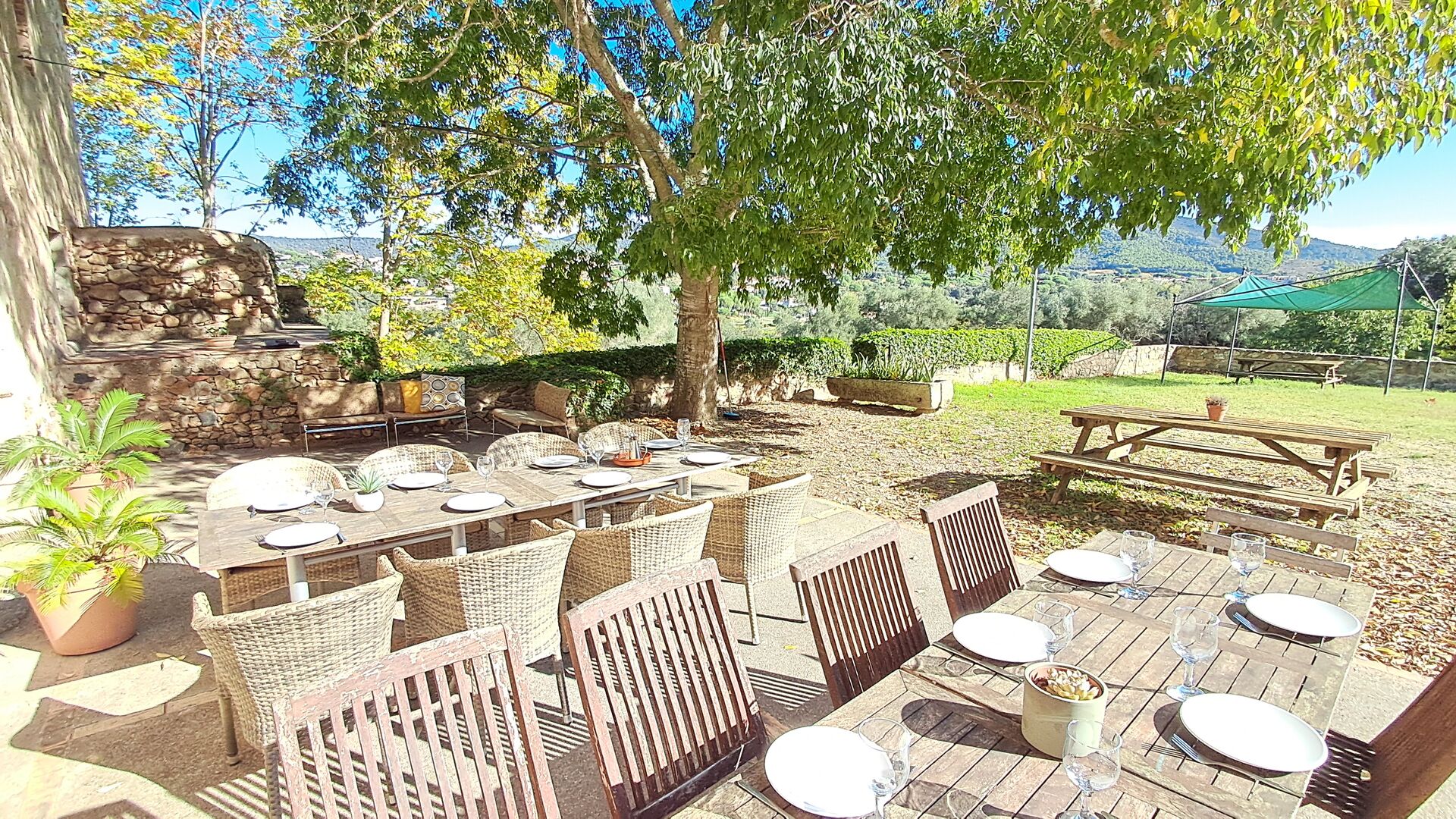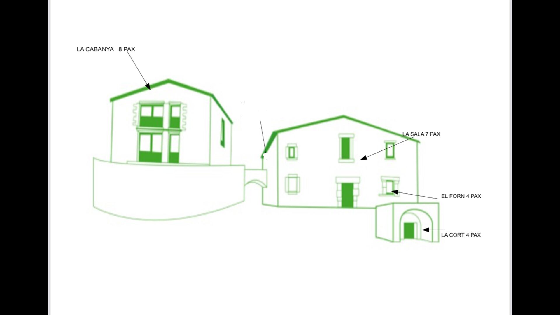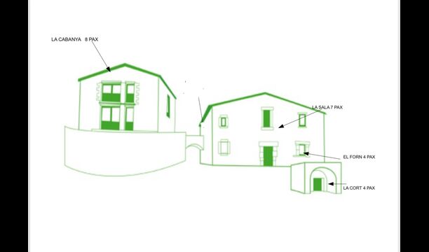 Das Anwesen ist in vier Wohnungen unterteilt, kann aber auch als ein großes Anwesen gemietet werden, da es einen großen Speisesaal mit viel Platz für eine große Gruppe von bis zu 23 + 3 Personen gibt.