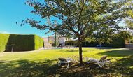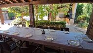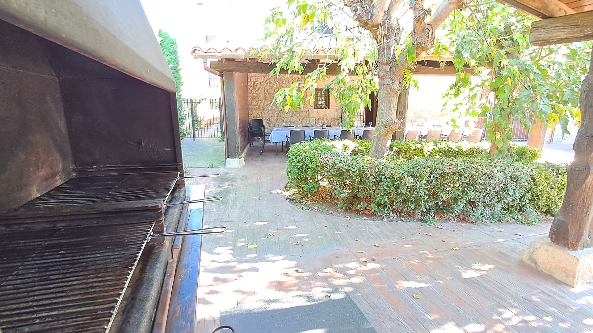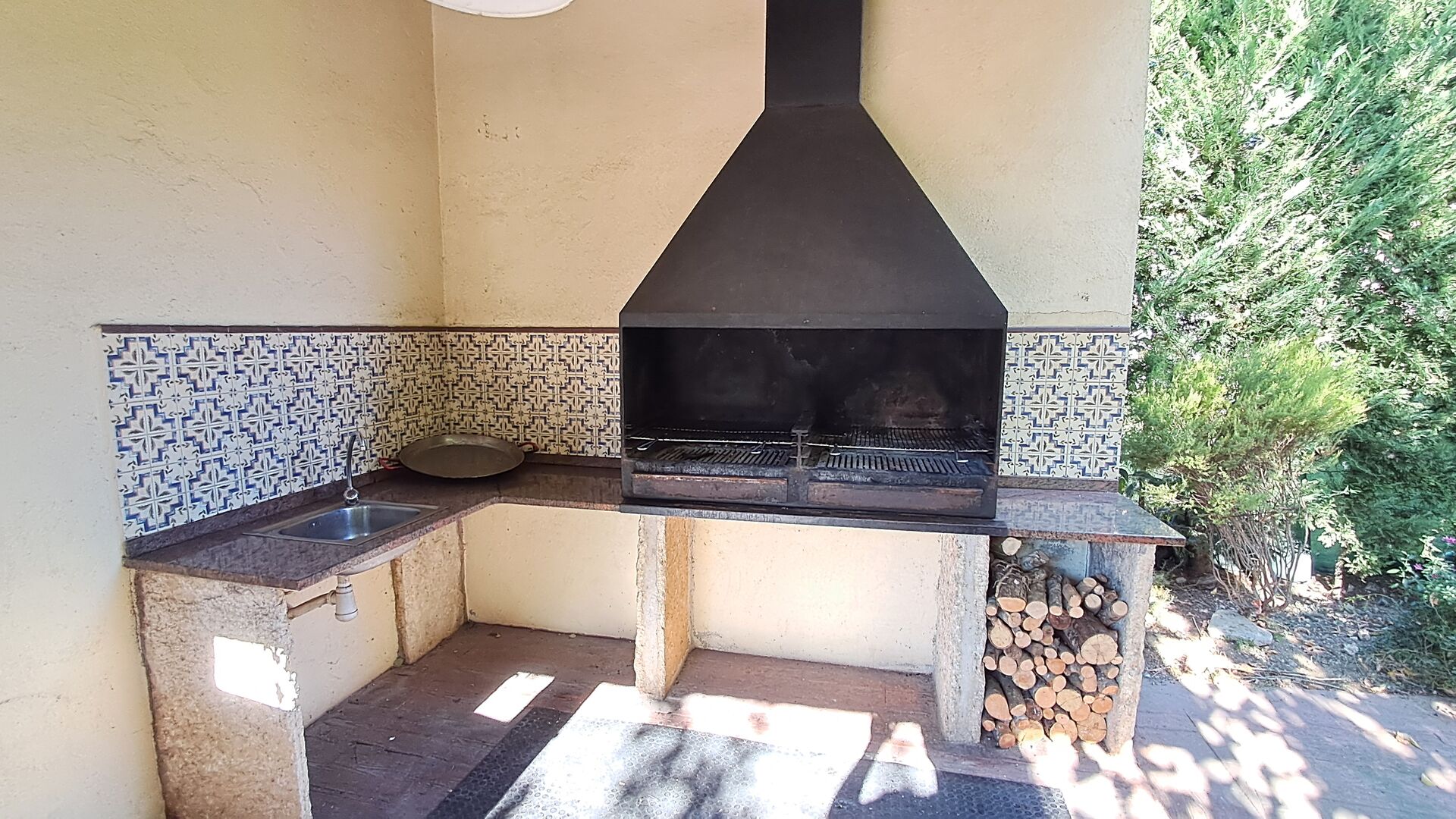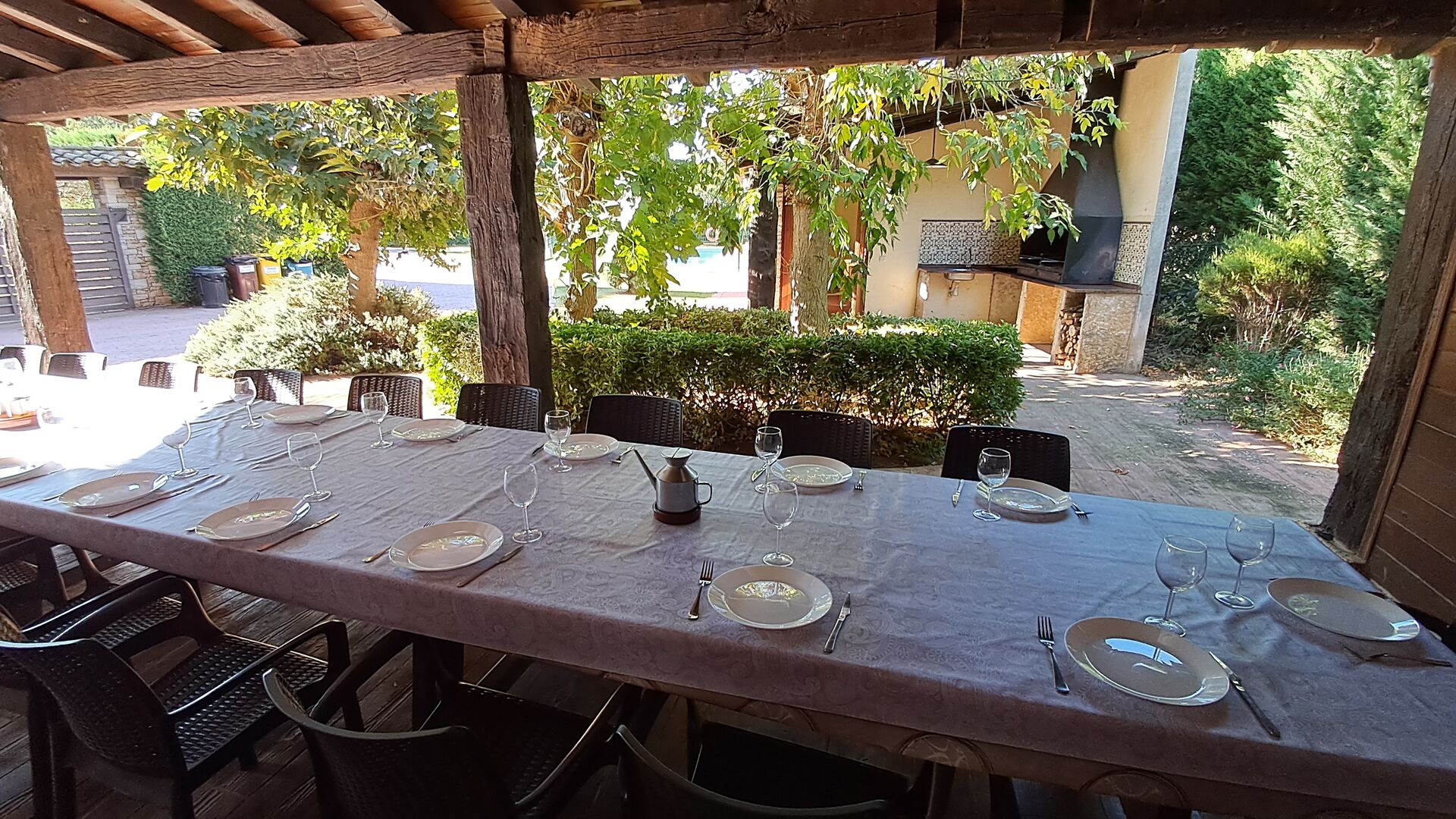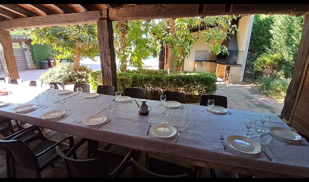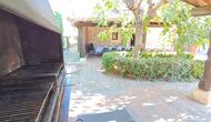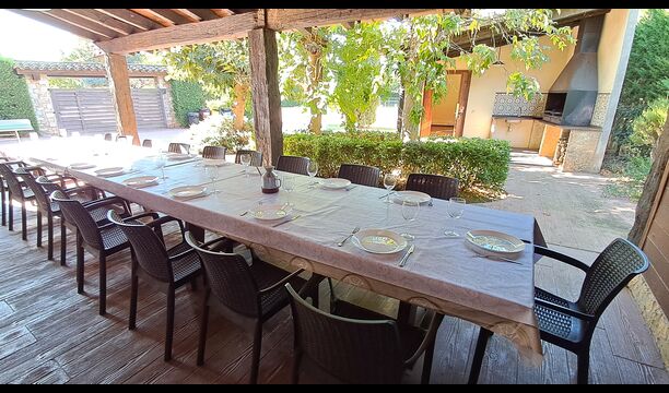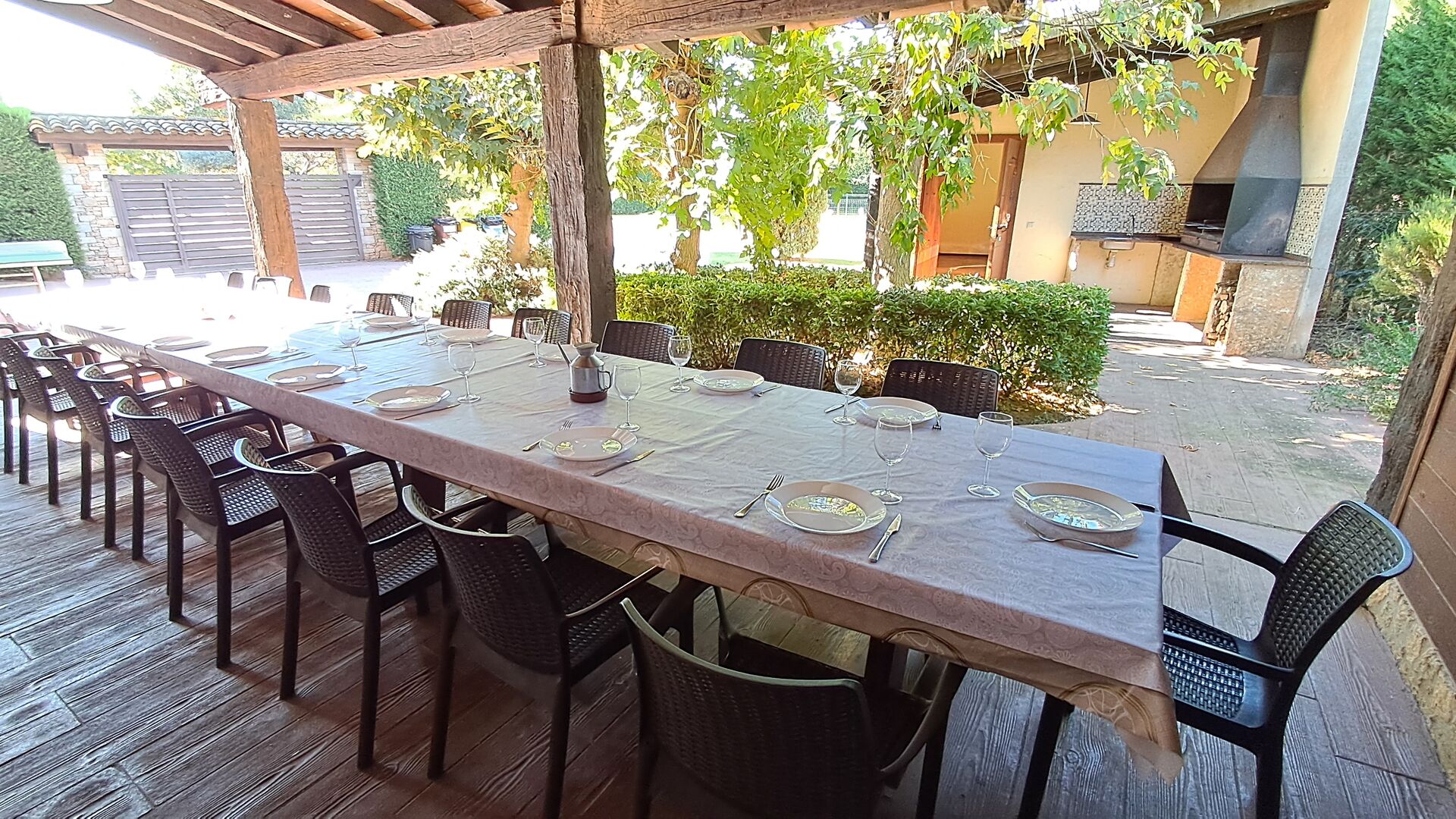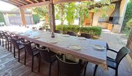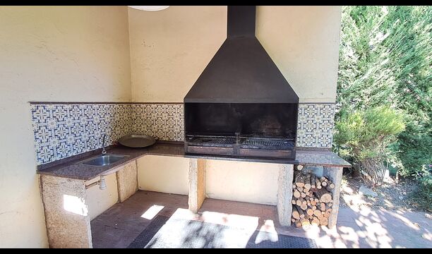 Im Garten gerade vor dem Haus, gibt es eine sehr große überdachte Terrasse mit einen großen BBQ Grill und eine Draußen-Küche. Daneben gibt es einen langen Esstisch. Hier können Sie das Abendessen vorbereiten und es in den warmen Abendstunden genießen.