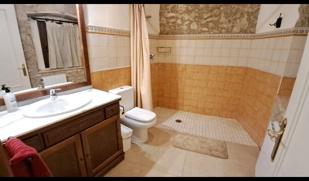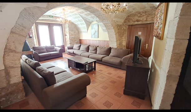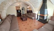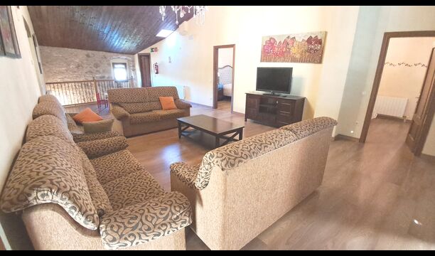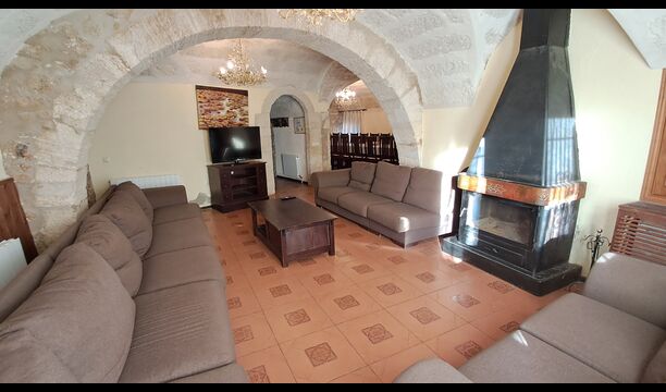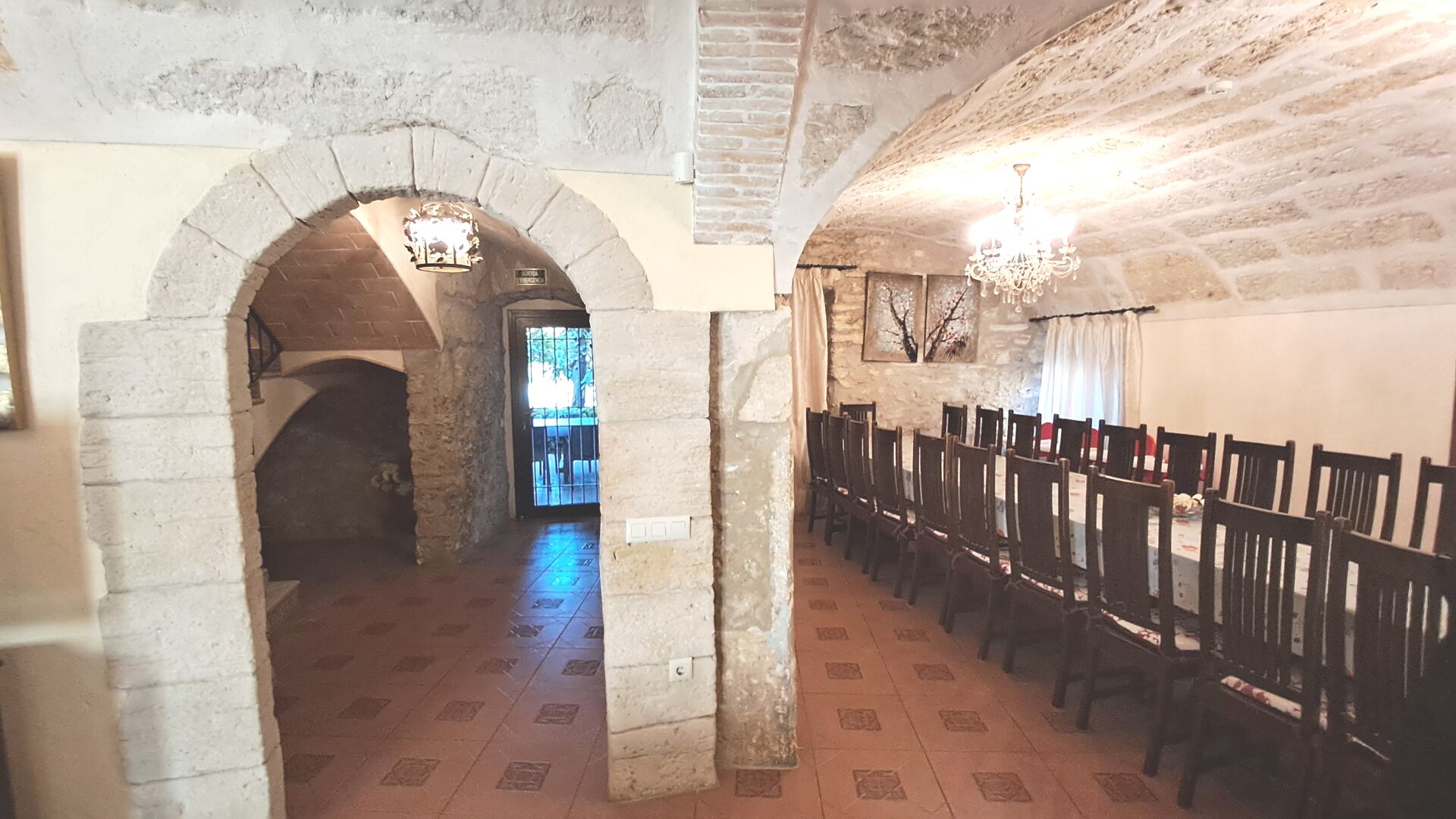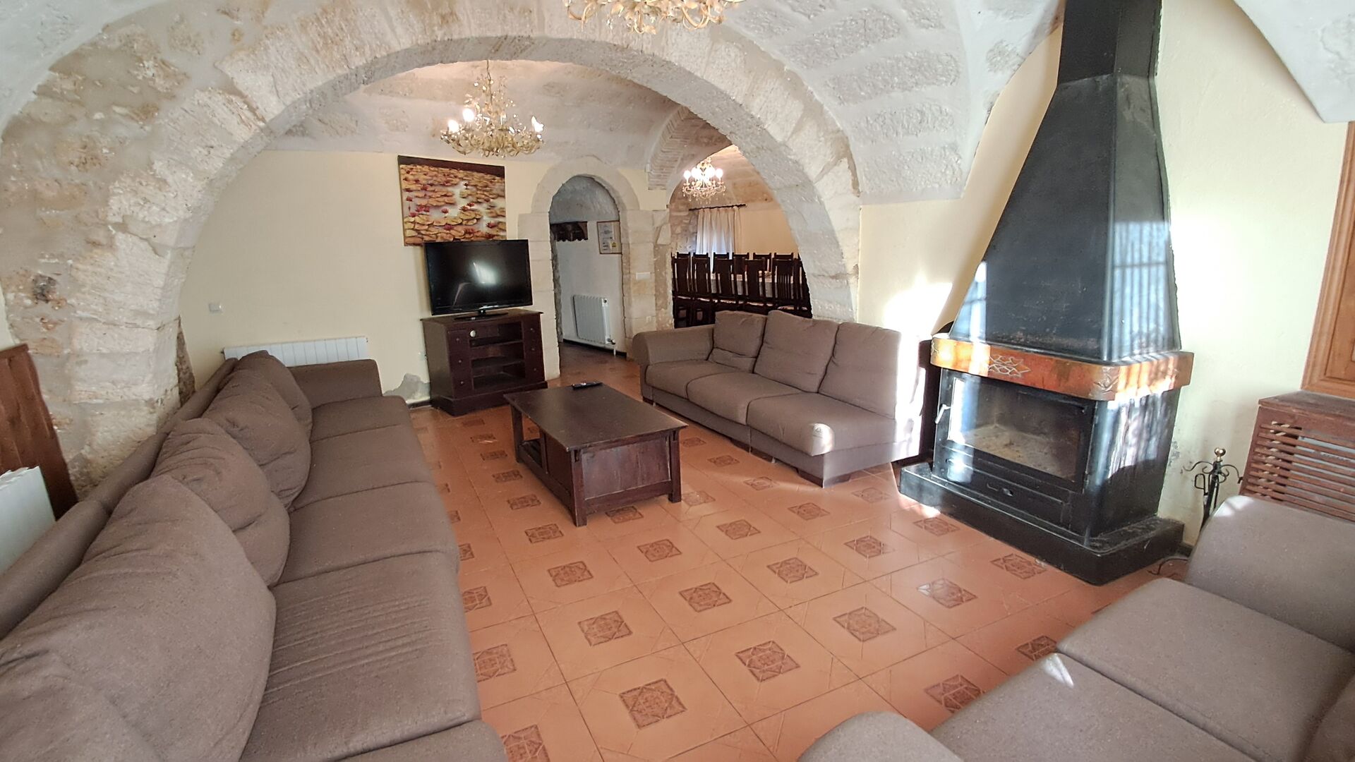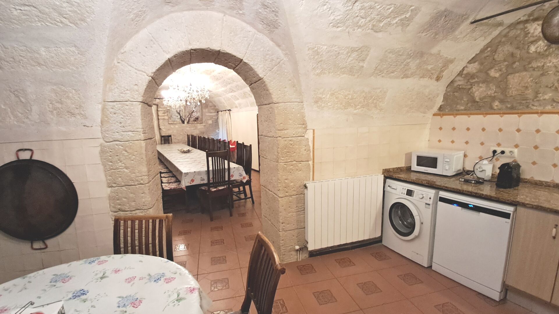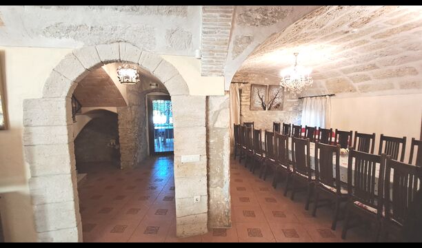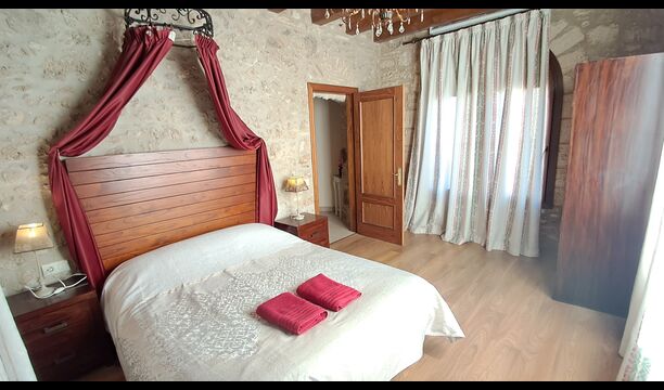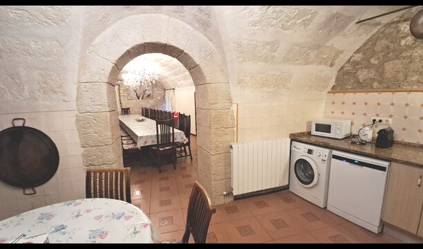Das Haus ist neben der großen Kirche der Stadt gelegen, und Sie betreten das Feiertaghaus direkt vom schönen Kirchenplatz. Wenn Sie in Masia de Las Flores, das eine Größe von 710 m2 hat, eintreten, treffen Sie ein schönes Wohnzimmer mit großen, bequemen Sofas und einem Flachschirm TV. Das Innere des Hauses ist sehr schön: Die gebogene Decke und die schönen, gewölbten Türöffnungen schaffen eine große, geräumige Atmosphäre. Hier auf dem Erdgeschoß, gibt es auch eine Küche, und anschließend einen langen Esstisch.