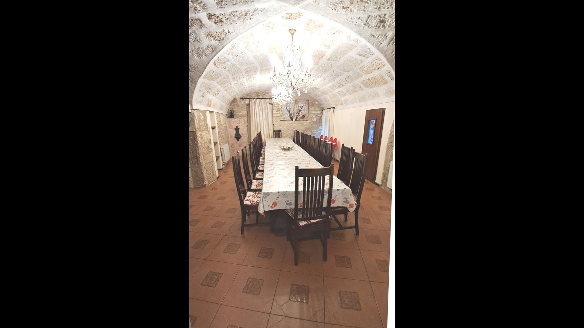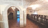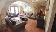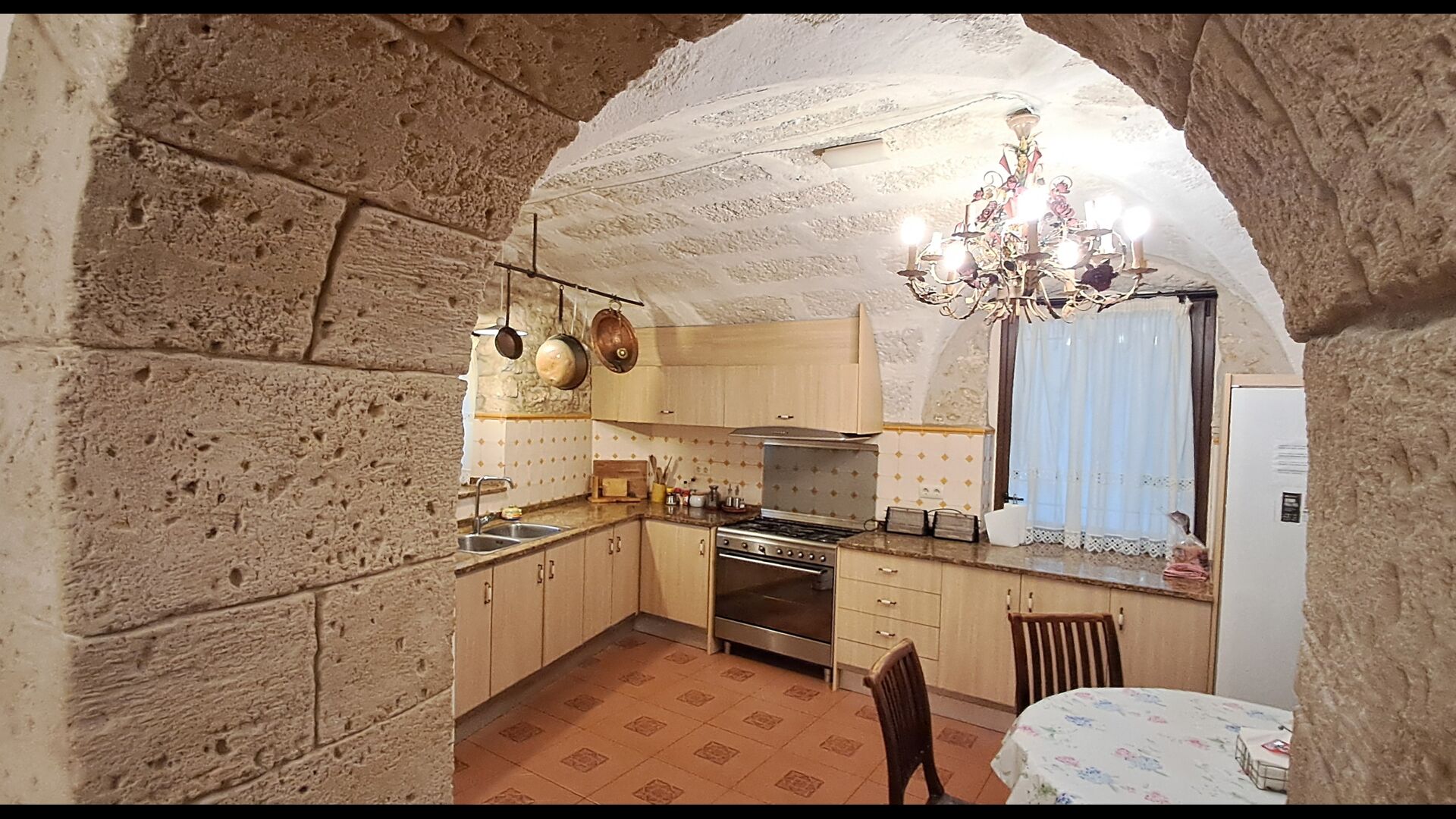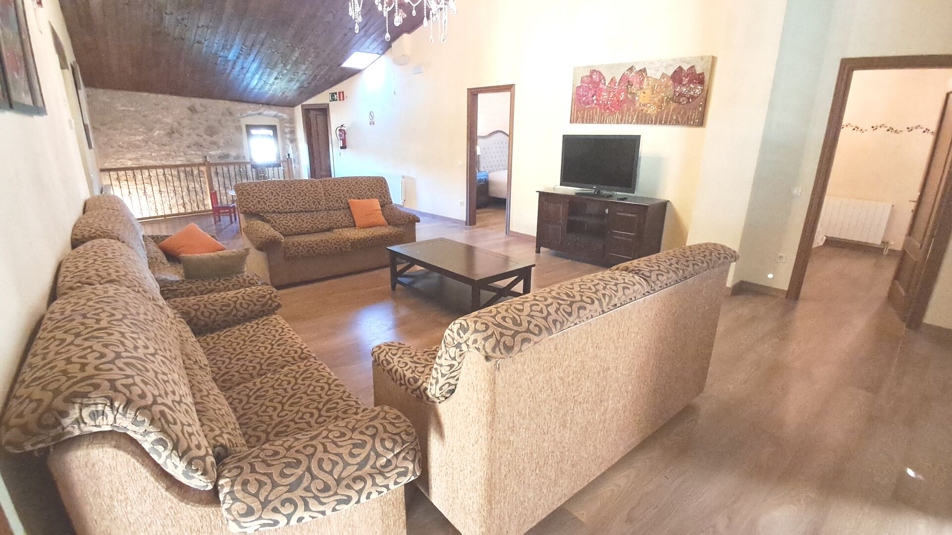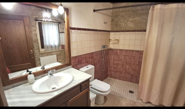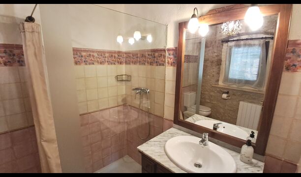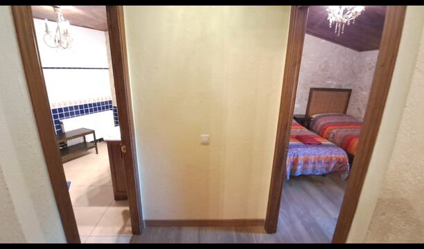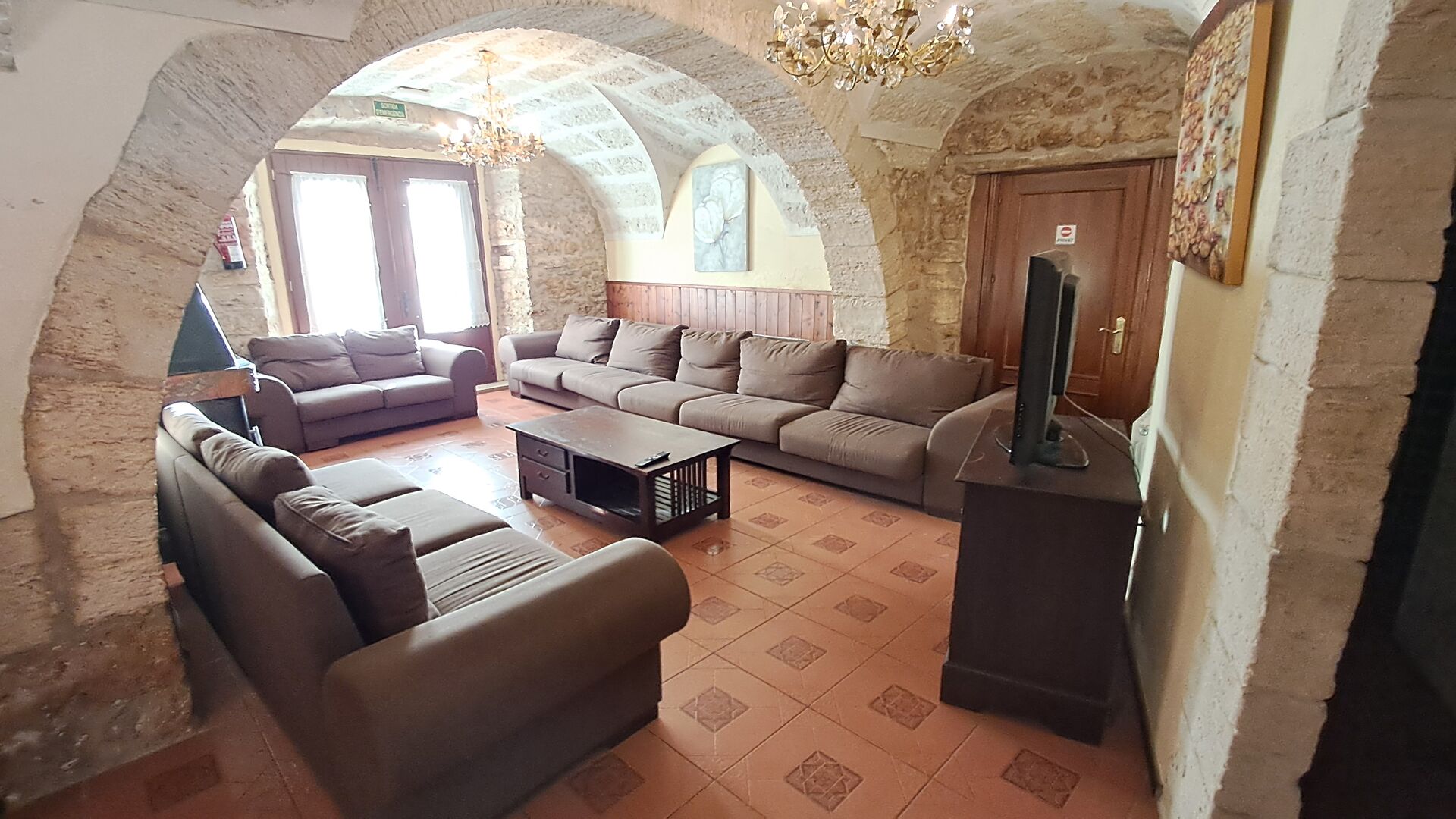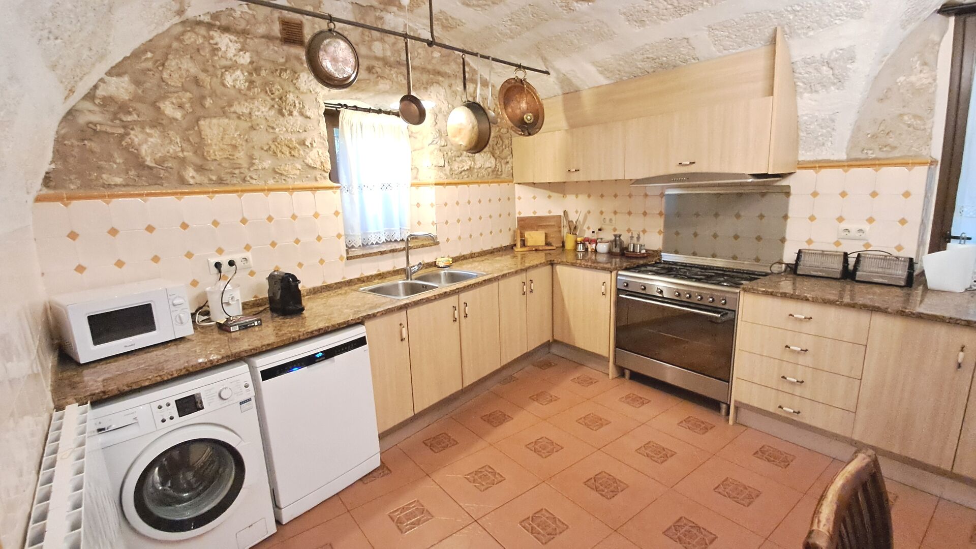 Das Haus ist neben der großen Kirche der Stadt gelegen, und Sie betreten das Feiertaghaus direkt vom schönen Kirchenplatz. Wenn Sie in Masia de Las Flores, das eine Größe von 710 m2 hat, eintreten, treffen Sie ein schönes Wohnzimmer mit großen, bequemen Sofas und einem Flachschirm TV. Das Innere des Hauses ist sehr schön: Die gebogene Decke und die schönen, gewölbten Türöffnungen schaffen eine große, geräumige Atmosphäre. Hier auf dem Erdgeschoß, gibt es auch eine Küche, und anschließend einen langen Esstisch.