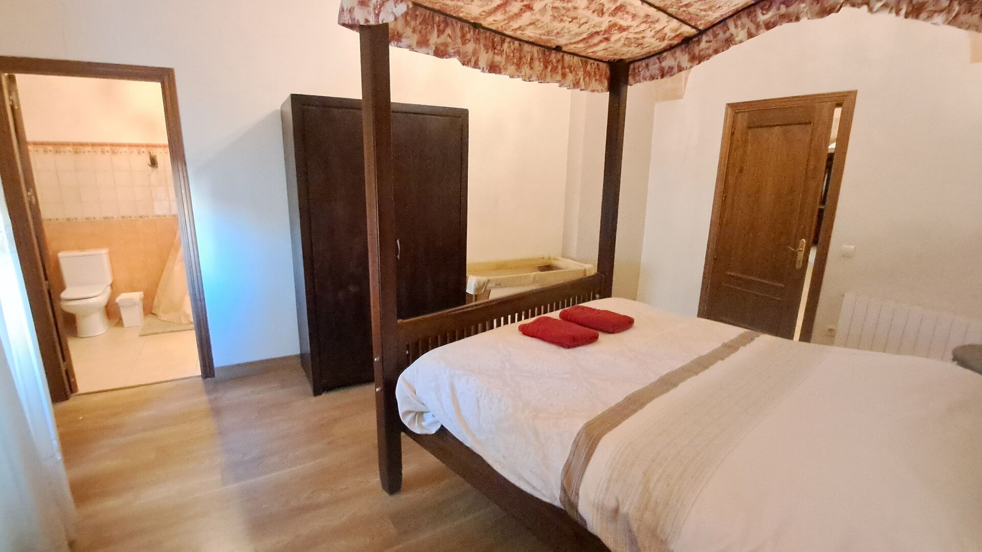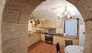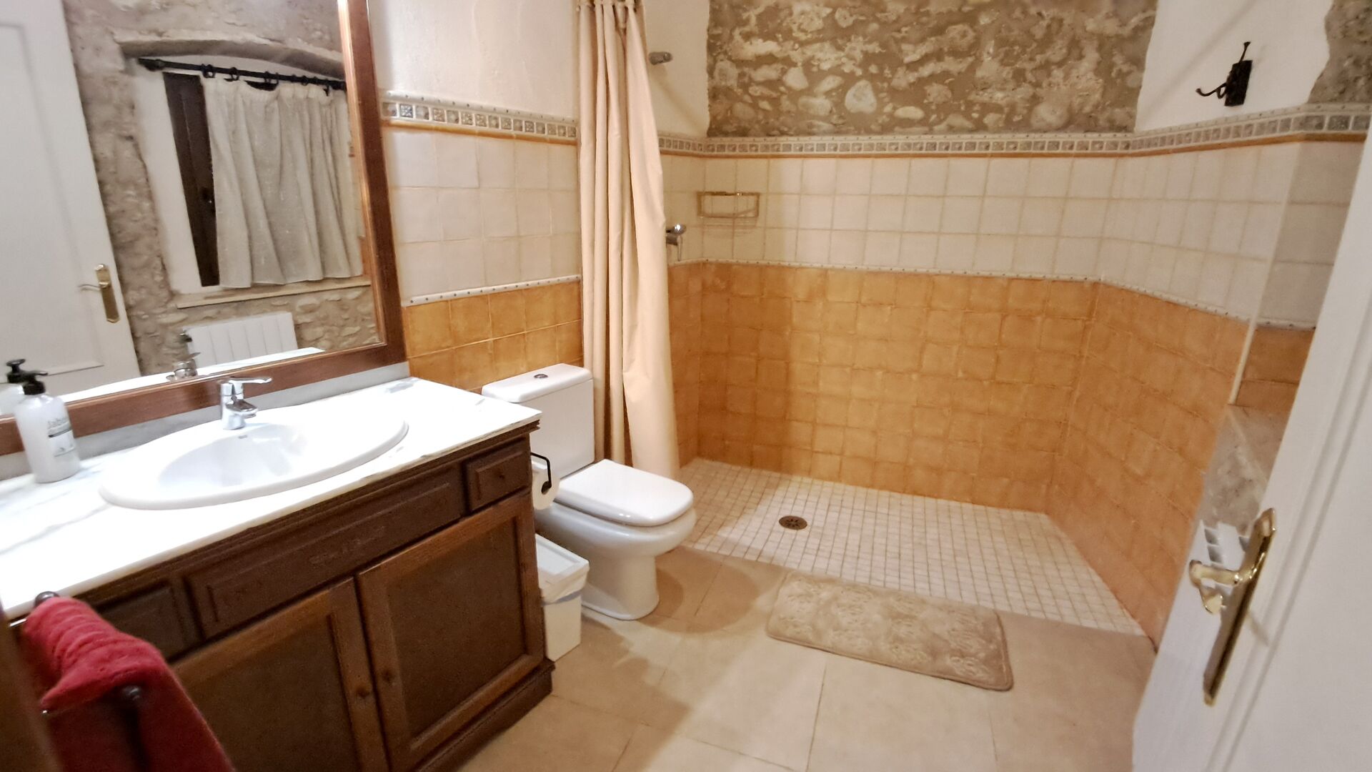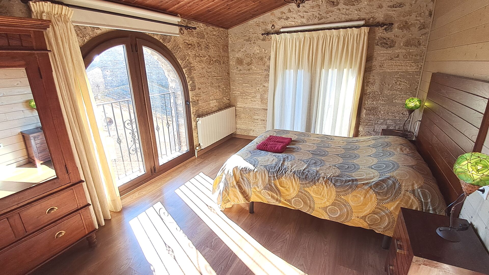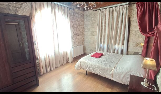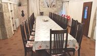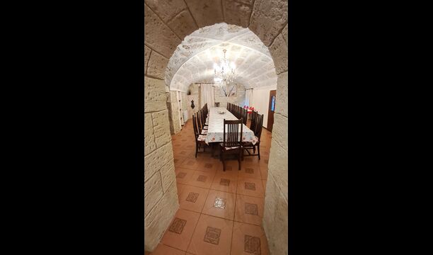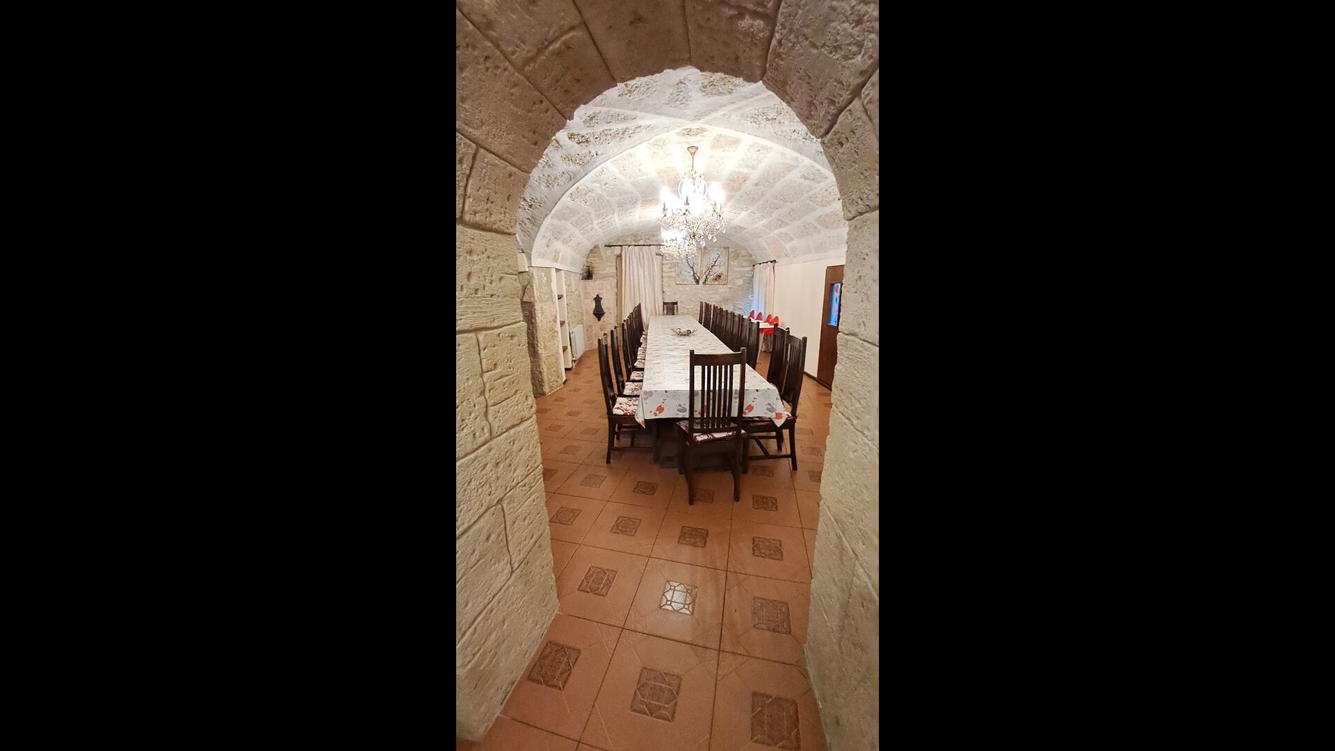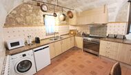 Das Haus ist neben der großen Kirche der Stadt gelegen, und Sie betreten das Feiertaghaus direkt vom schönen Kirchenplatz. Wenn Sie in Masia de Las Flores, das eine Größe von 710 m2 hat, eintreten, treffen Sie ein schönes Wohnzimmer mit großen, bequemen Sofas und einem Flachschirm TV. Das Innere des Hauses ist sehr schön: Die gebogene Decke und die schönen, gewölbten Türöffnungen schaffen eine große, geräumige Atmosphäre. Hier auf dem Erdgeschoß, gibt es auch eine Küche, und anschließend einen langen Esstisch.