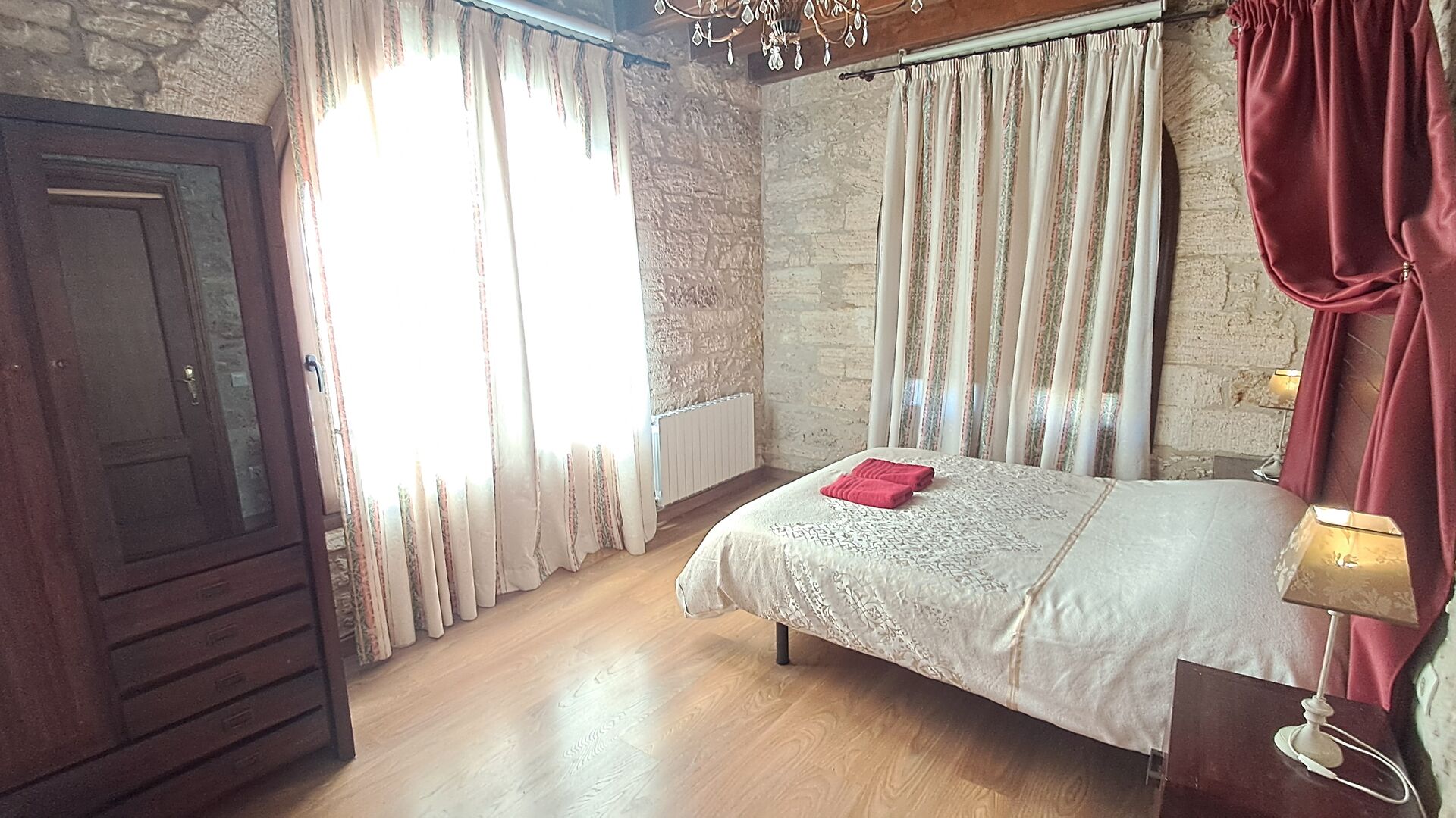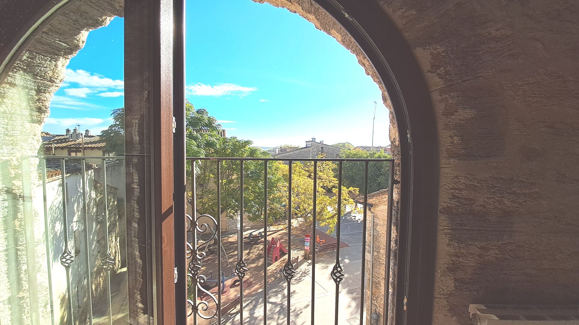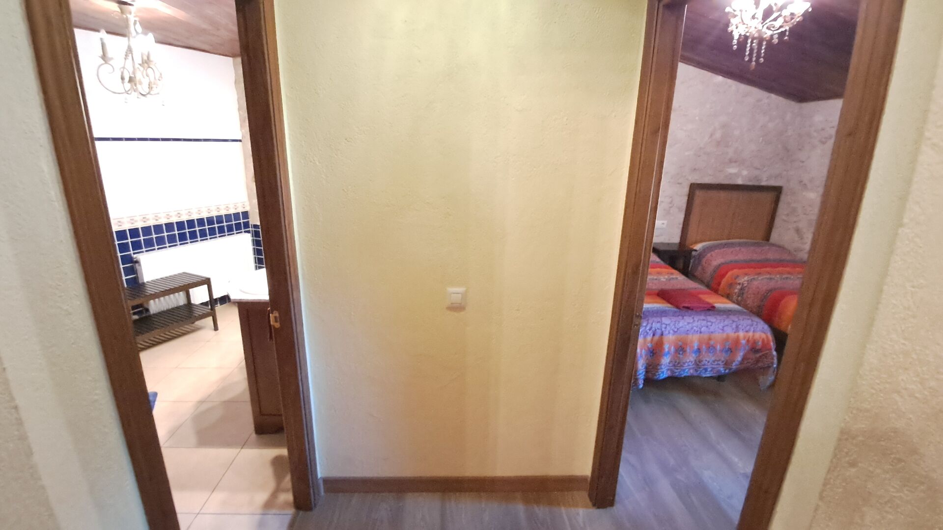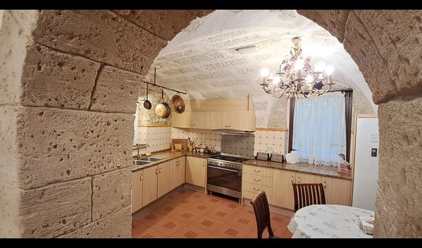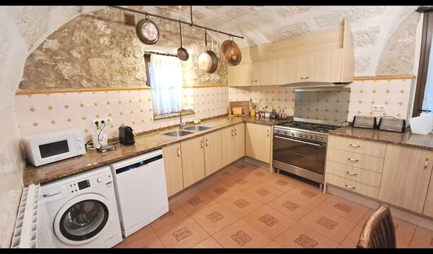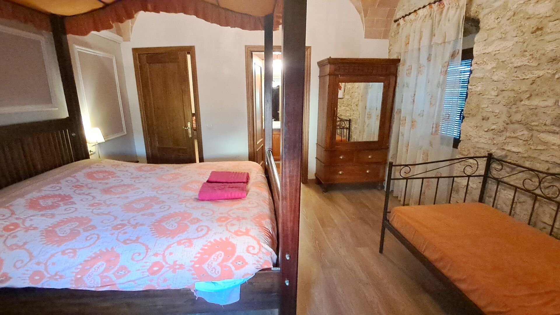 Das Haus ist neben der großen Kirche der Stadt gelegen, und Sie betreten das Feiertaghaus direkt vom schönen Kirchenplatz. Wenn Sie in Masia de Las Flores, das eine Größe von 710 m2 hat, eintreten, treffen Sie ein schönes Wohnzimmer mit großen, bequemen Sofas und einem Flachschirm TV. Das Innere des Hauses ist sehr schön: Die gebogene Decke und die schönen, gewölbten Türöffnungen schaffen eine große, geräumige Atmosphäre. Hier auf dem Erdgeschoß, gibt es auch eine Küche, und anschließend einen langen Esstisch.