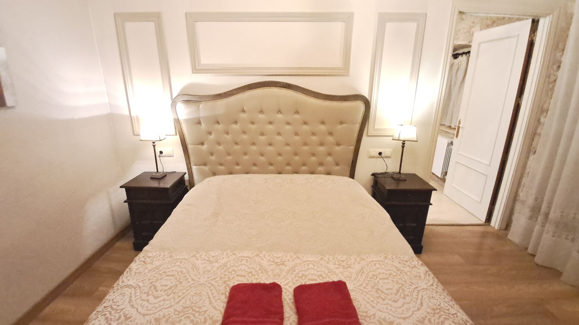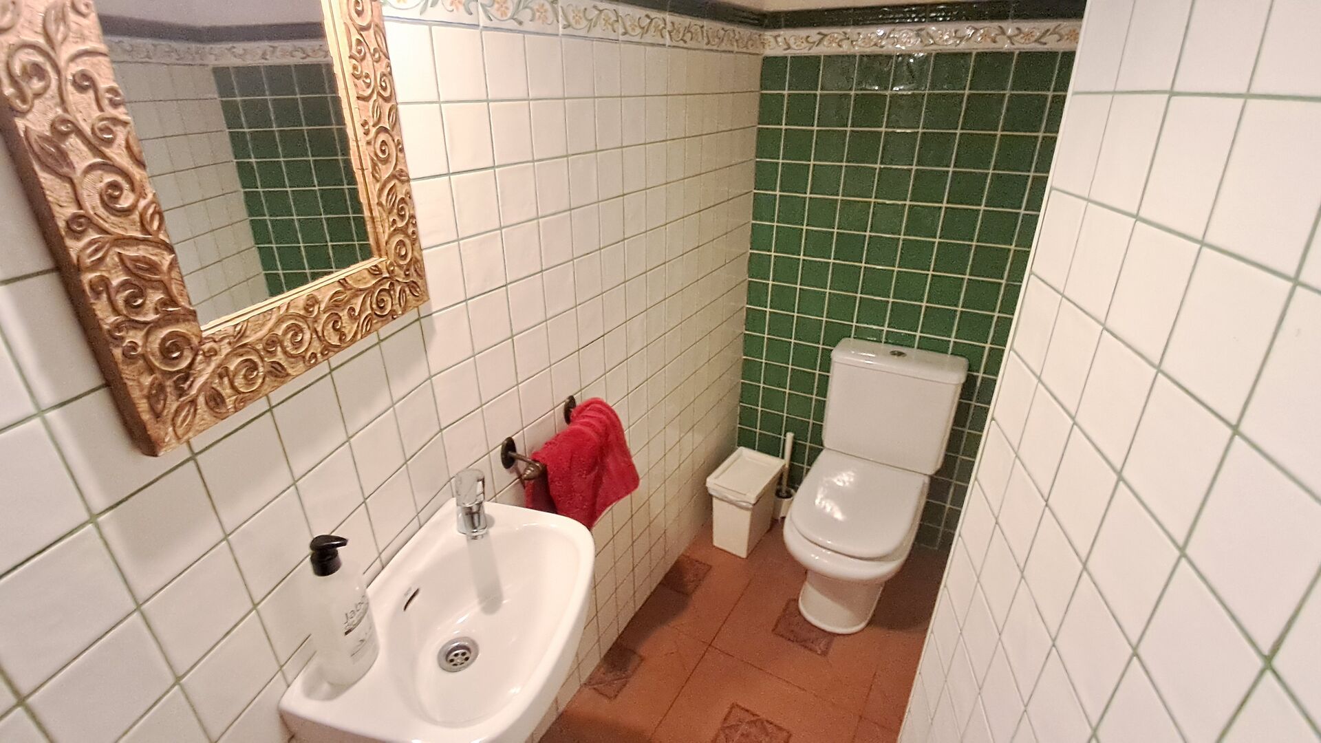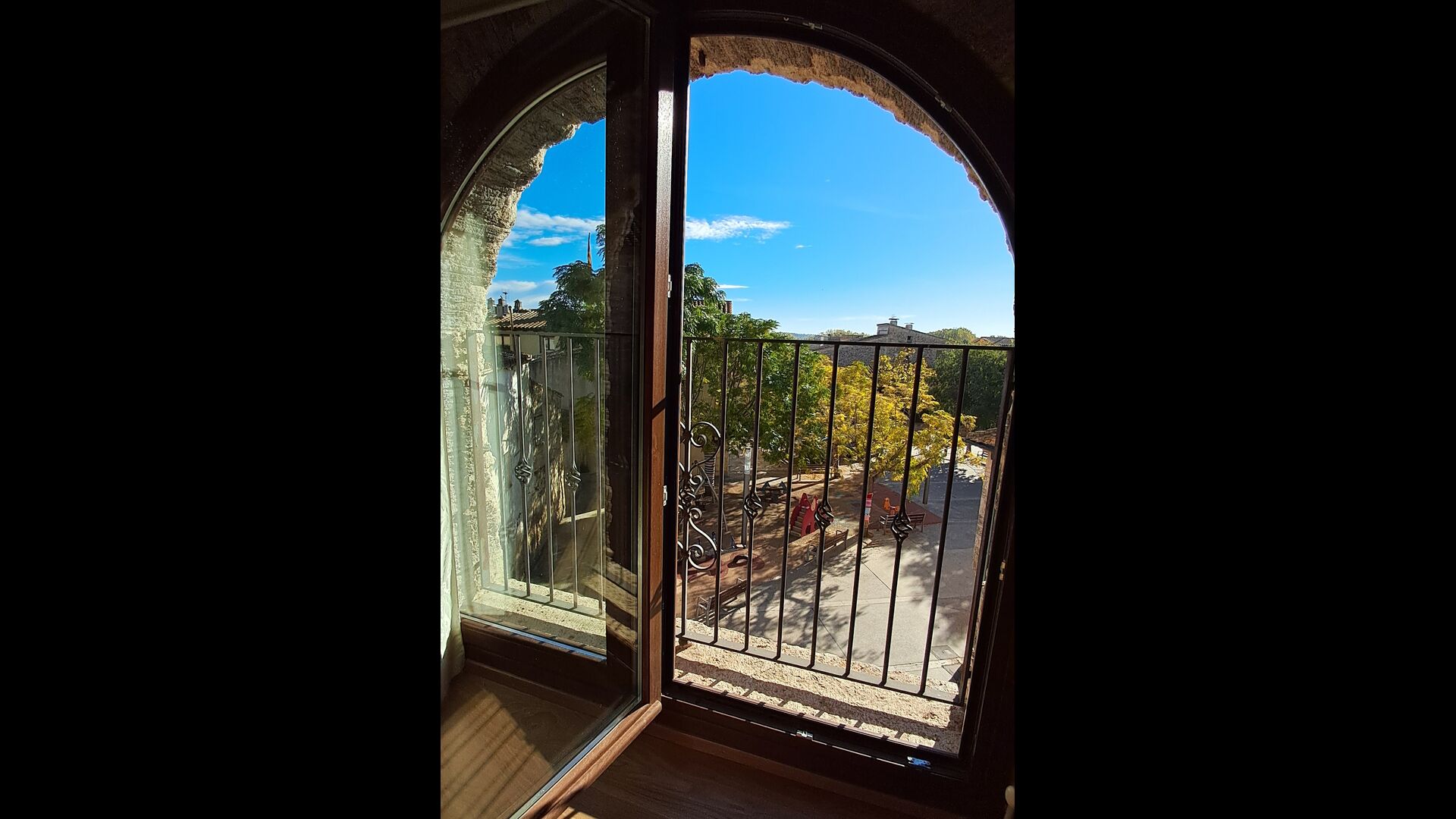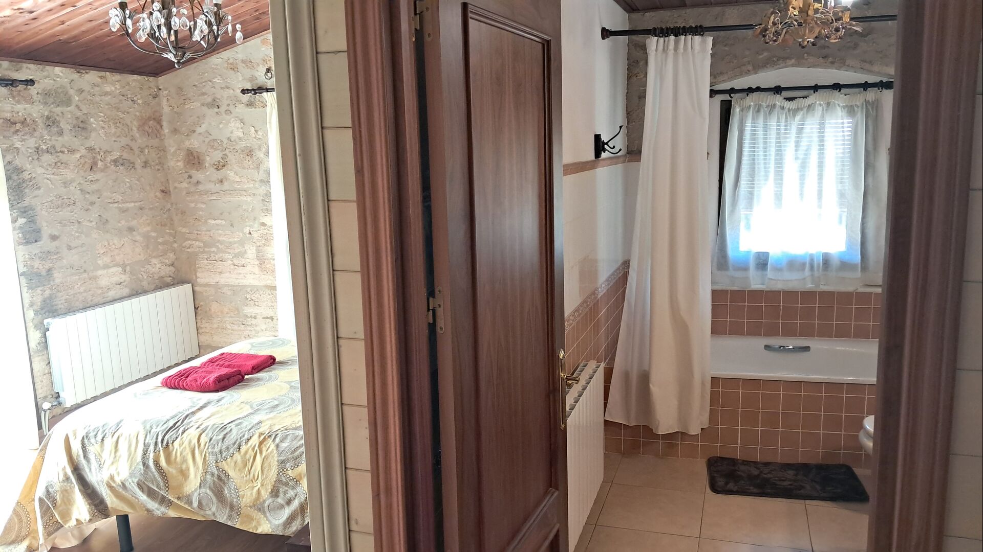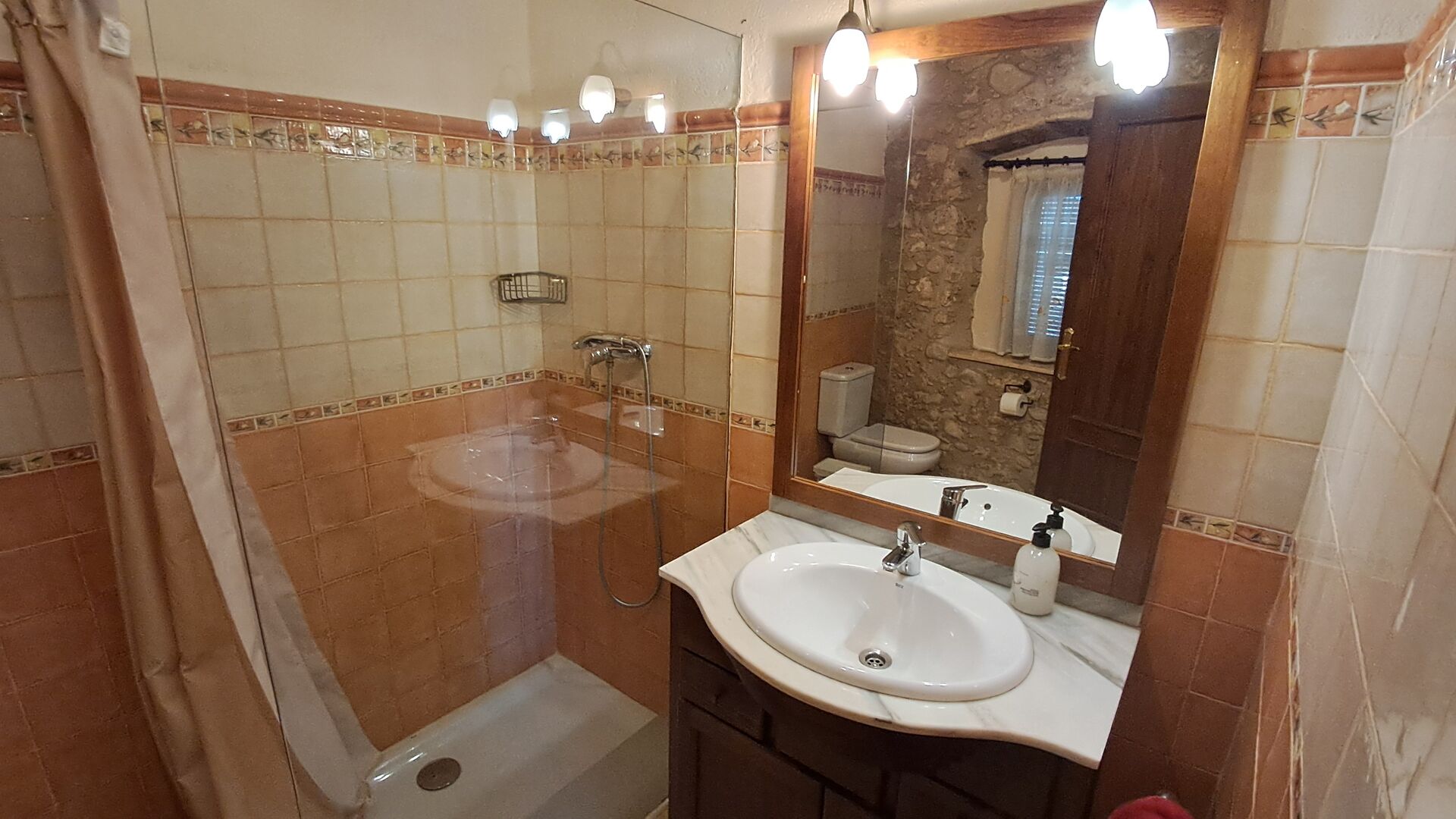 Das Haus ist neben der großen Kirche der Stadt gelegen, und Sie betreten das Feiertaghaus direkt vom schönen Kirchenplatz. Wenn Sie in Masia de Las Flores, das eine Größe von 710 m2 hat, eintreten, treffen Sie ein schönes Wohnzimmer mit großen, bequemen Sofas und einem Flachschirm TV. Das Innere des Hauses ist sehr schön: Die gebogene Decke und die schönen, gewölbten Türöffnungen schaffen eine große, geräumige Atmosphäre. Hier auf dem Erdgeschoß, gibt es auch eine Küche, und anschließend einen langen Esstisch.